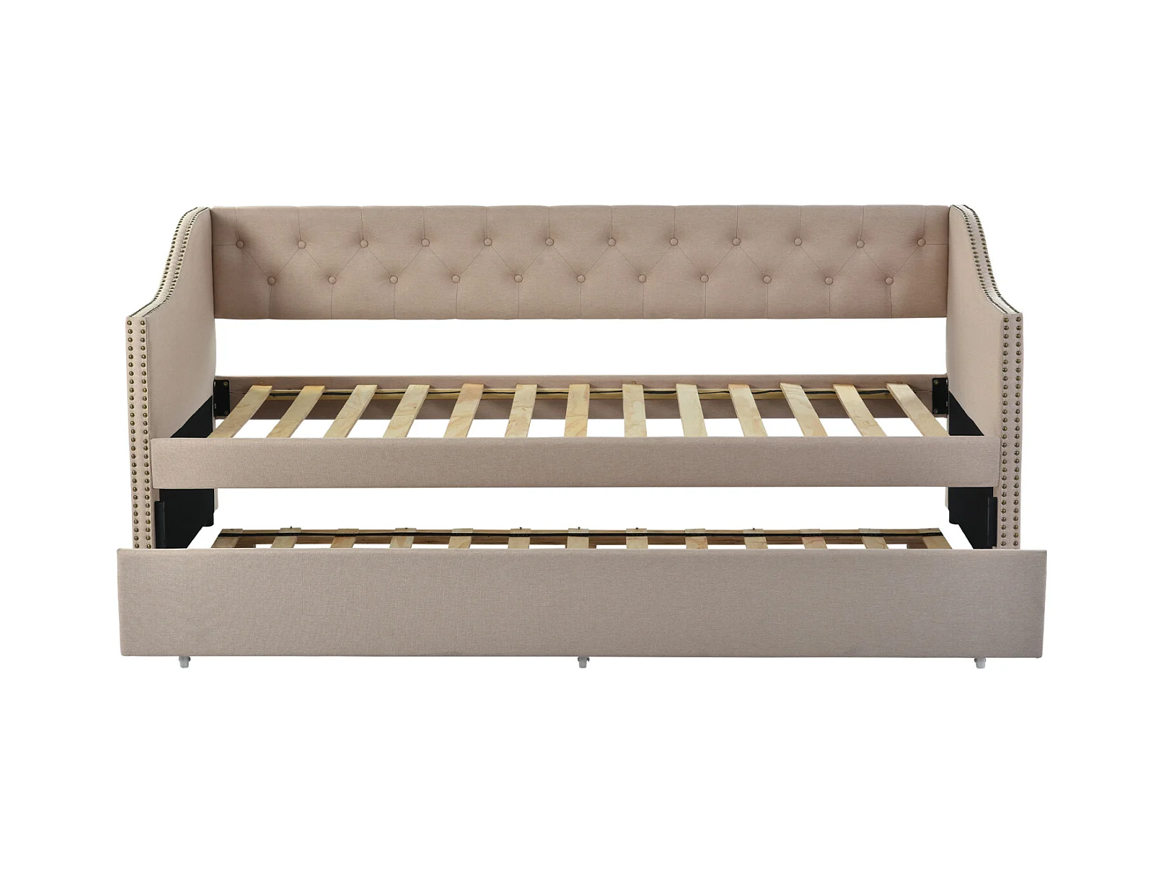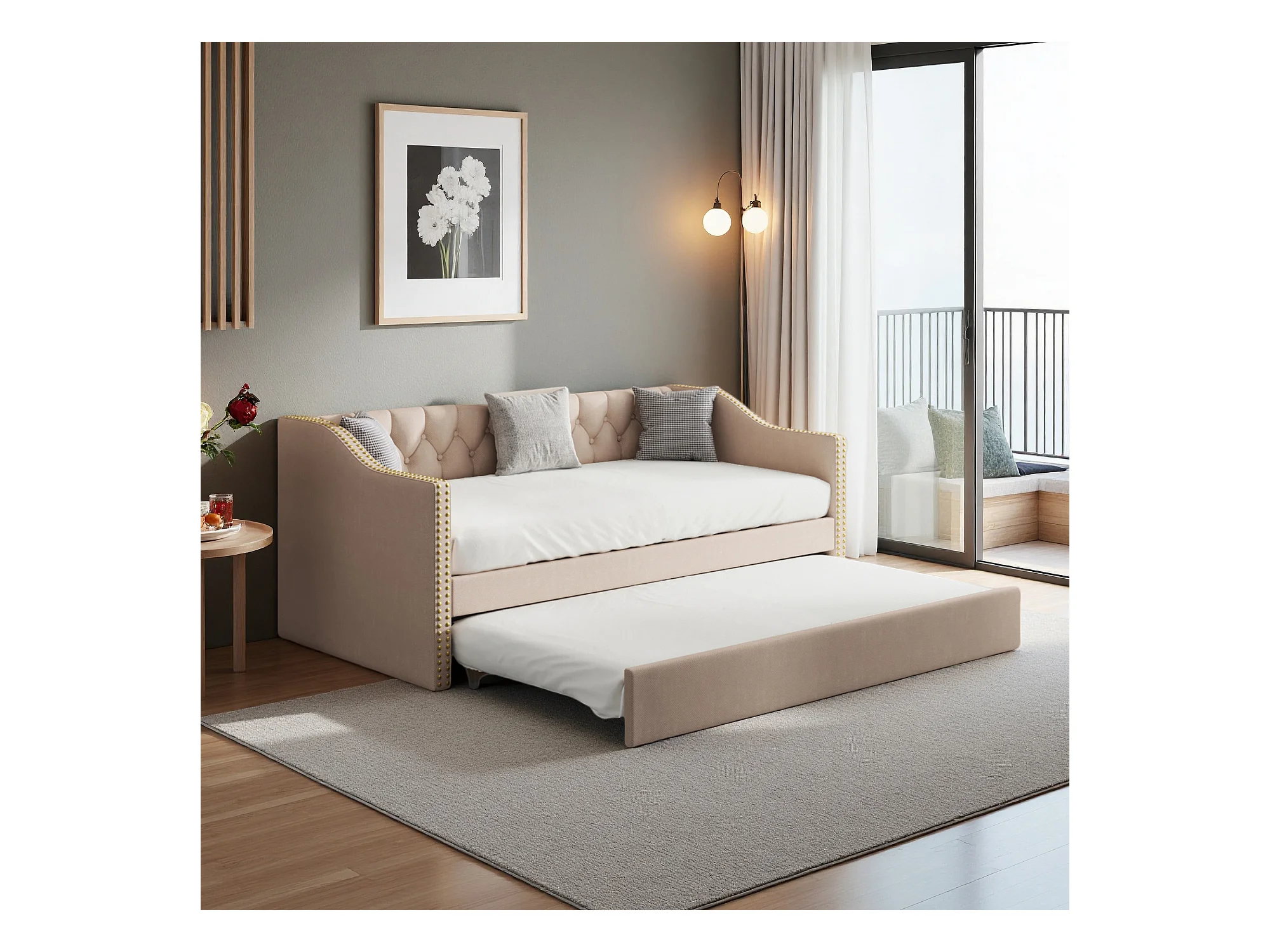 Lit canapé 90x200 cm avec LED et USB - lit adulte 90x200 cm gigogne - cadre de lit double 90x200 cm avec sommier à lattes - tissu en lin - beige