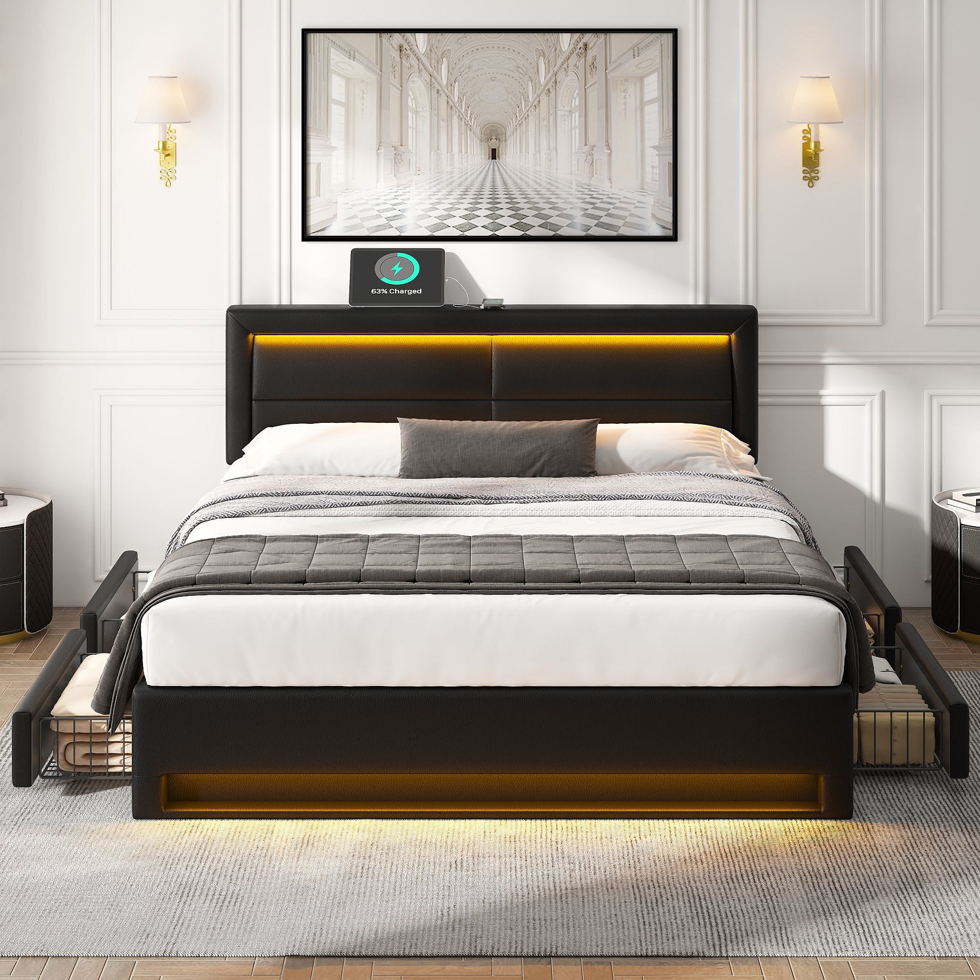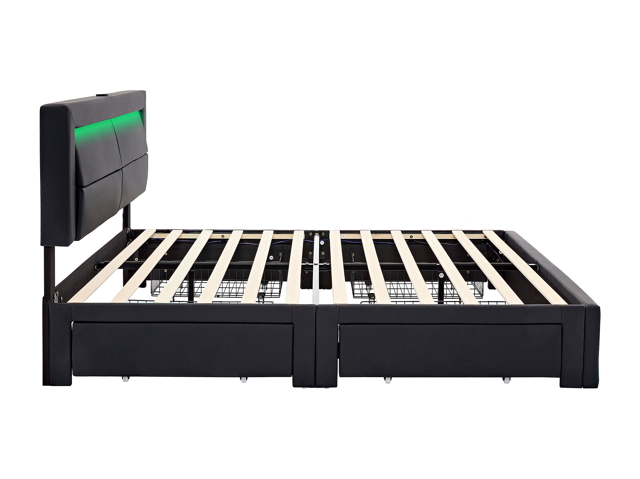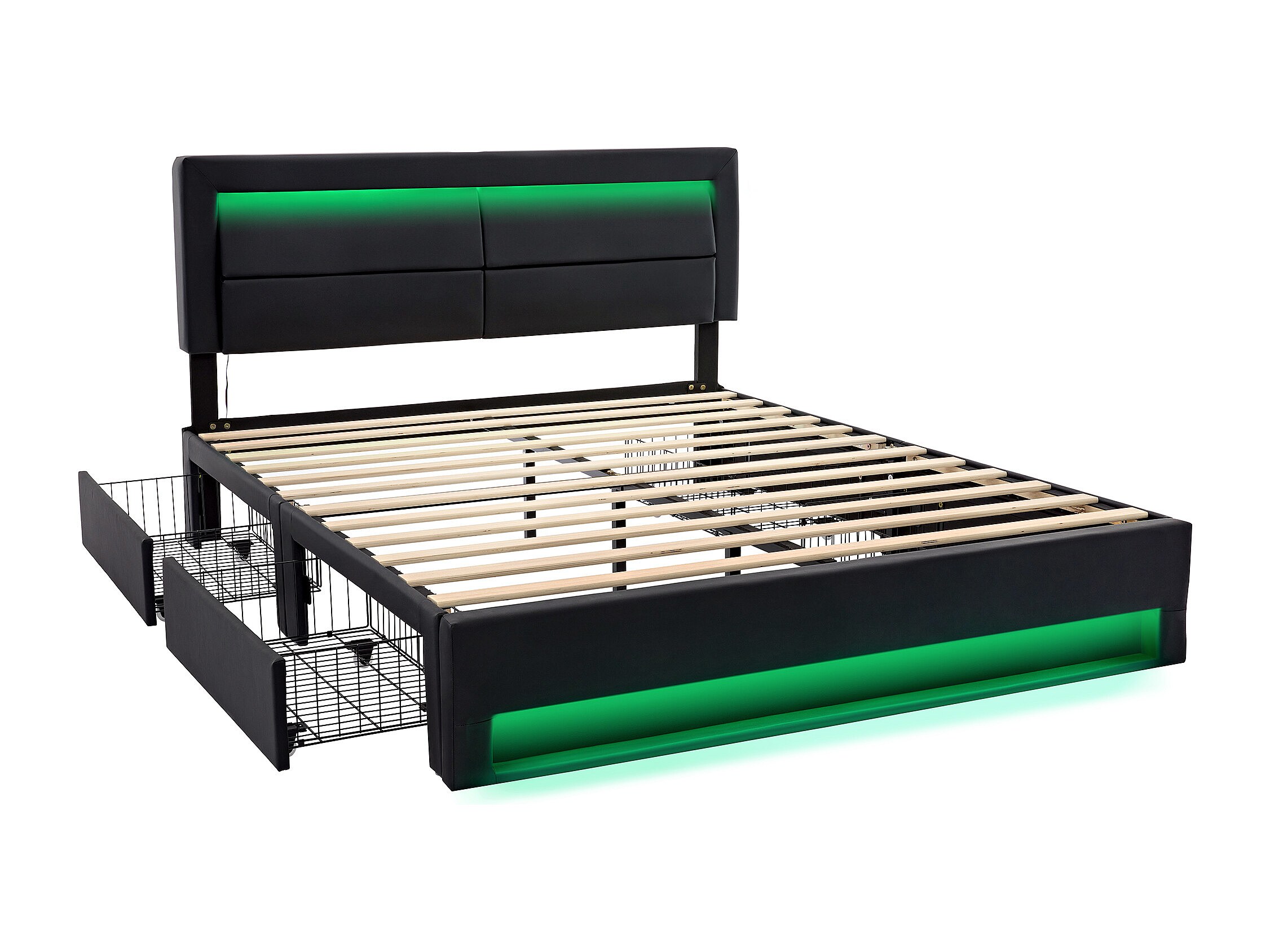 Lit capitonné 140 x 190 cm avec ports USB, éclairage LED et 4 tiroirs de rangement en PU noir