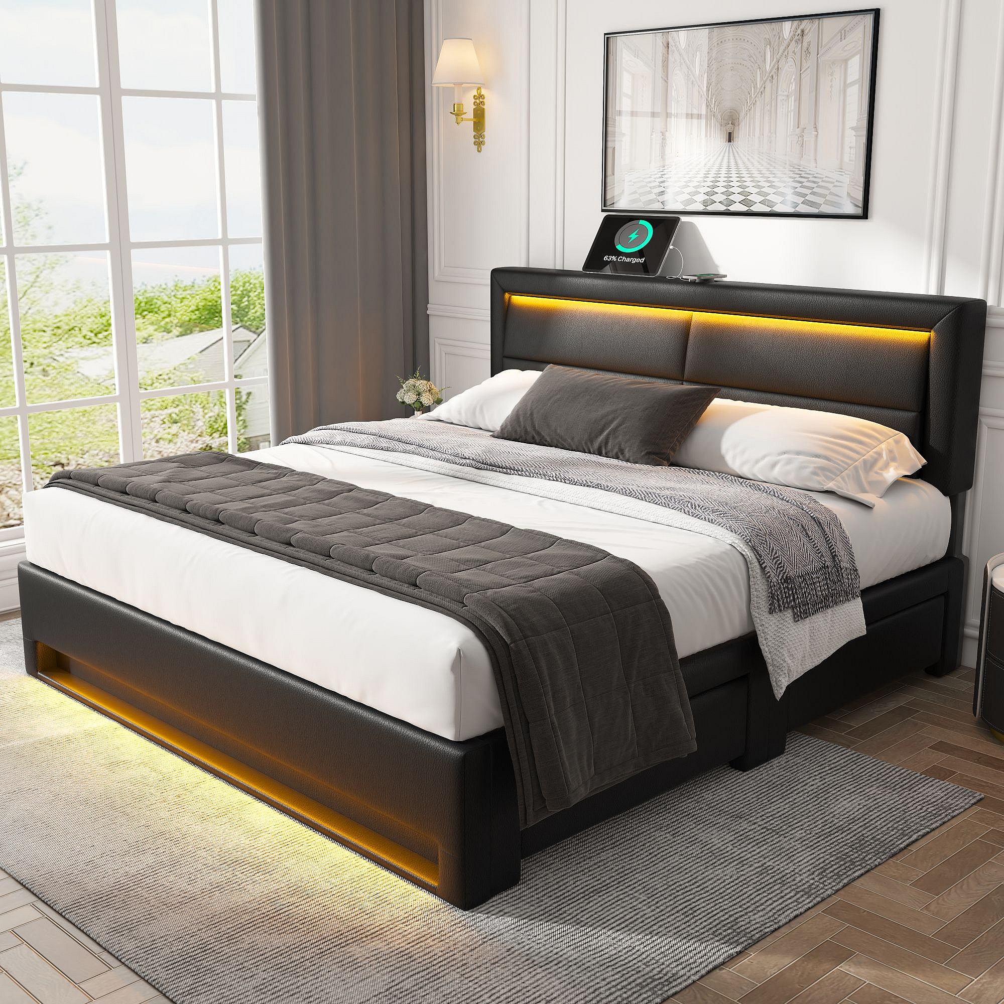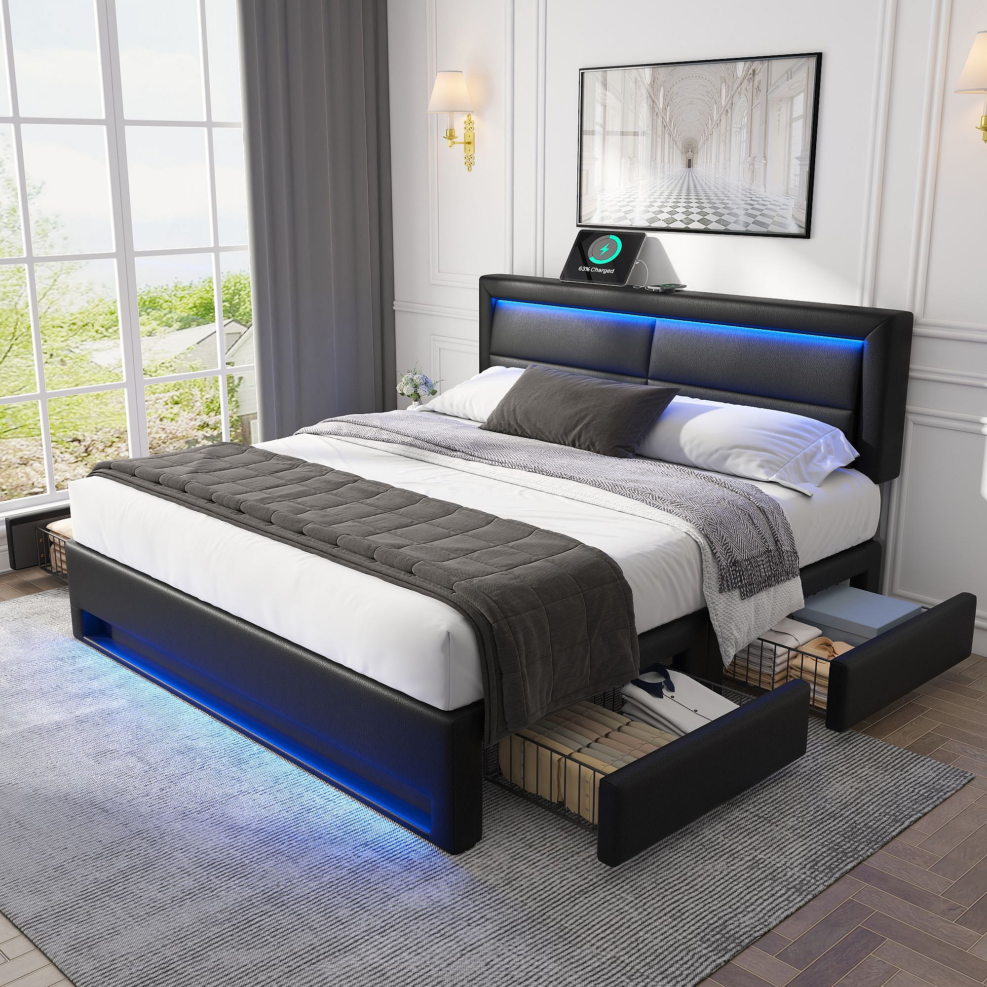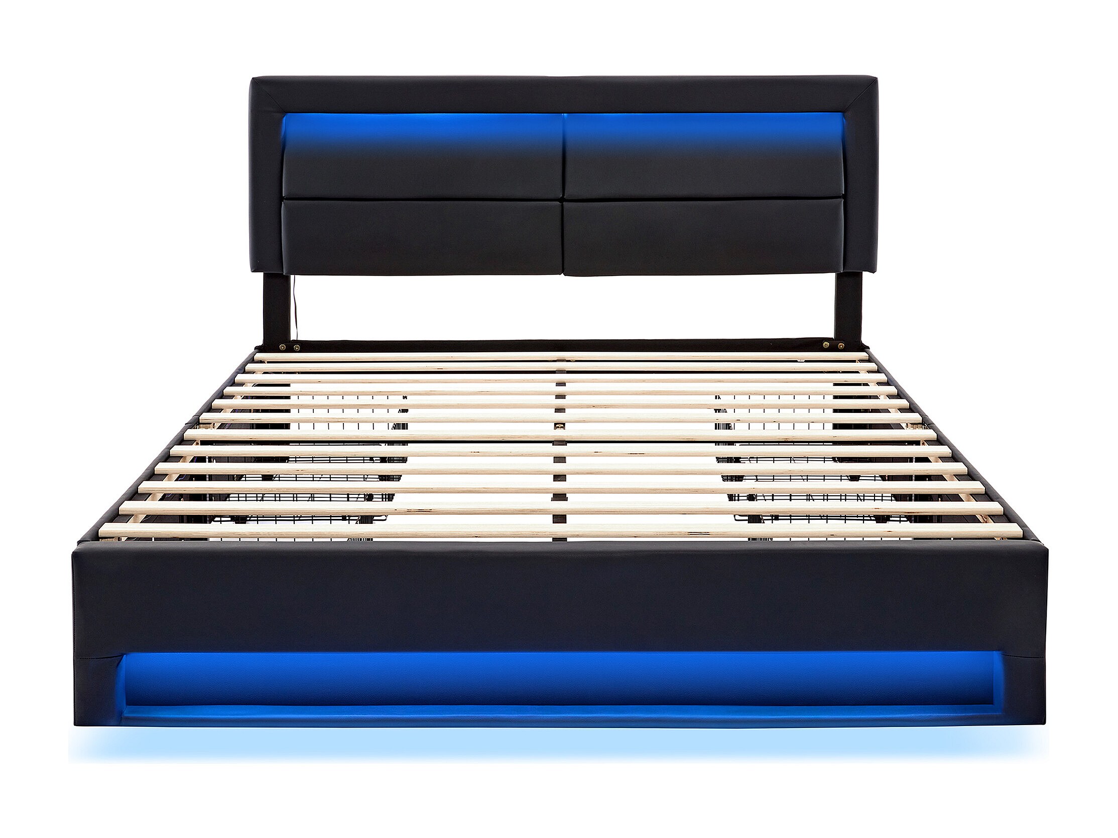 Lit capitonné 140 x 190 cm avec ports USB, éclairage LED et 4 tiroirs de rangement en PU noir