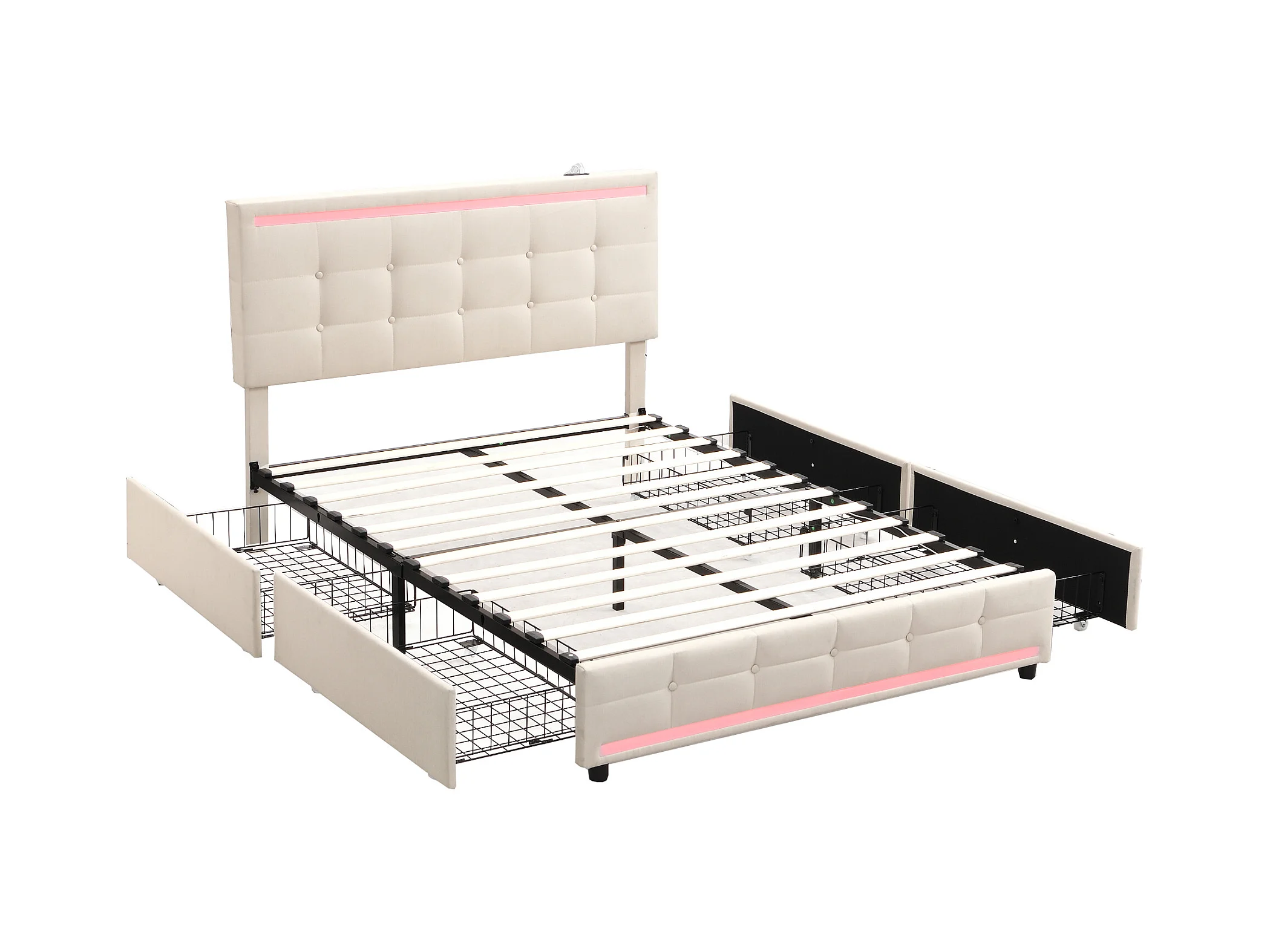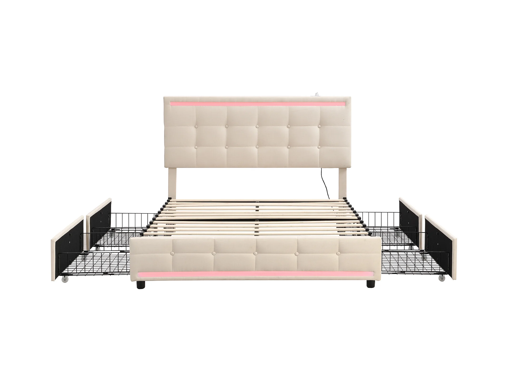 Lit adulte 140x200 cm - Lit double avec éclairage LED et recharge USB - 4 tiroirs - lin beige - sans matelas