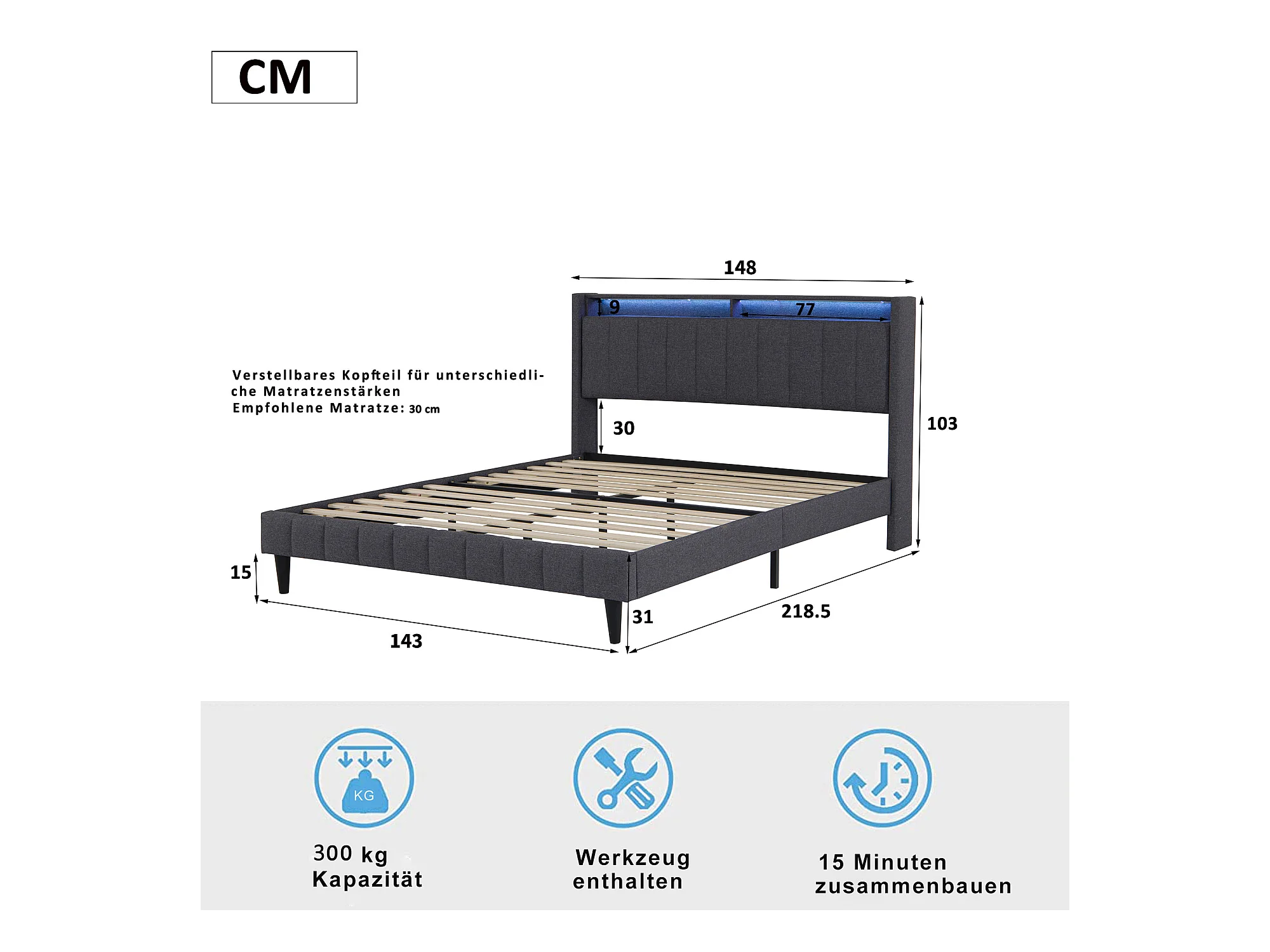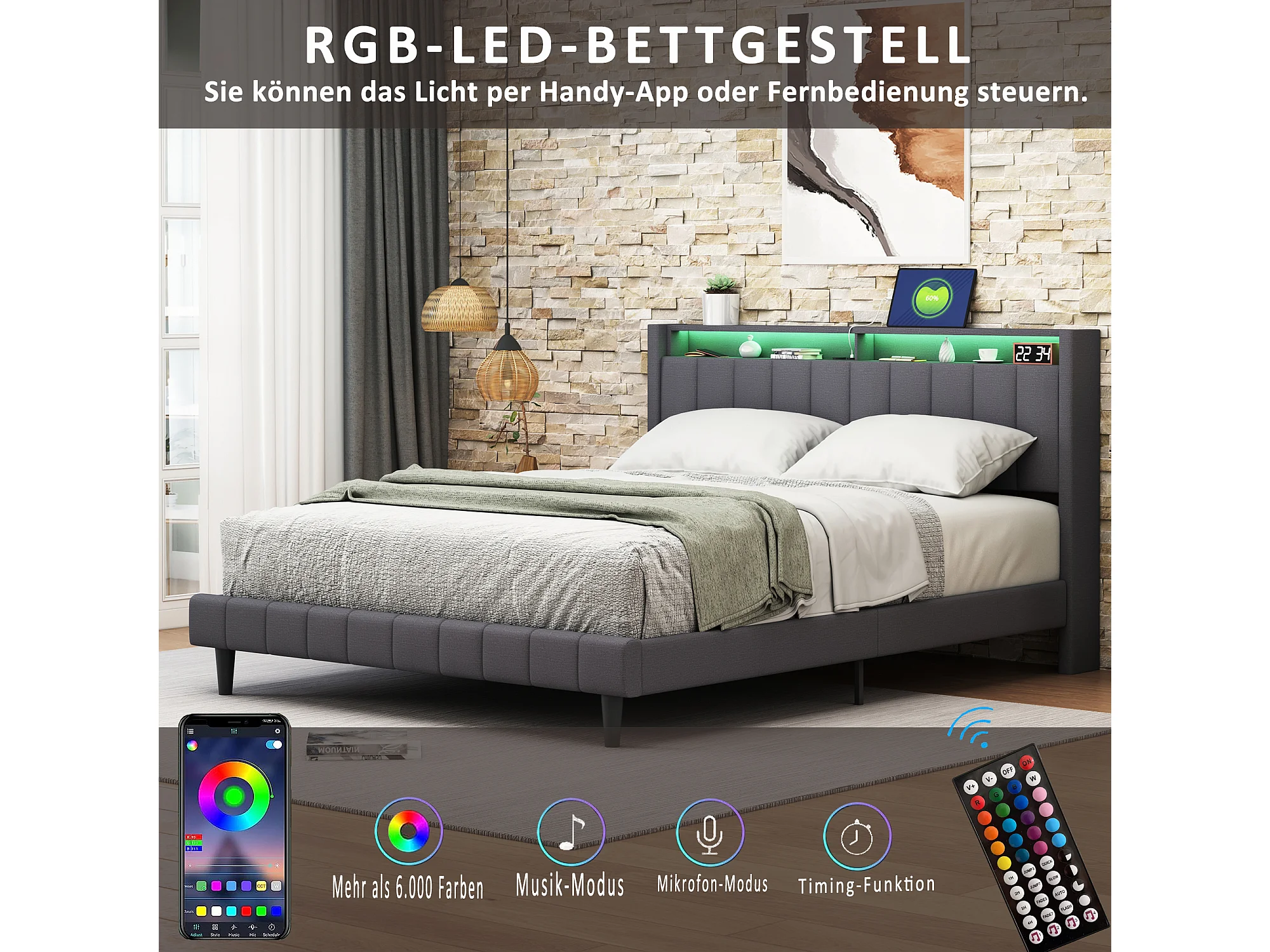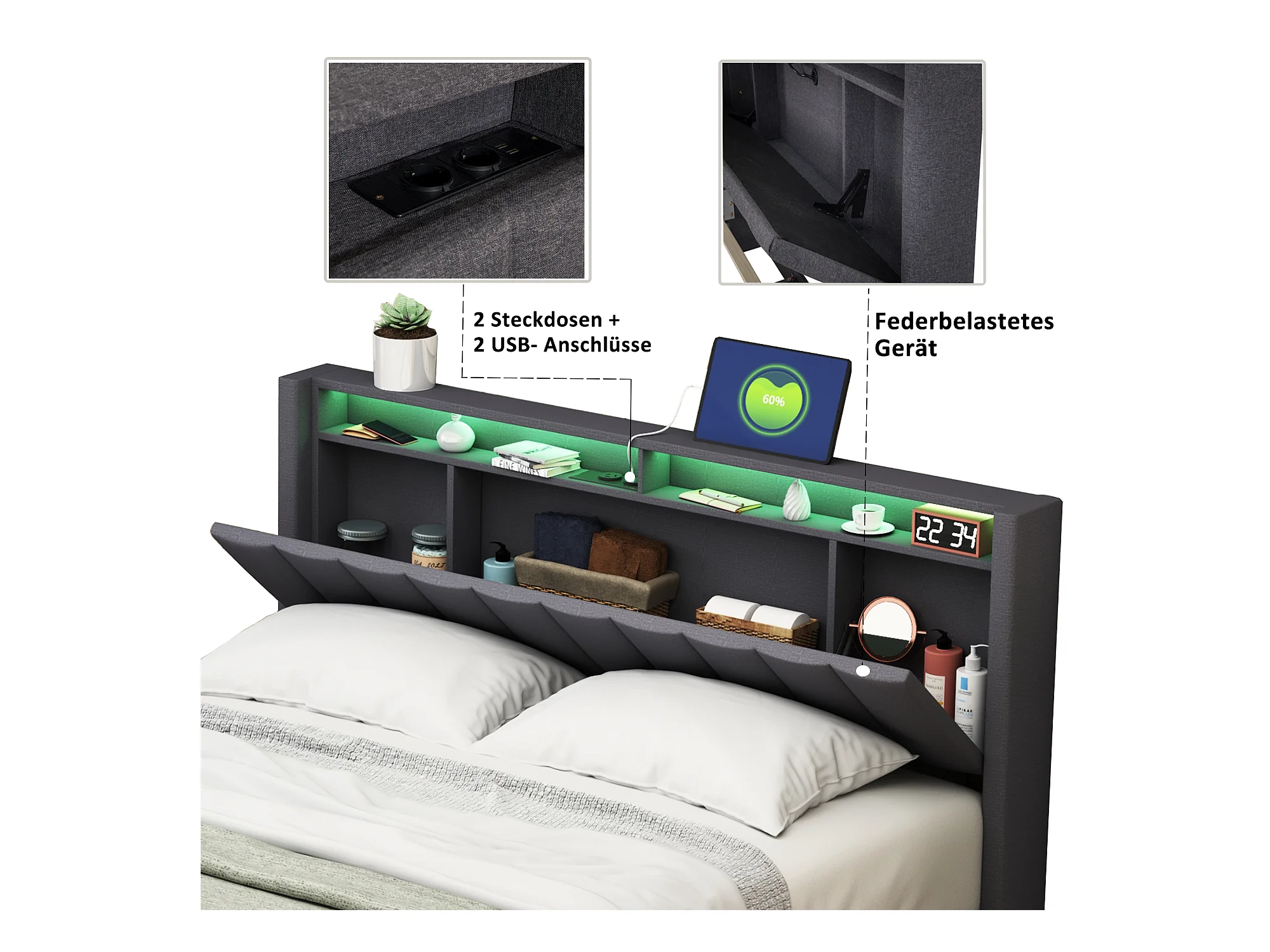Lit capitonné 140x200 cm - Lit double avec éclairage LED et USB - Tête de lit avec rangement - Gris - Tissu lin