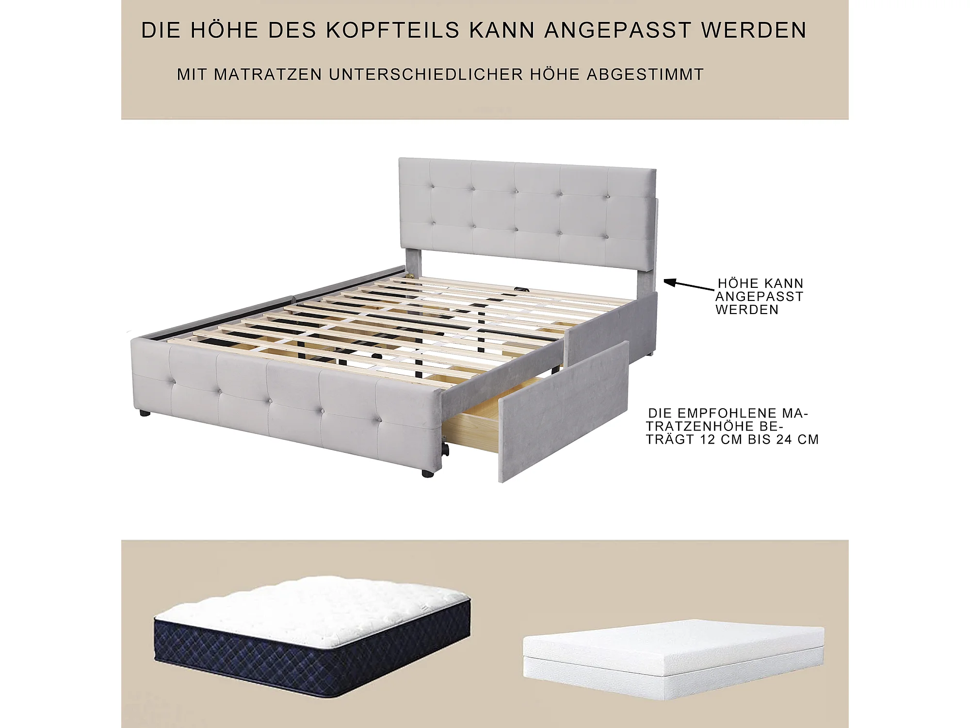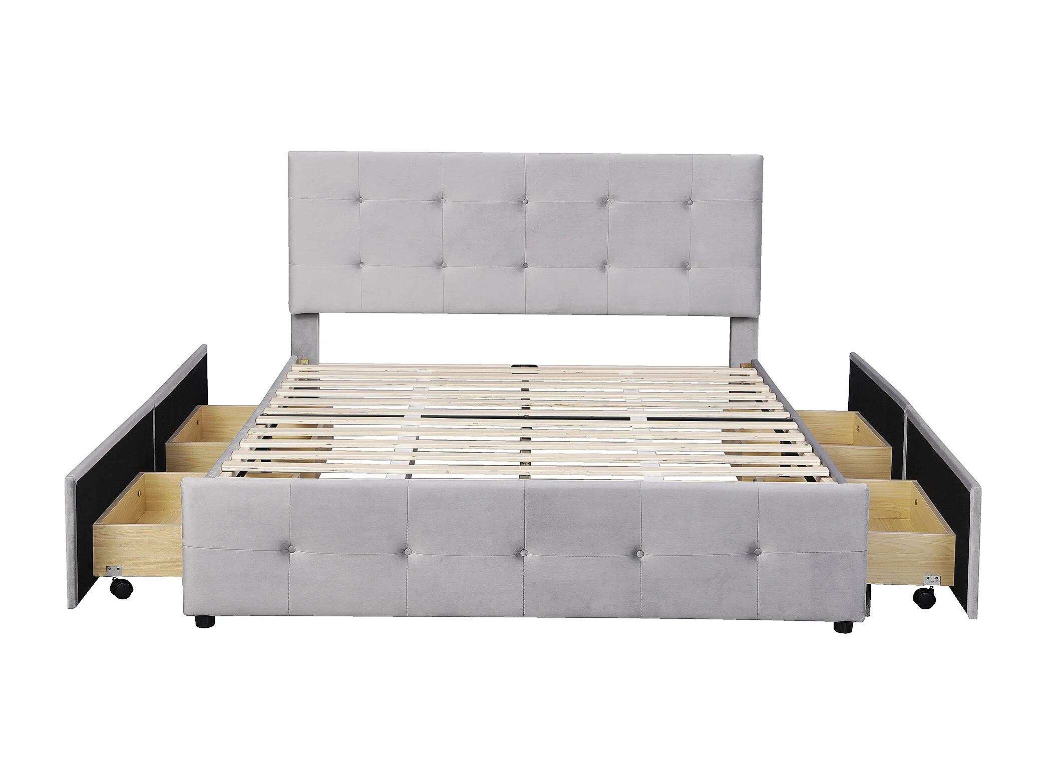 Lit capitonné 140x200 cm - Lit enfant 4 tiroirs - Lit double - Gris - Tissu velours