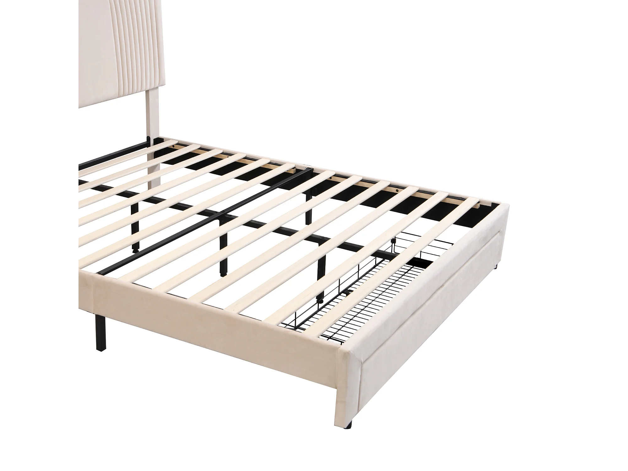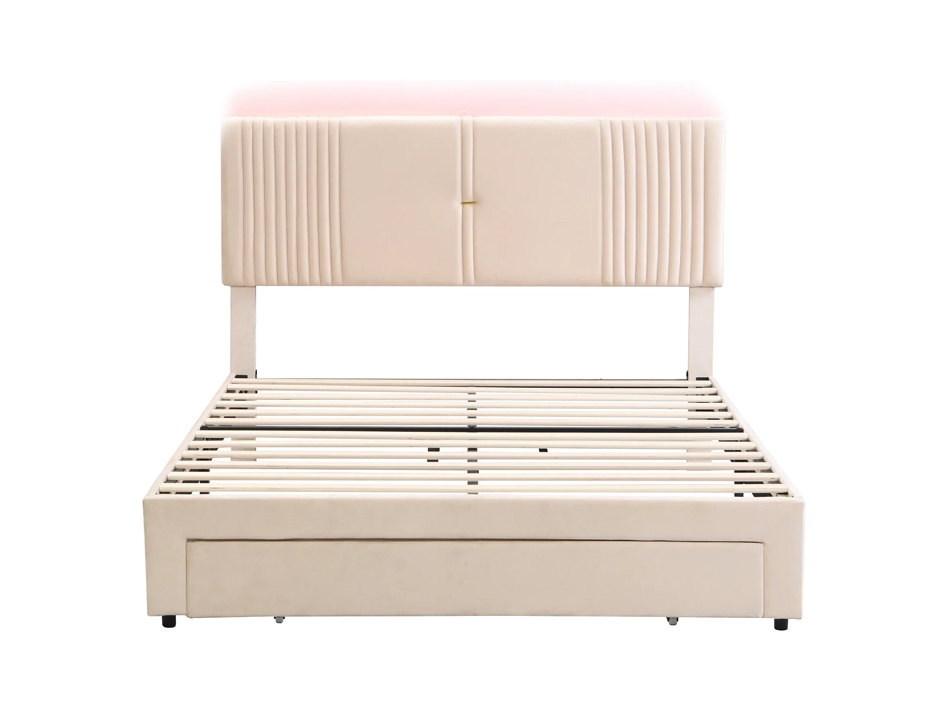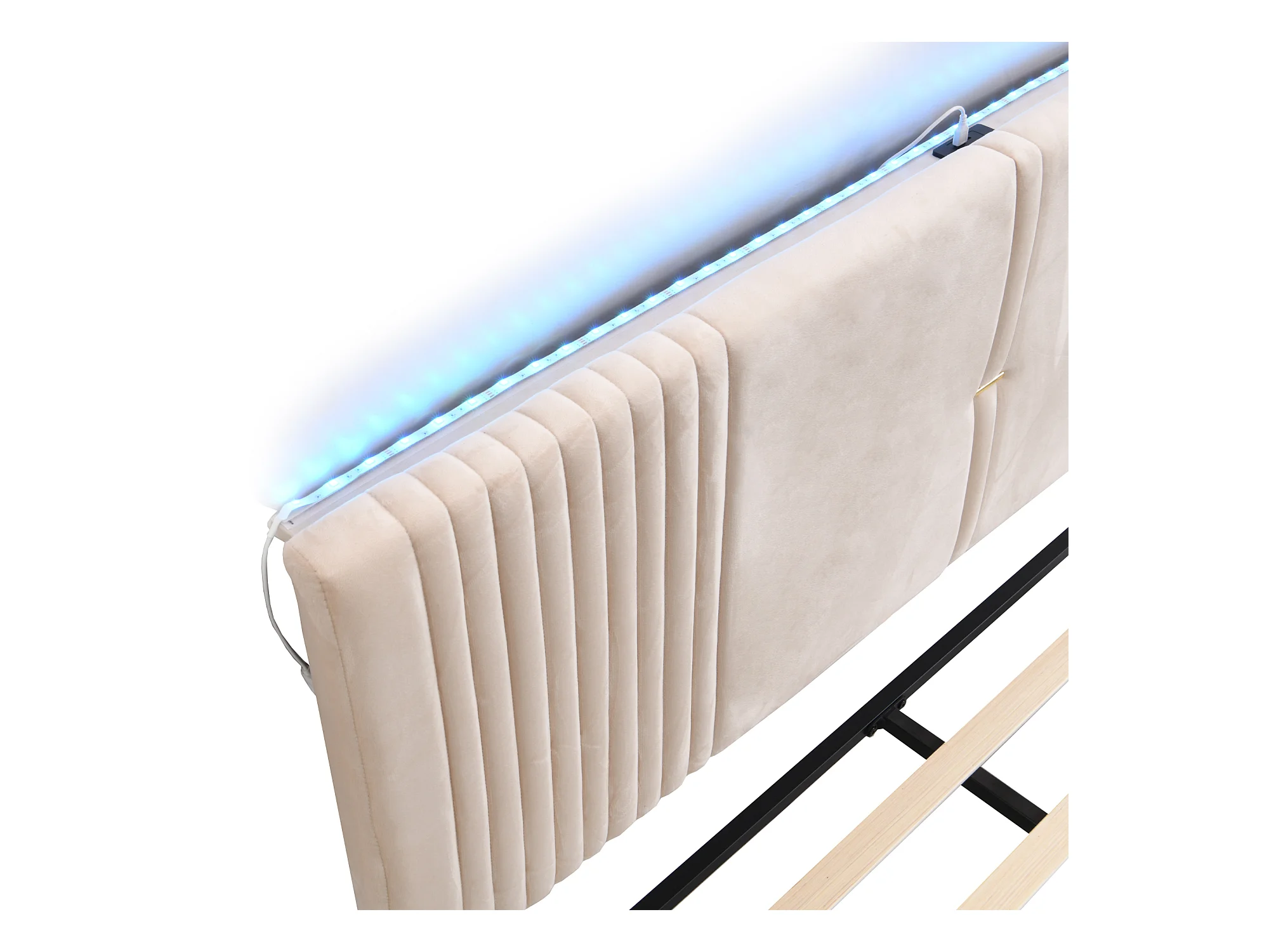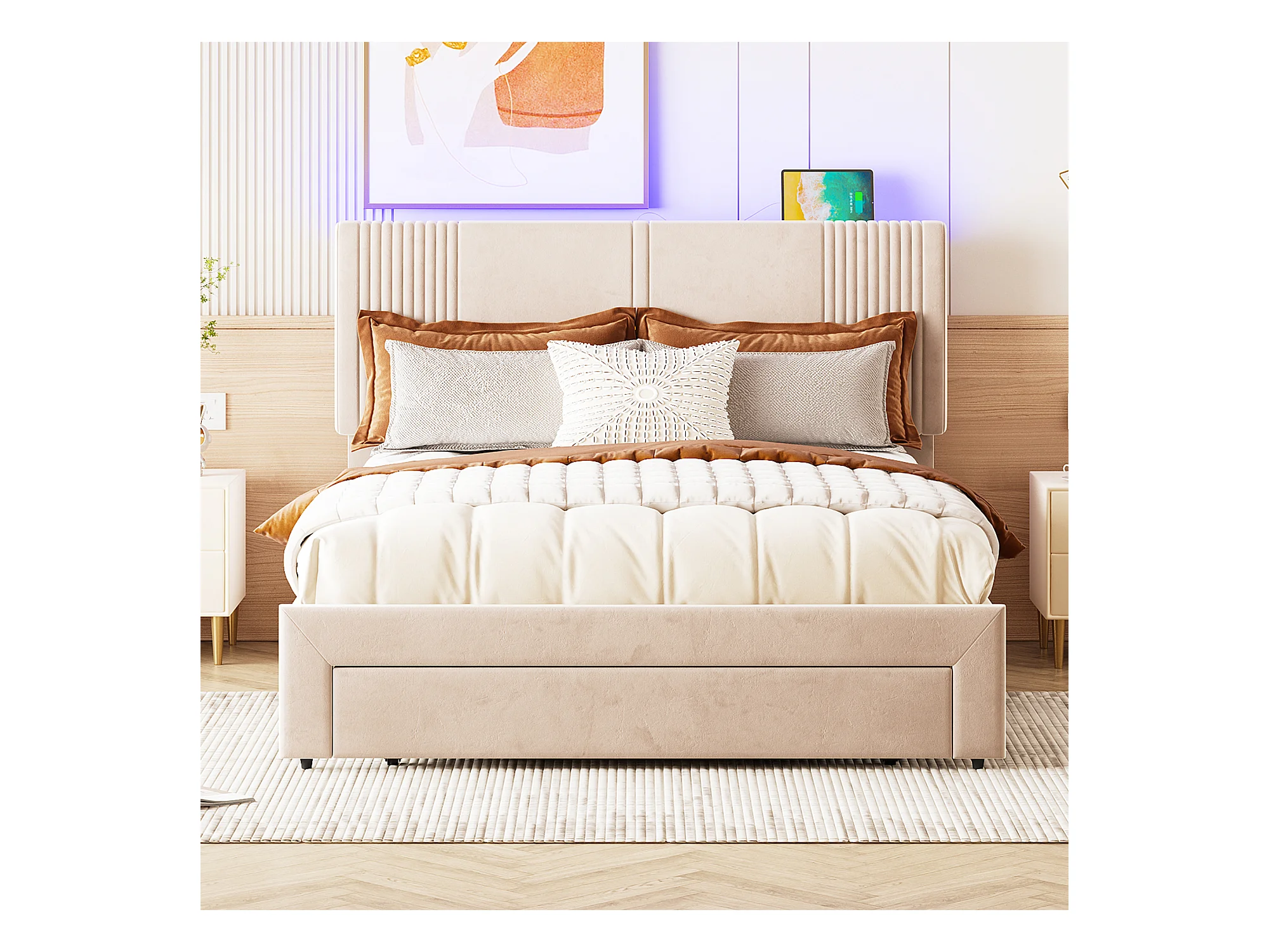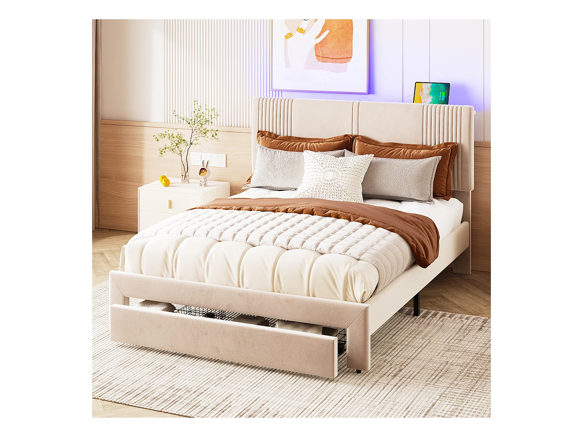 Lit double 140x200 cm - velours beige - lit adulte avec port USB et bande lumineuse - tiroir de rangement