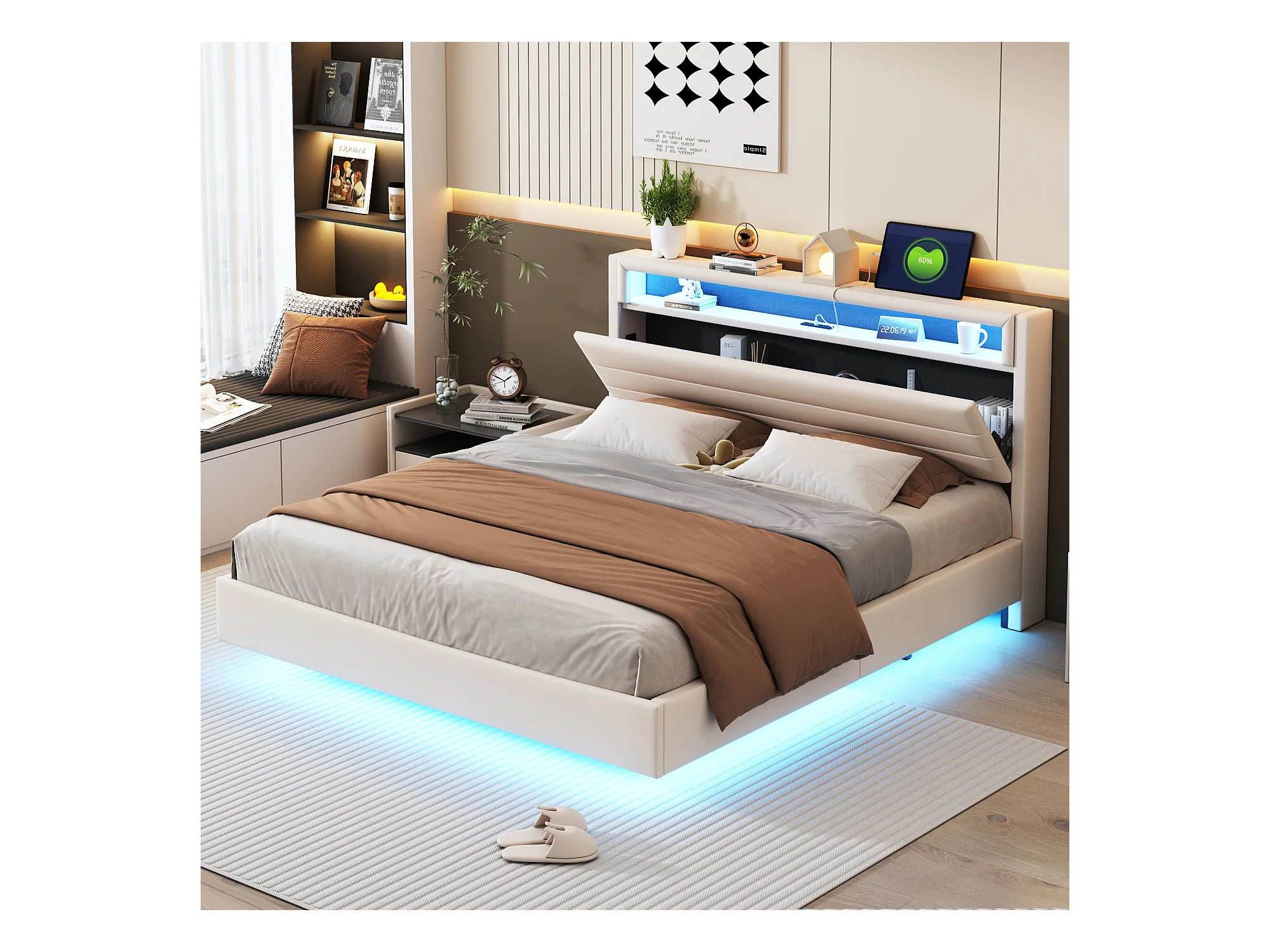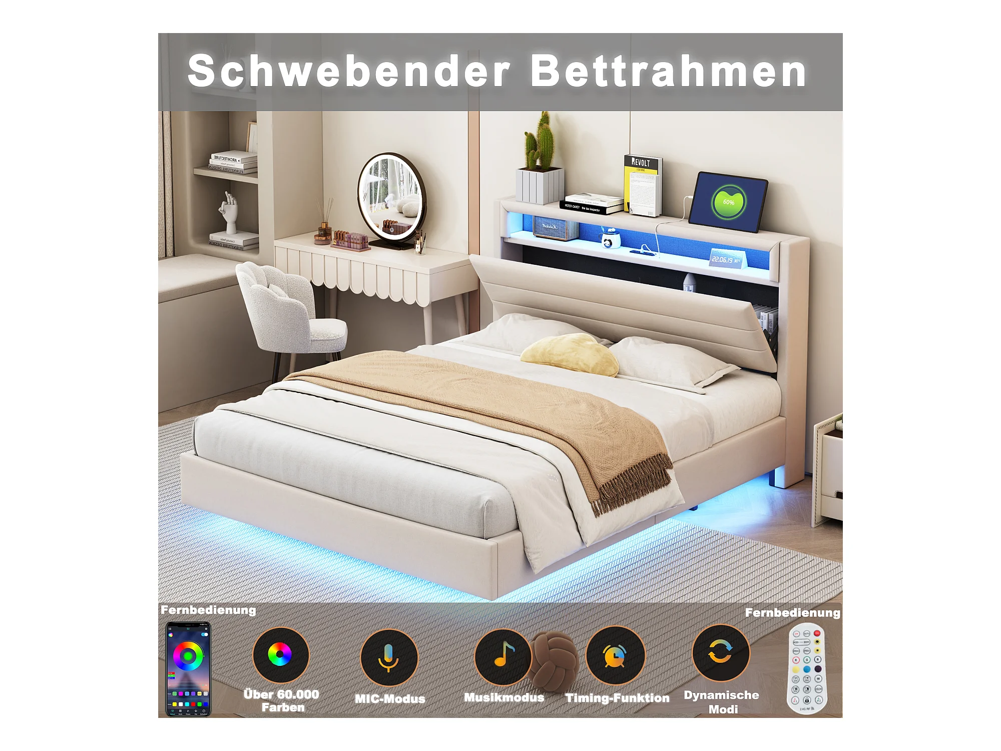 Lit capitonné 160x200 cm, avec prise USB et LED, tête de lit réversible, pied caché, lit double, lit pour adulte ou enfant (214x161x106 cm)