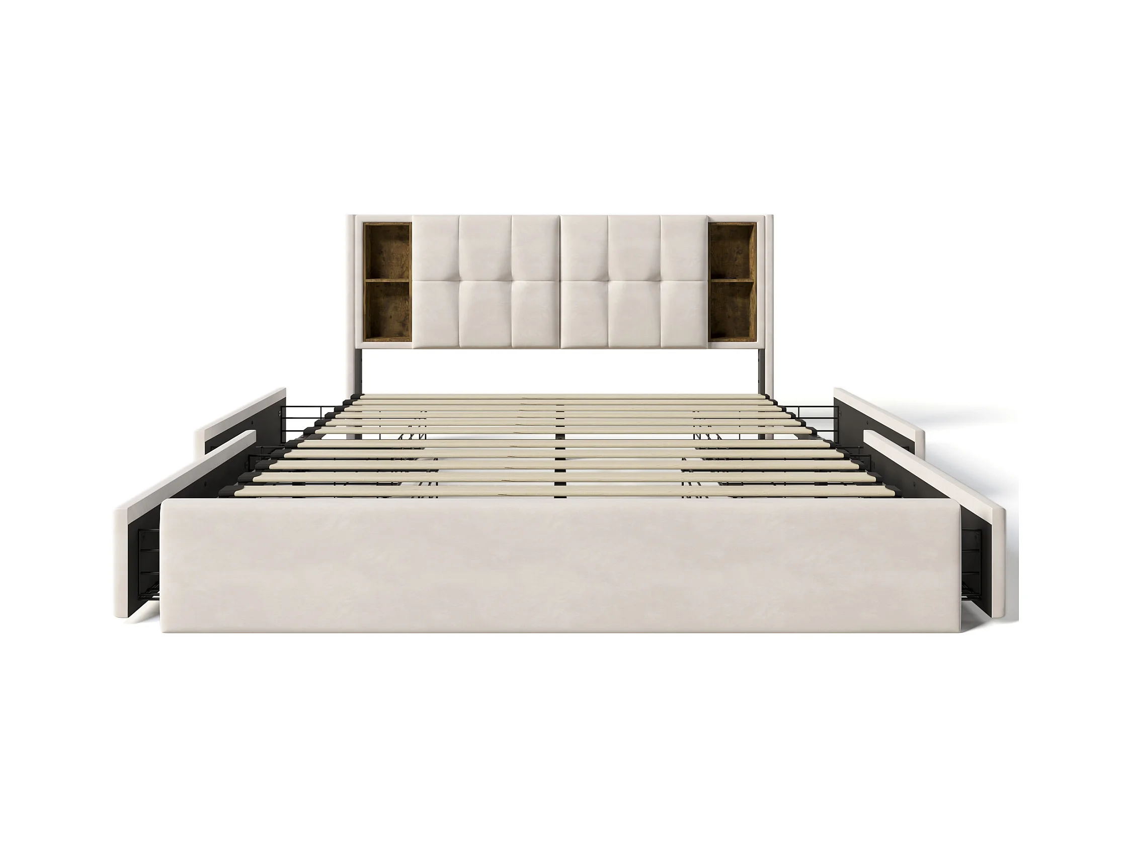Lit adulte 160x200 cm - Lit double avec USB et recharge sans fil - 4 tiroirs - velours beige