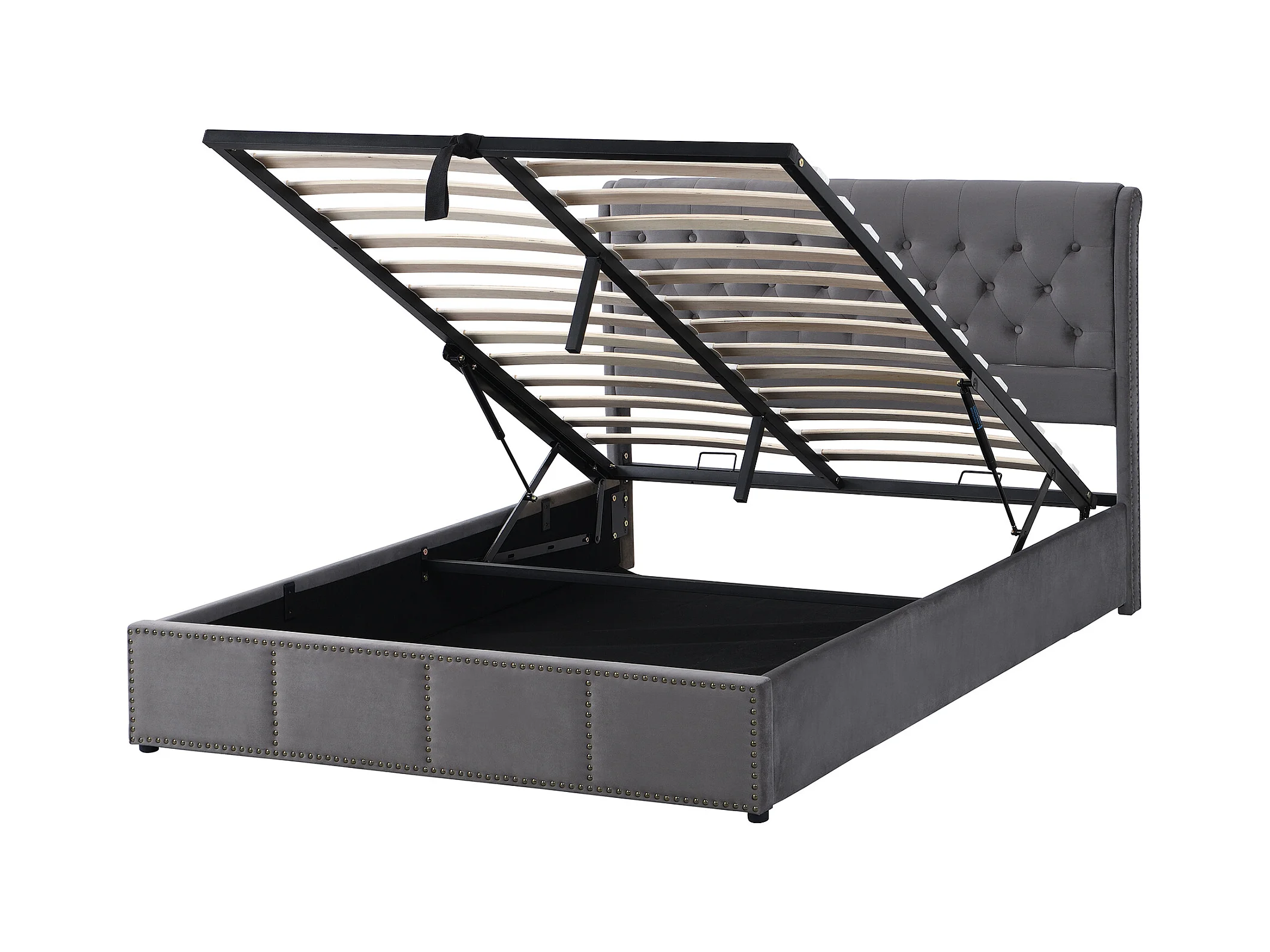 Lit capitonné avec mécanisme hydraulique, lit de rangement fonctionnel, avec décoration de clous, Velours, Gris (140x190 cm)
