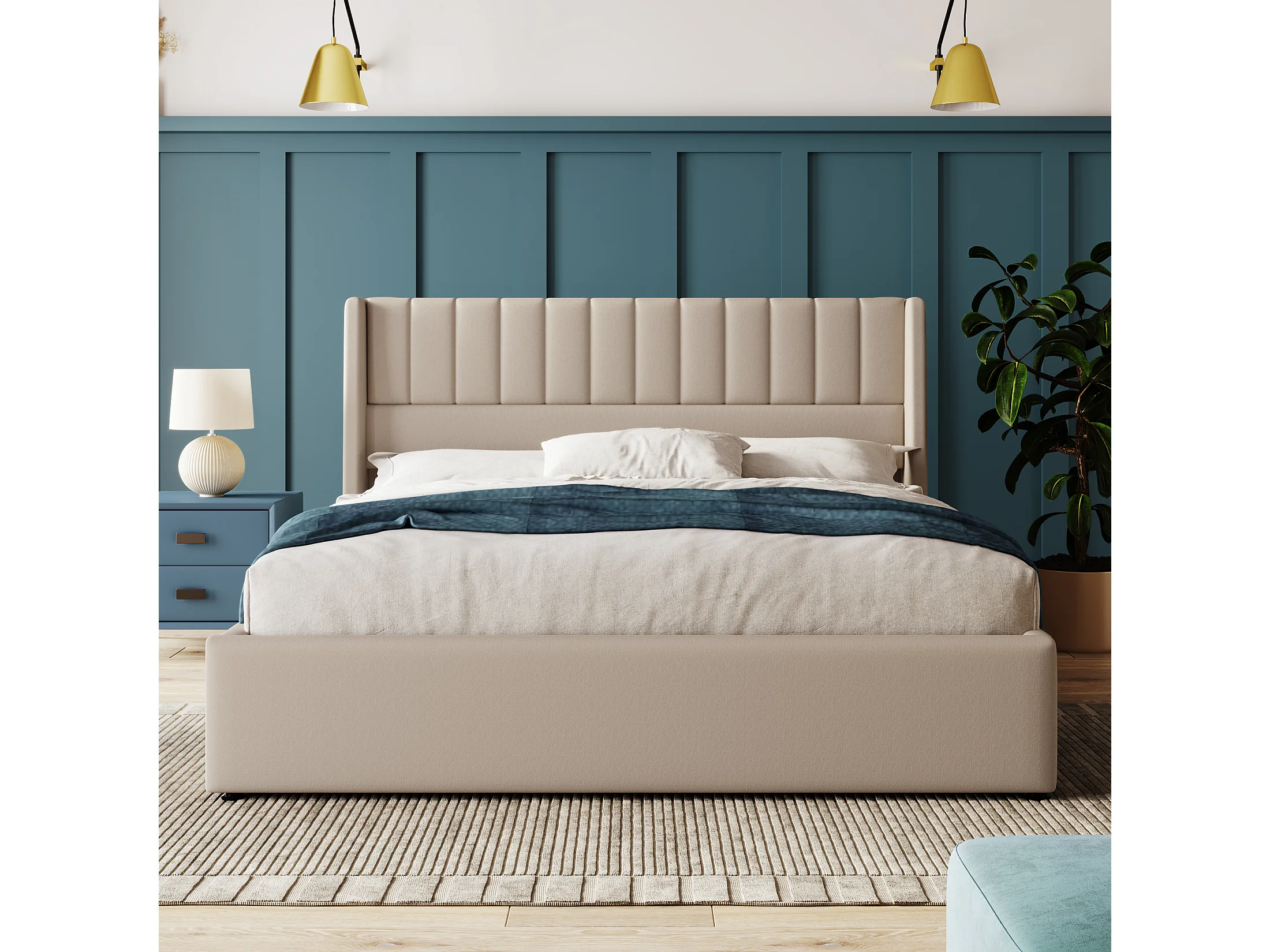Lit coffre 140x200 cm lit adulte avec sommier à lattes - tissu en lin beige - matelas inclus