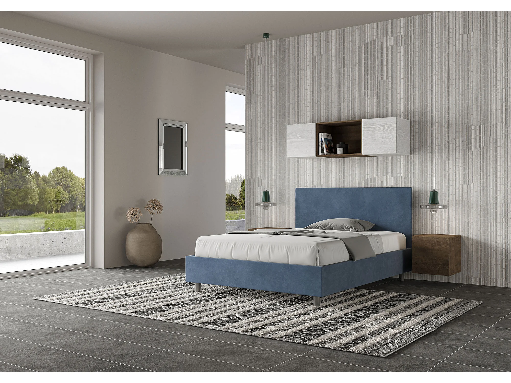 Lit double sans sommier rembourré 140x190 microfibre bleu Adele