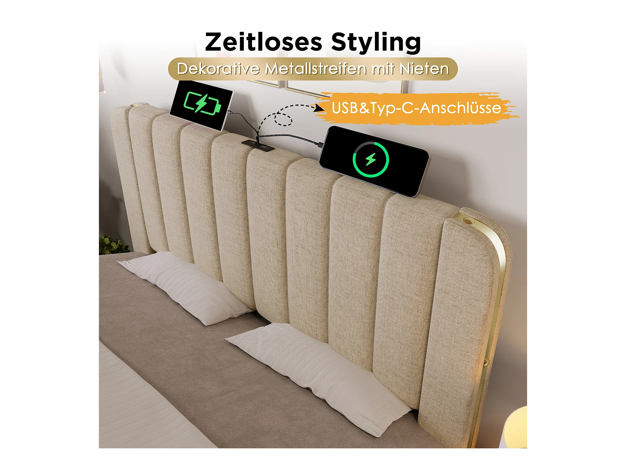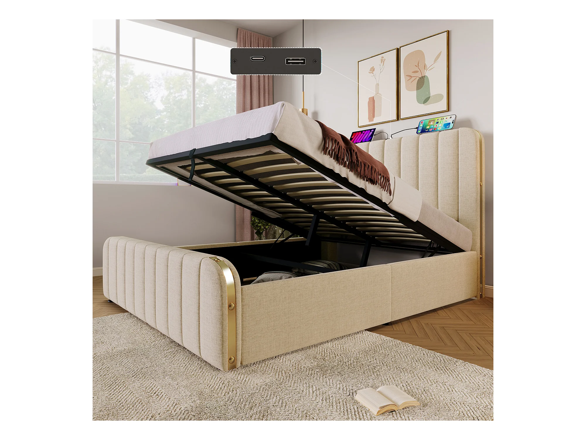 Lit capitonné, tête de lit avec bandes dorées et USB Type-C, lit de stockage hydraulique, lin beige, 140x200 cm, 4 tiroirs (216x150x101 cm)