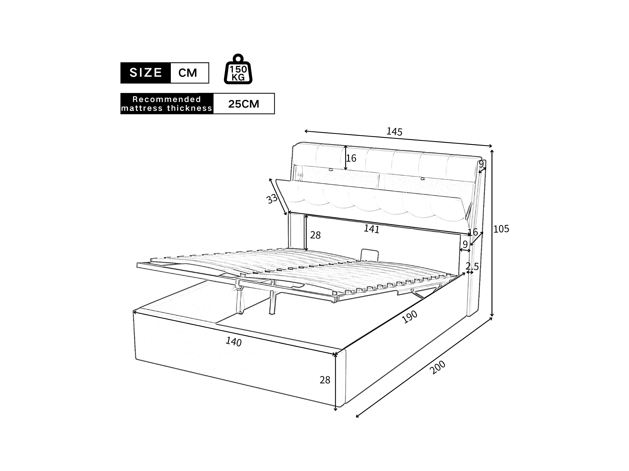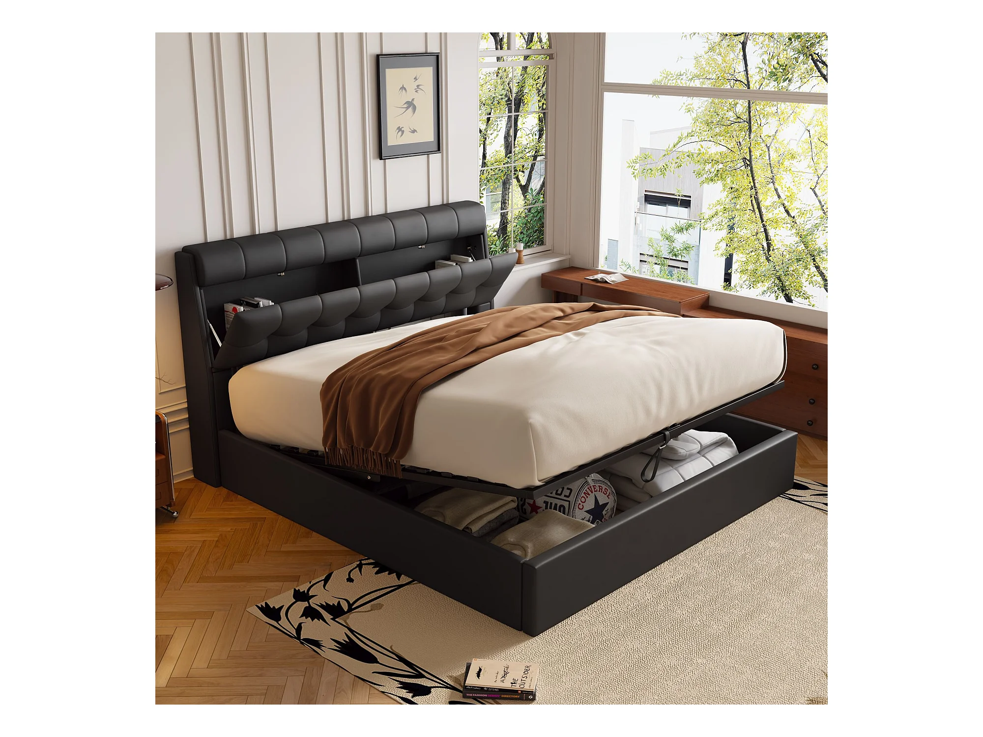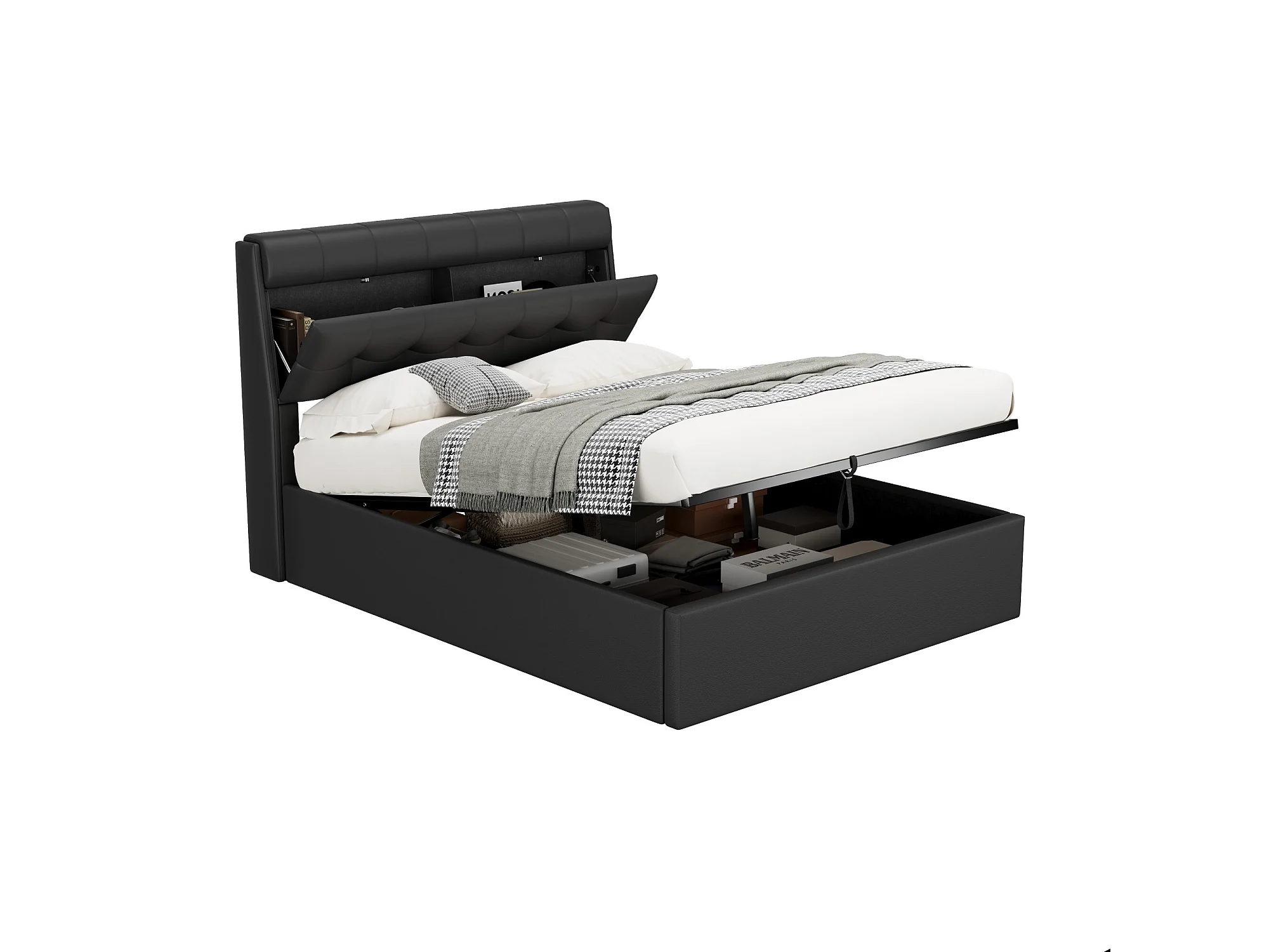 Lit coffre 140x190 cm - lit capitonné avec sommier à lattes et tête de lit coffre - PU - noir - sans matelas