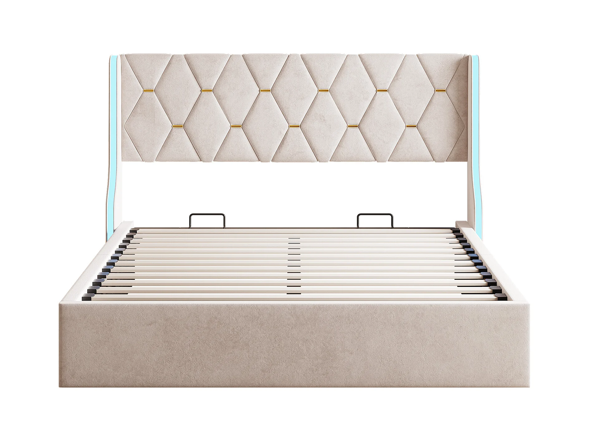 Lit Coffre 140x200 Cm Avec Rangement Et LED,cadre De Lit Avec Sommier à Lattes,velours,beige