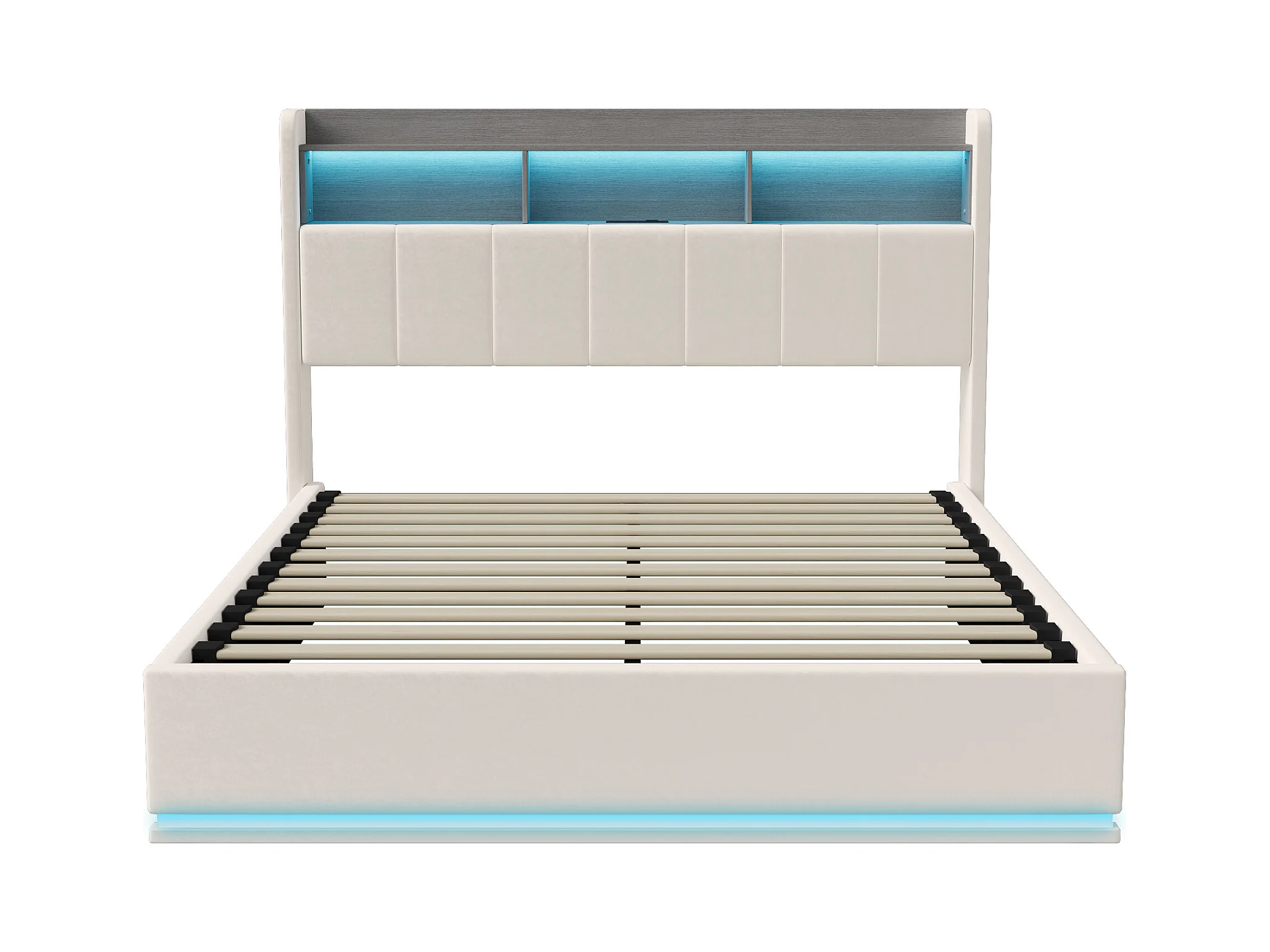 Lit coffre 140x200 cm blanc, tête de lit avec LED, chargement USB, rangements, sommier à lattes, structure métal et système hydraulique.