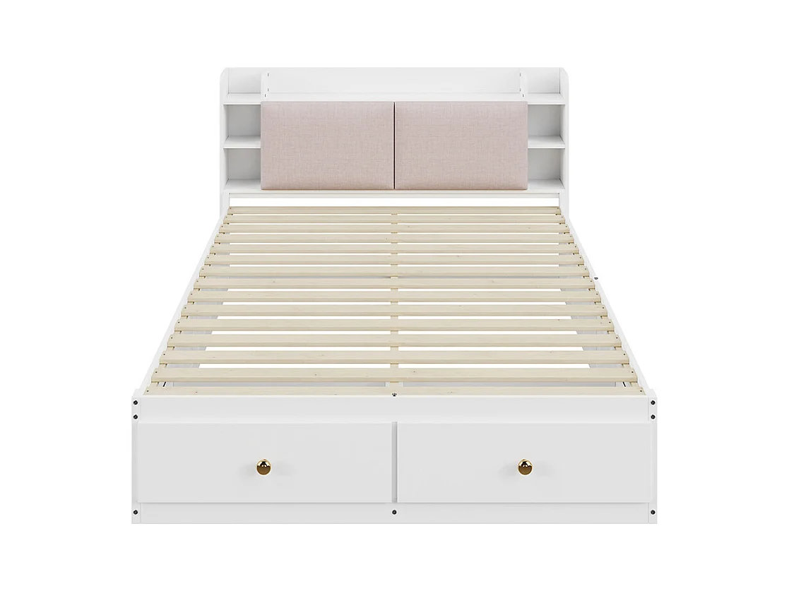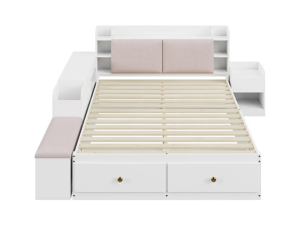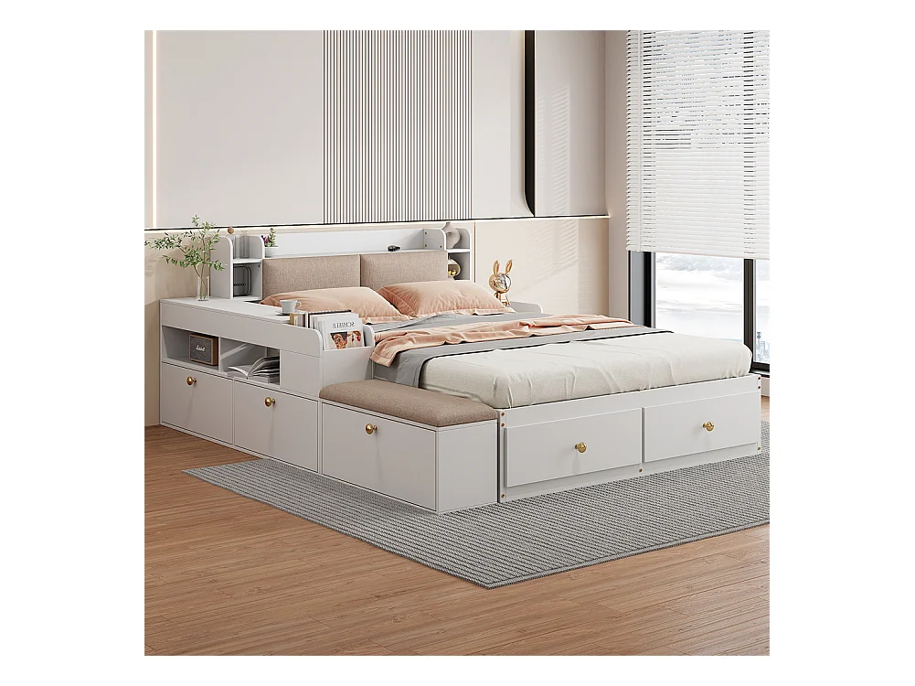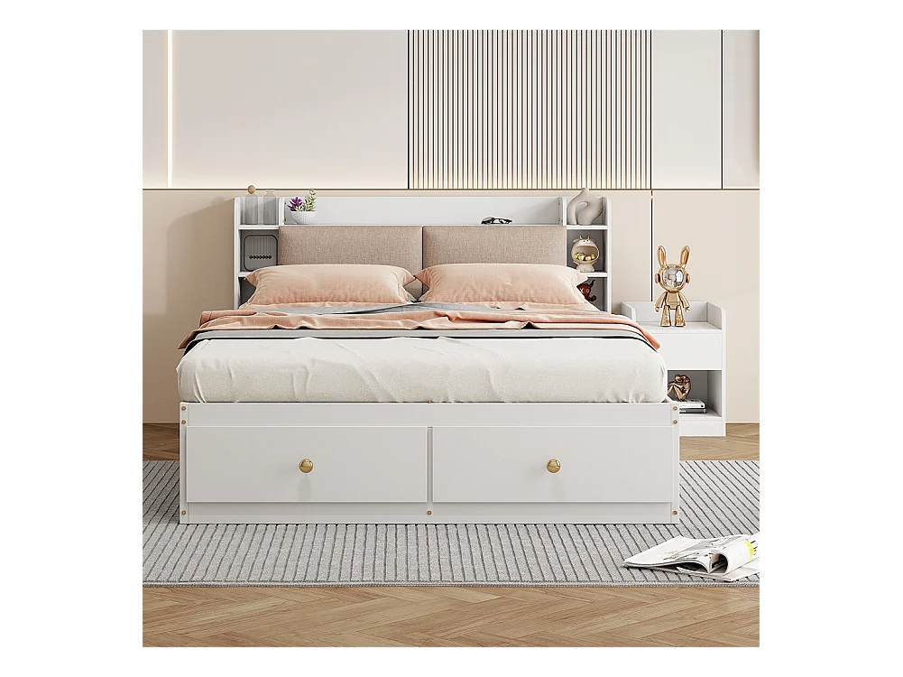 Lit coffre 140x200cm,Lit combiné en bois massif,Lit double de rangement Lit tatami, blanc