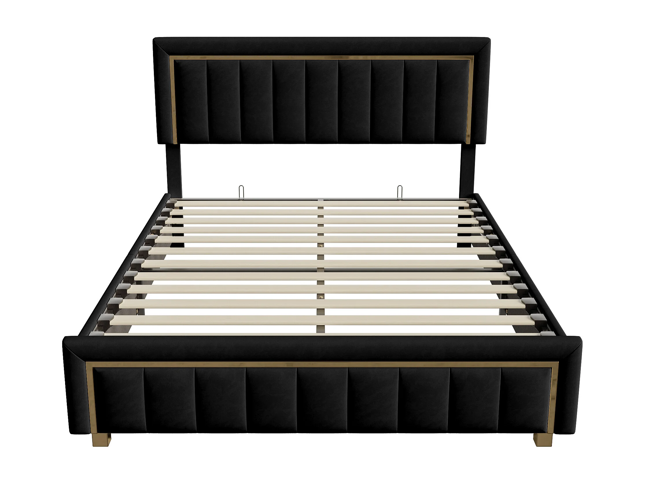 Lit coffre 140x200cm, lit double avec sommier à lattes et tête de lit et pied avec bordure dorée plaquée, bois & flanelle, beige blanc