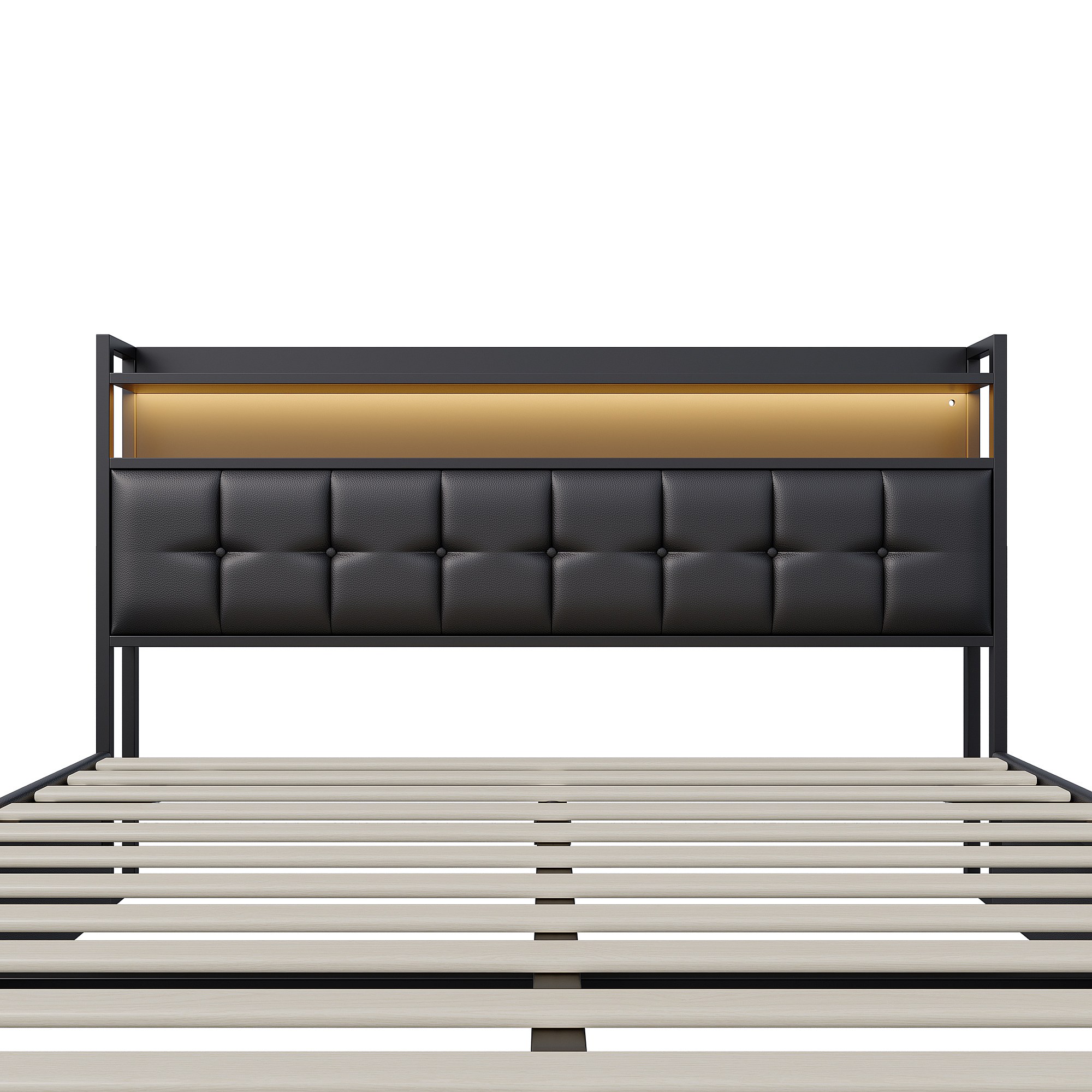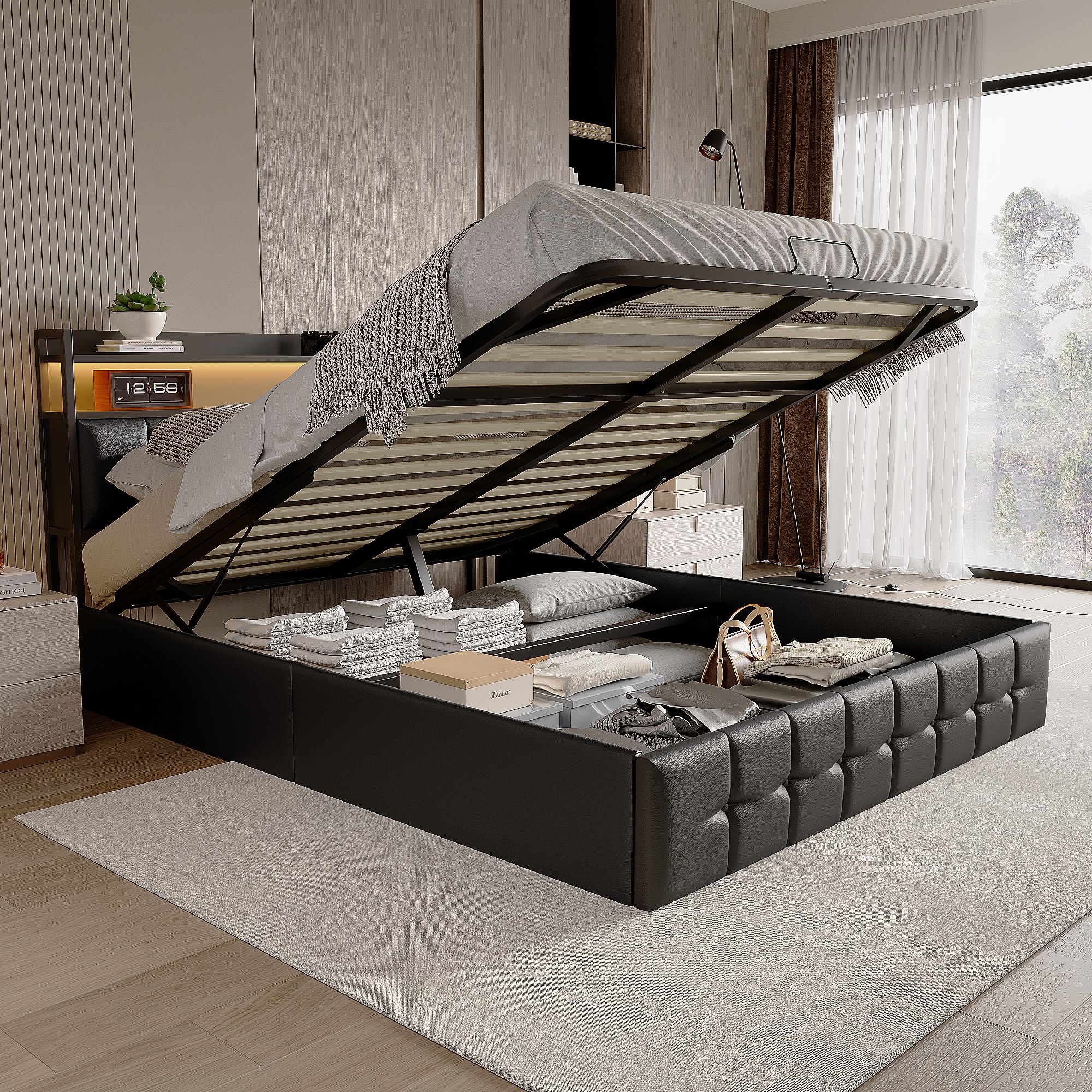 Lit Coffre 160 x 200, Lit Double avec LED et Charge USB, avec espace de rangement, Tete de lit avec Compartiment de Rangement,tissu en PU