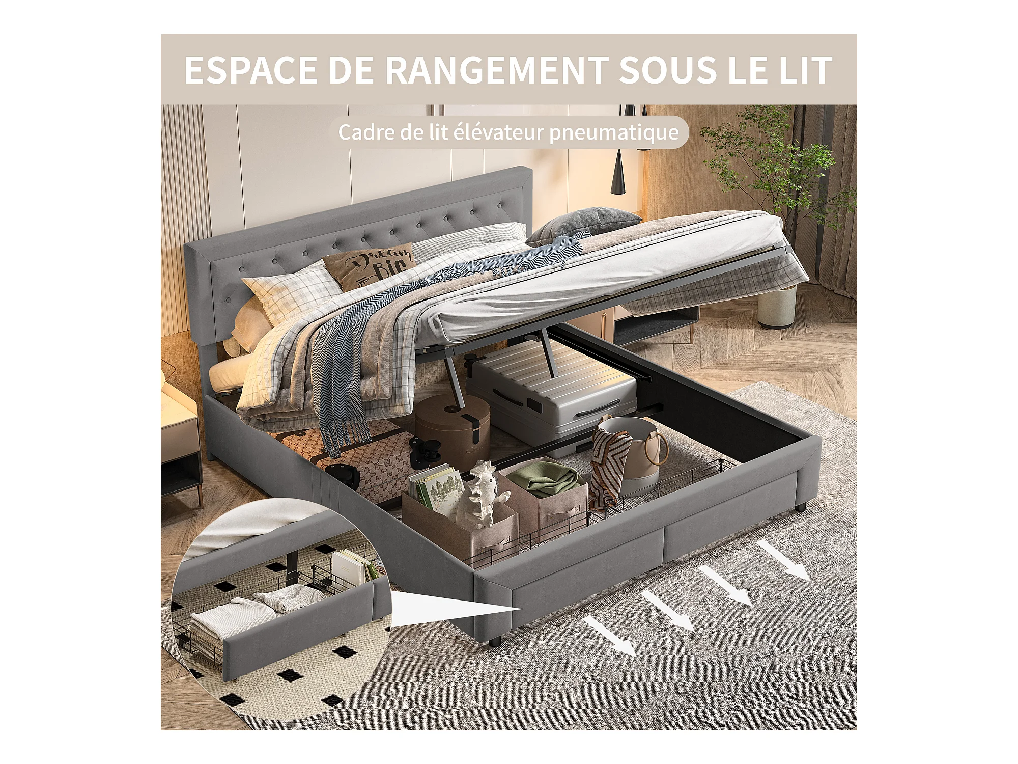 Lit Coffre 160x200 cm avec 2 Tiroirs, Lit Double avec Sommier à Lattes et Tête de Lit, Velours,Gris