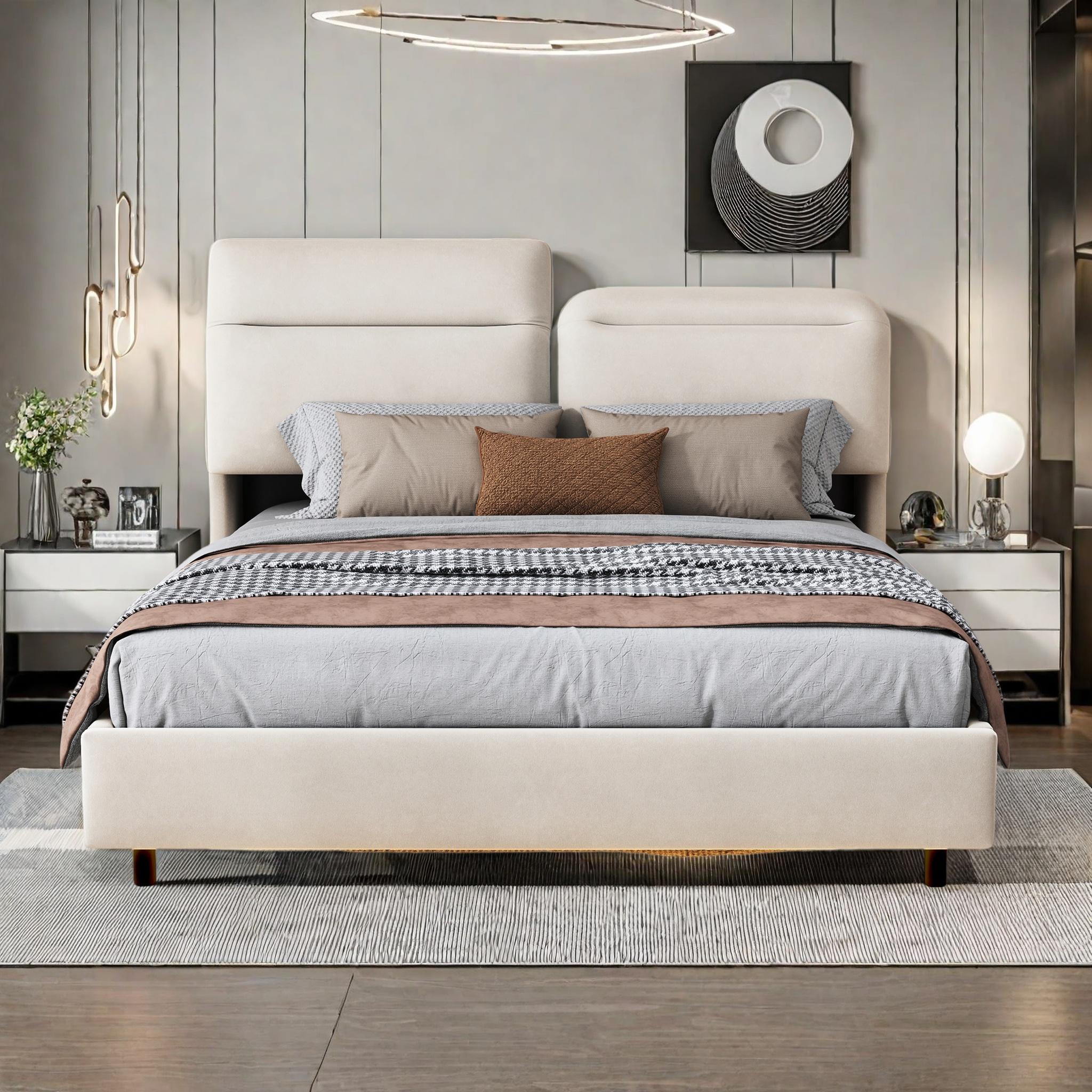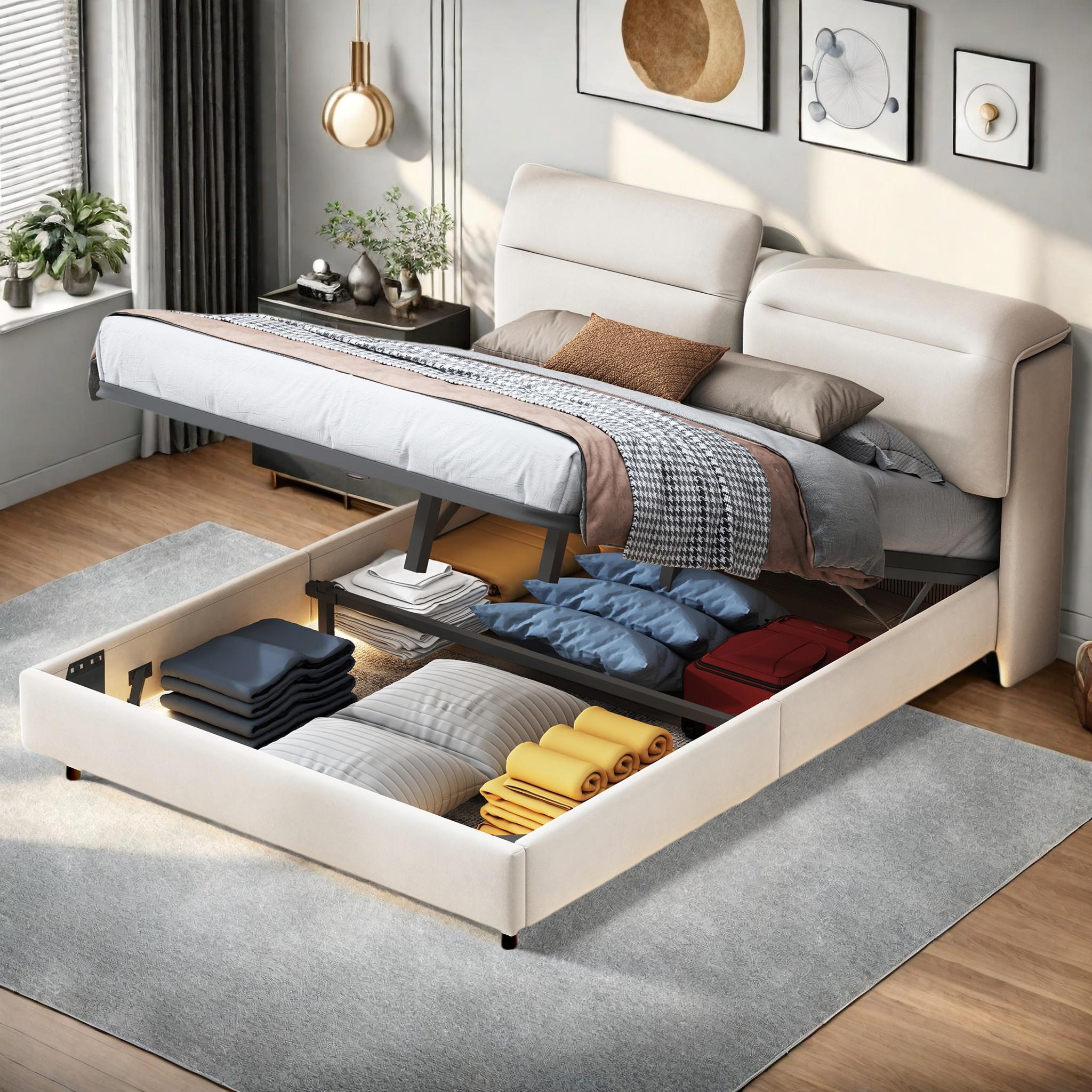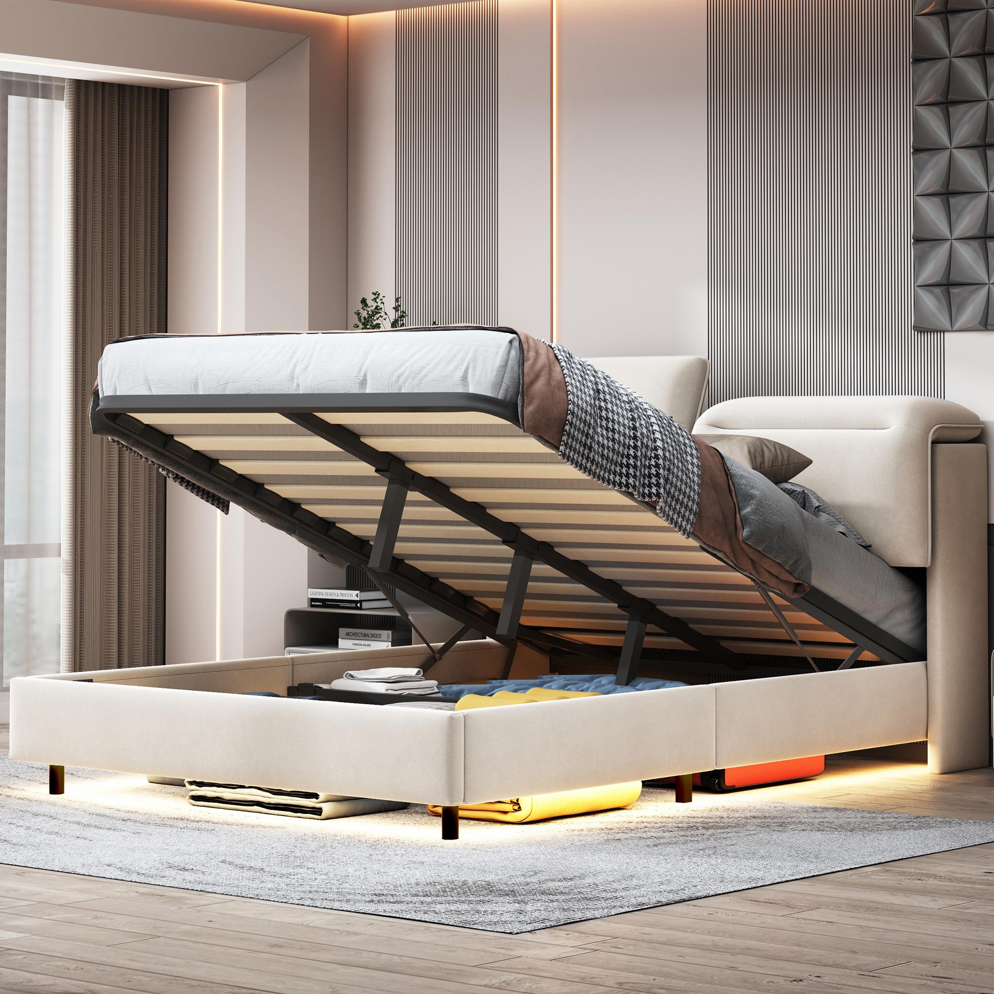 Lit coffre 160x200 cm - avec LED et coffre de rangement - Tête de lit pliable - Lit double 160x200 cm - Sommier à lattes - Beige