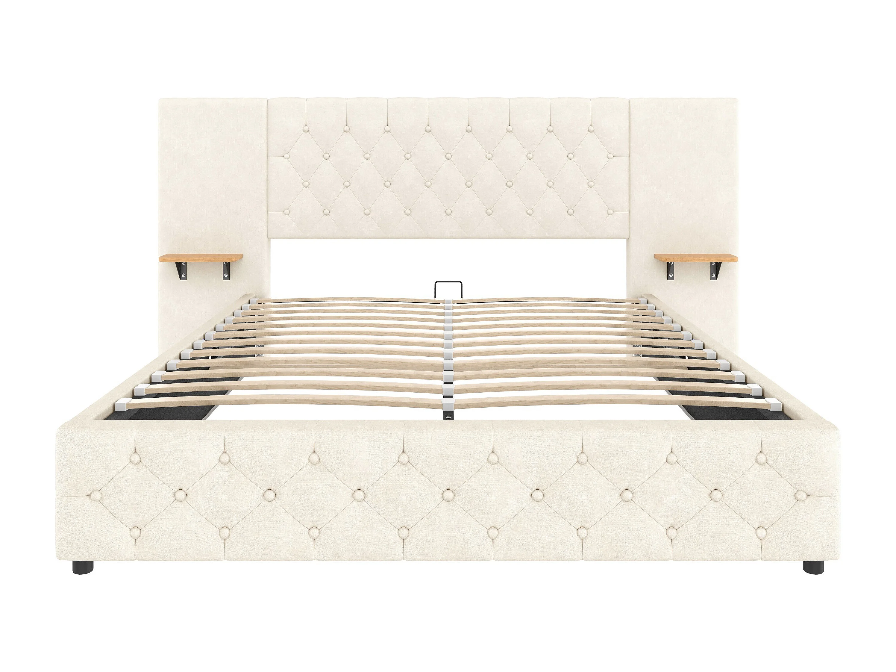 Lit coffre 160x200 cm avec LED et port USB, tête de lit large - velours beige - sans matelas