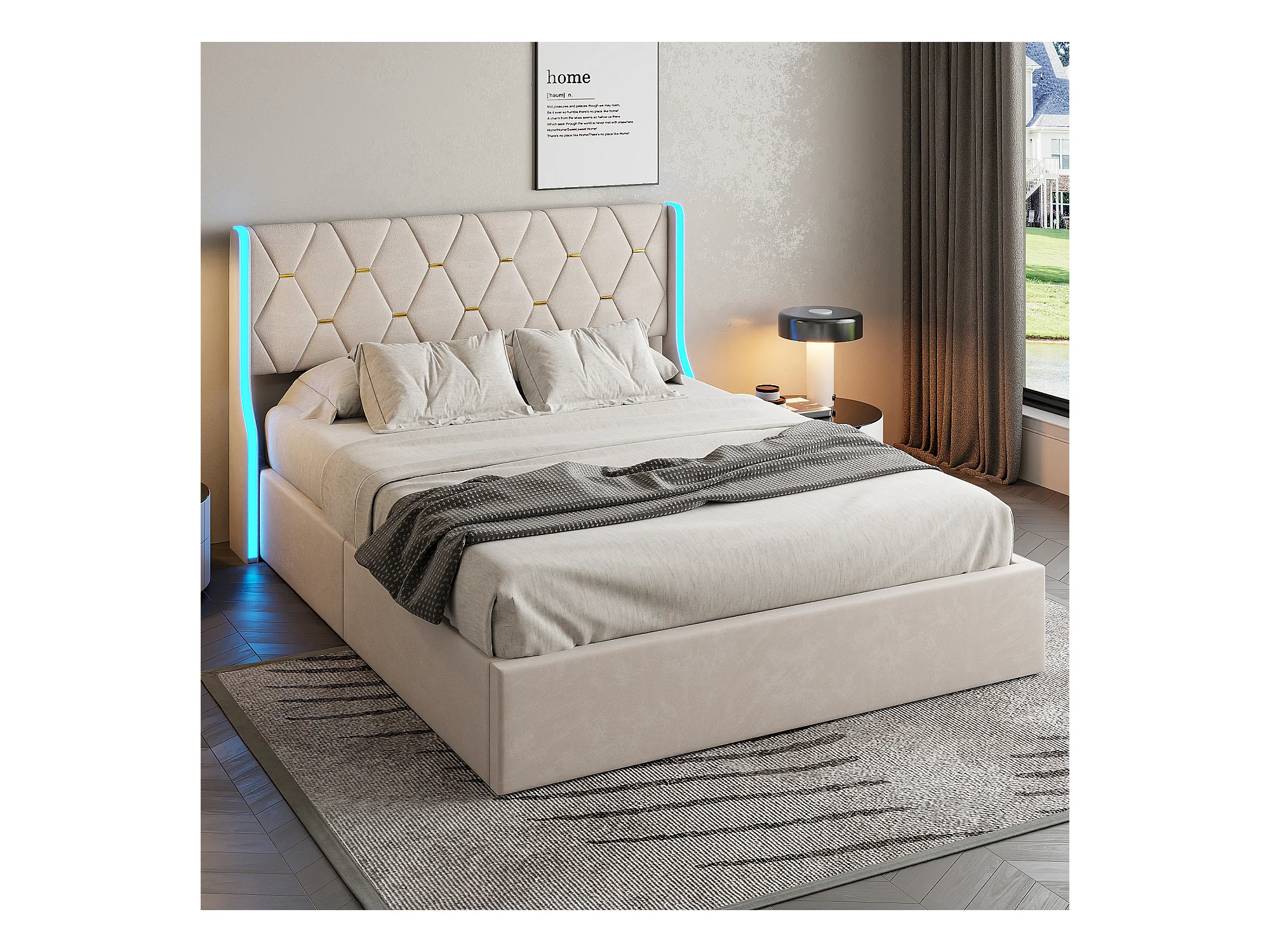 Lit Coffre 160x200 cm avec sommier, avec LED, sommier à Lattes, Velours, Beige