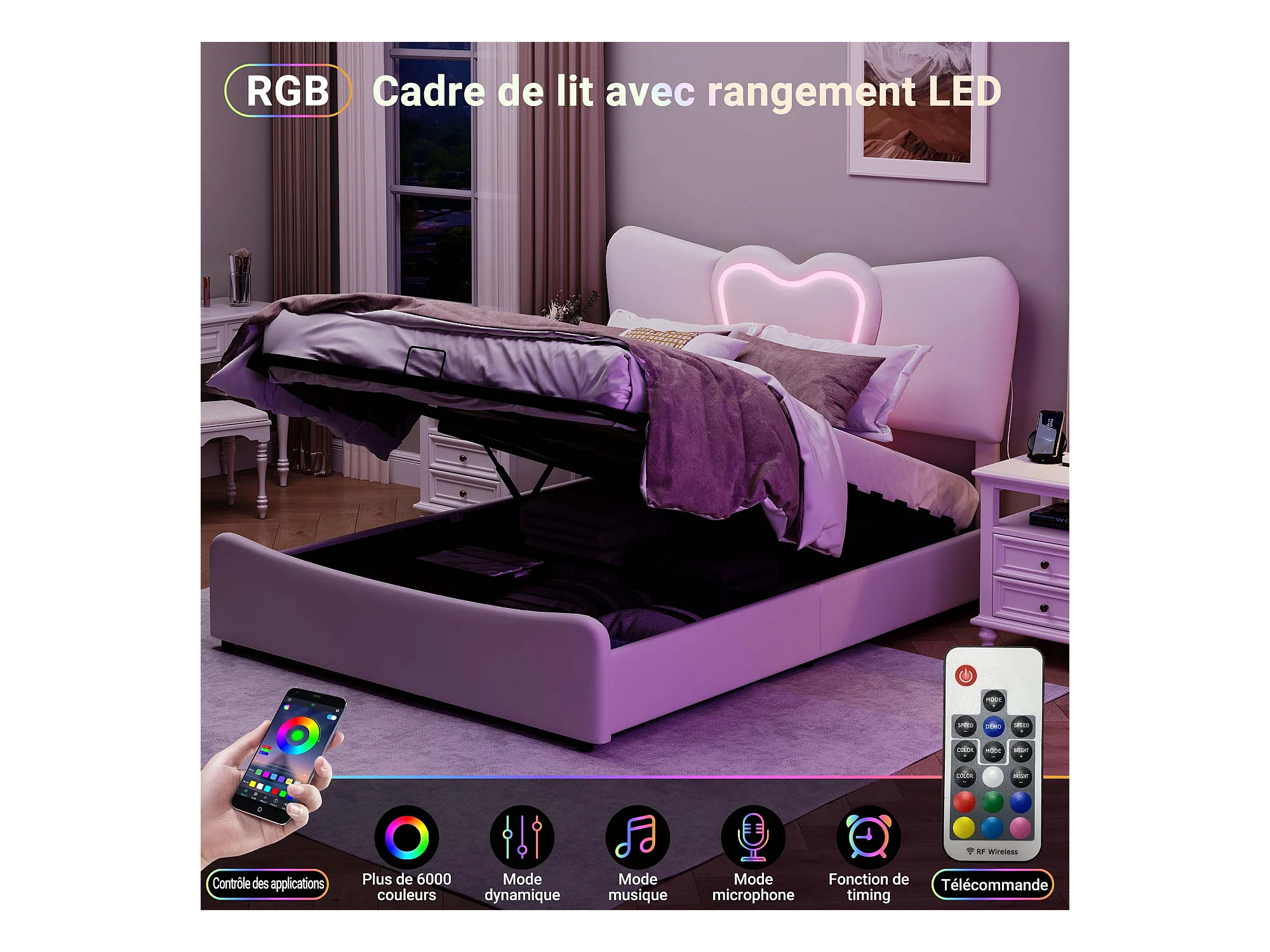 Lit Coffre 160x200 cm en Velours Beige avec tête de lit LED en Forme de cœur, Port USB