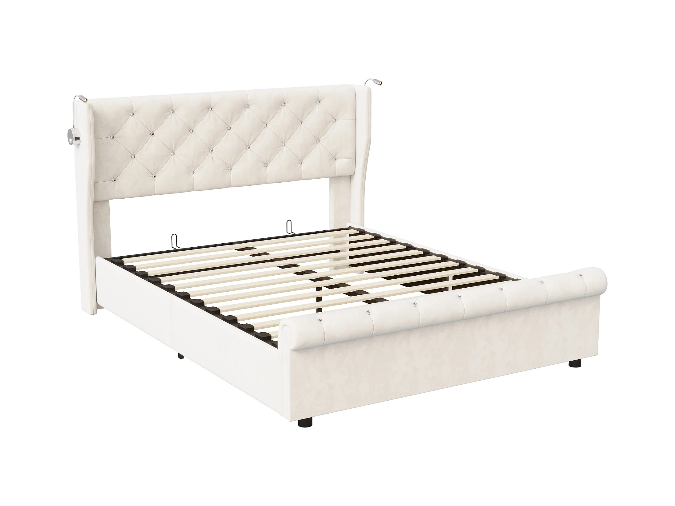 Lit Coffre 160x200cm Avec Tête De Lit, Liseuse Avec Chargement USB, Sommier à Lattes, Cadre De Lit