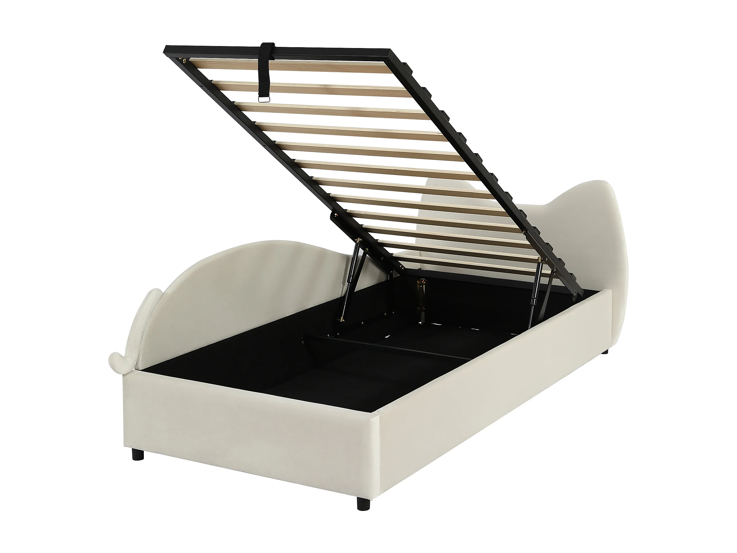 Lit coffre 90 x 200 cm - Lit simple avec tête de lit chat et panneau latéral gauche - velours beige