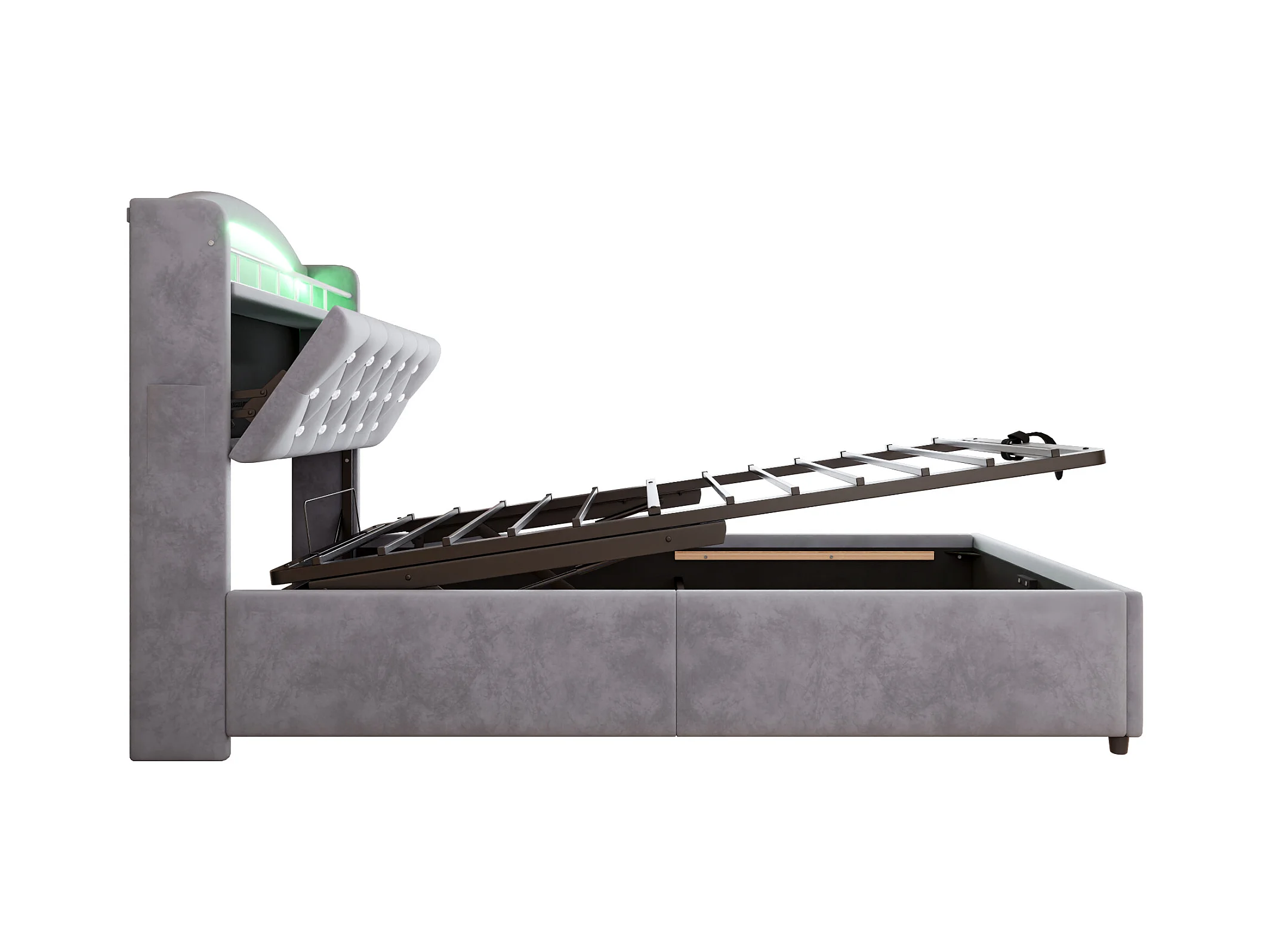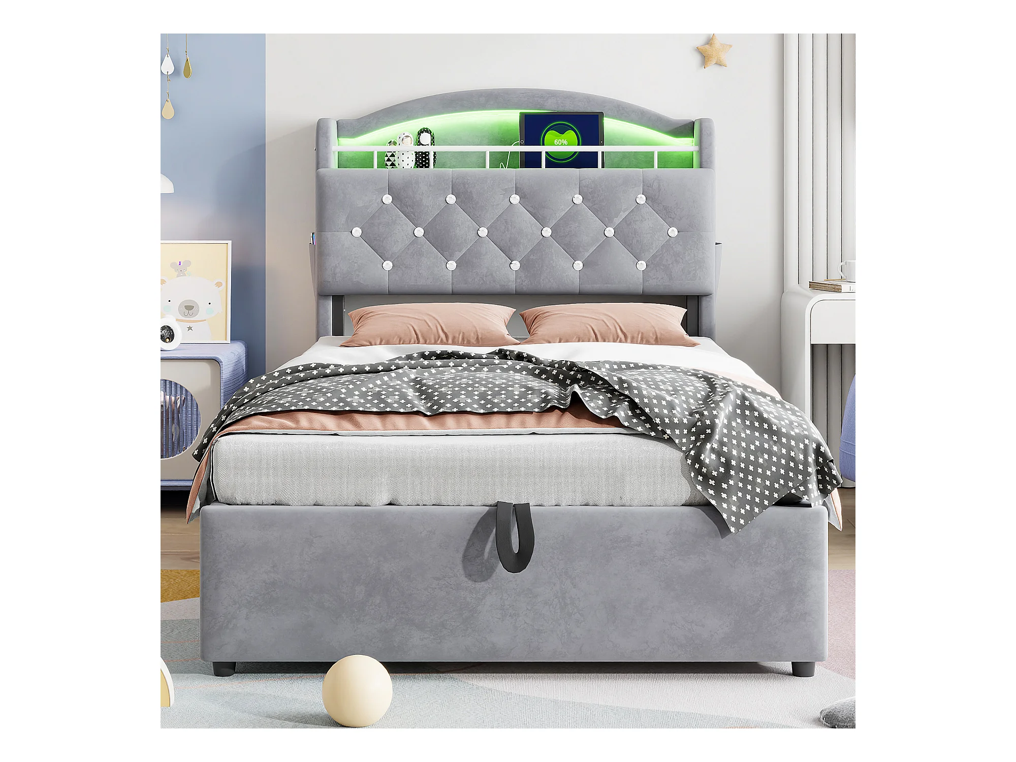 Lit coffre 90x200 cm avec LED et port USB, tête de lit coffre, velours gris - sans matelas