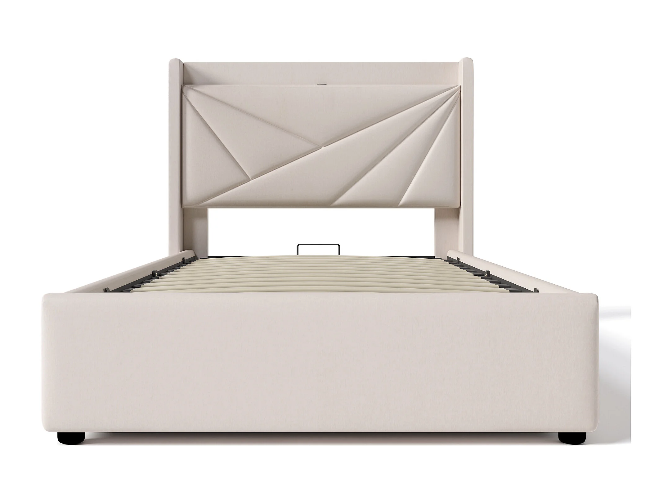 Lit coffre 90x200 cm - lit double avec tête de lit avec chargement USB Type C - lin - beige - sans matelas