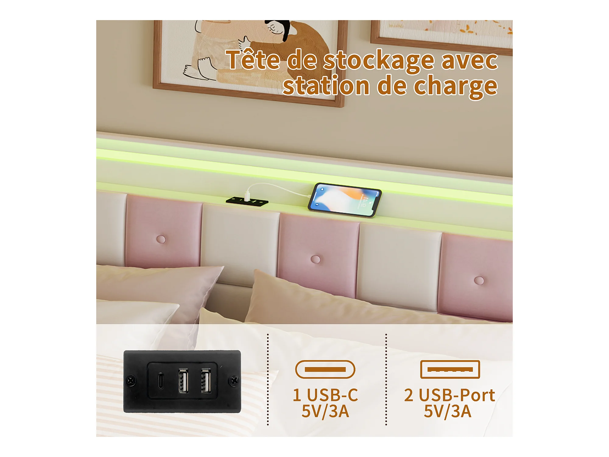 Lit coffre avec LED RGB, tête de lit avec ports USB et 4 tiroirs de rangement – Velours doux – 140x200 cm – Design moderne