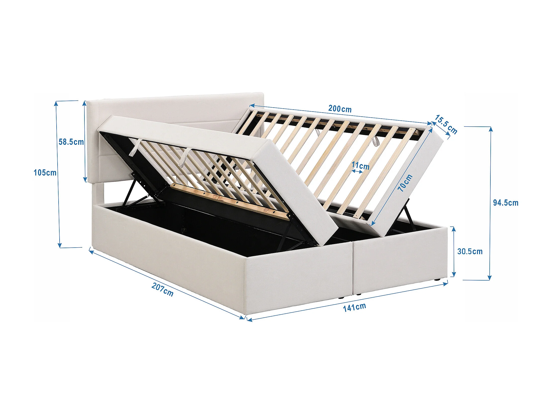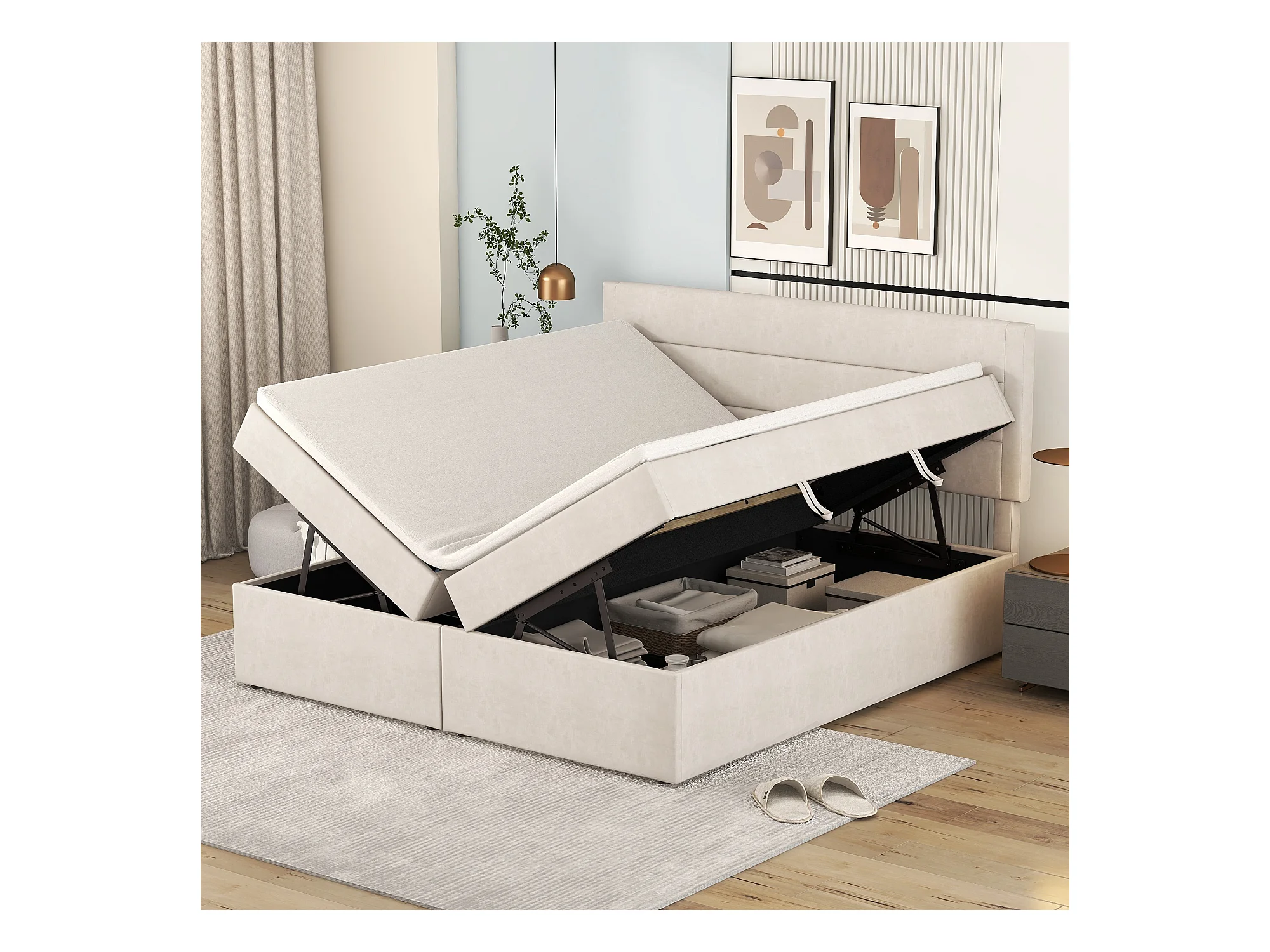 Lit coffre avec sommier à lattes, 140x200 cm, cadre métallique, avec grand espace de rangement, beige