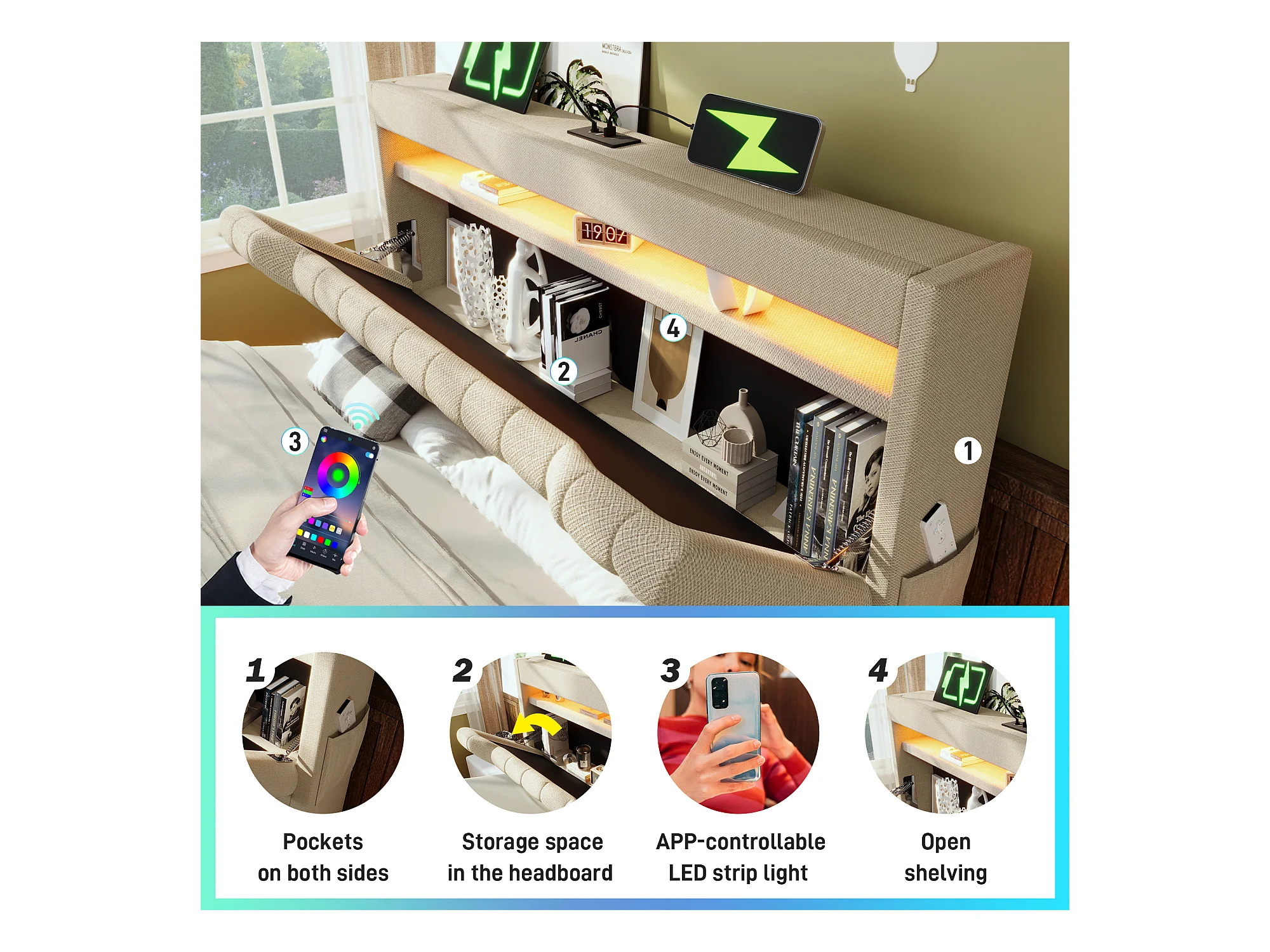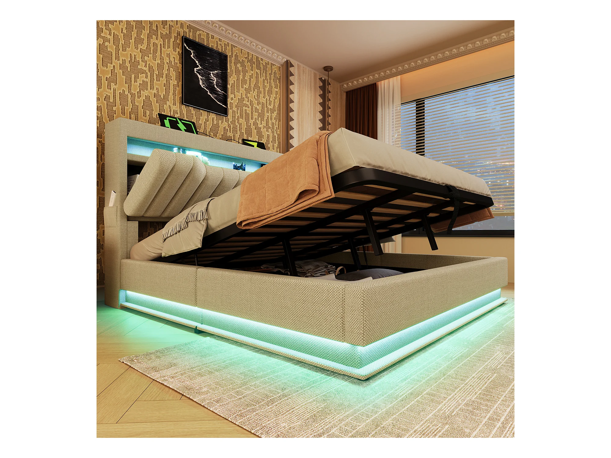 Lit coffre capitonné 160x200cm - avec LED - avec ports USB et Type-C - tissu en Lin - tête de lit avec espace de rangement - Beige