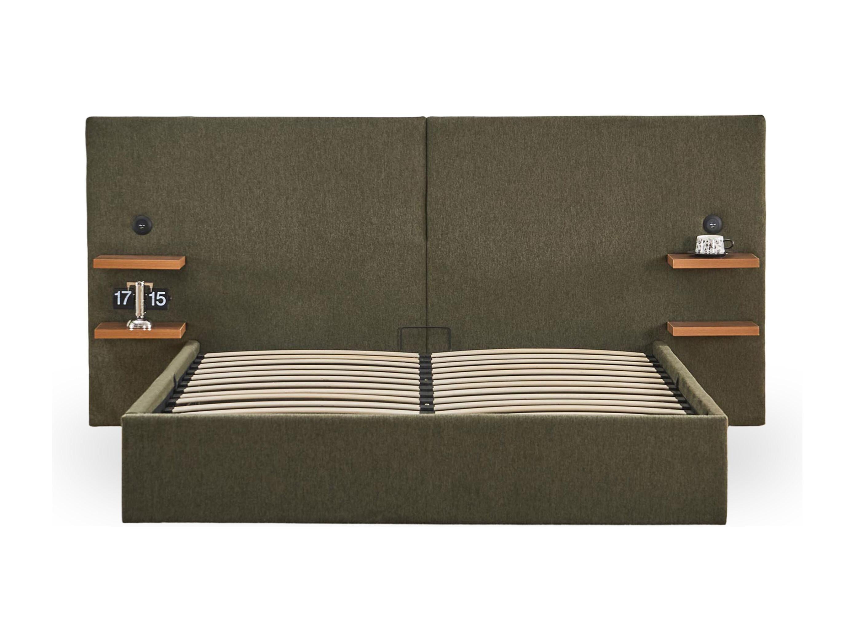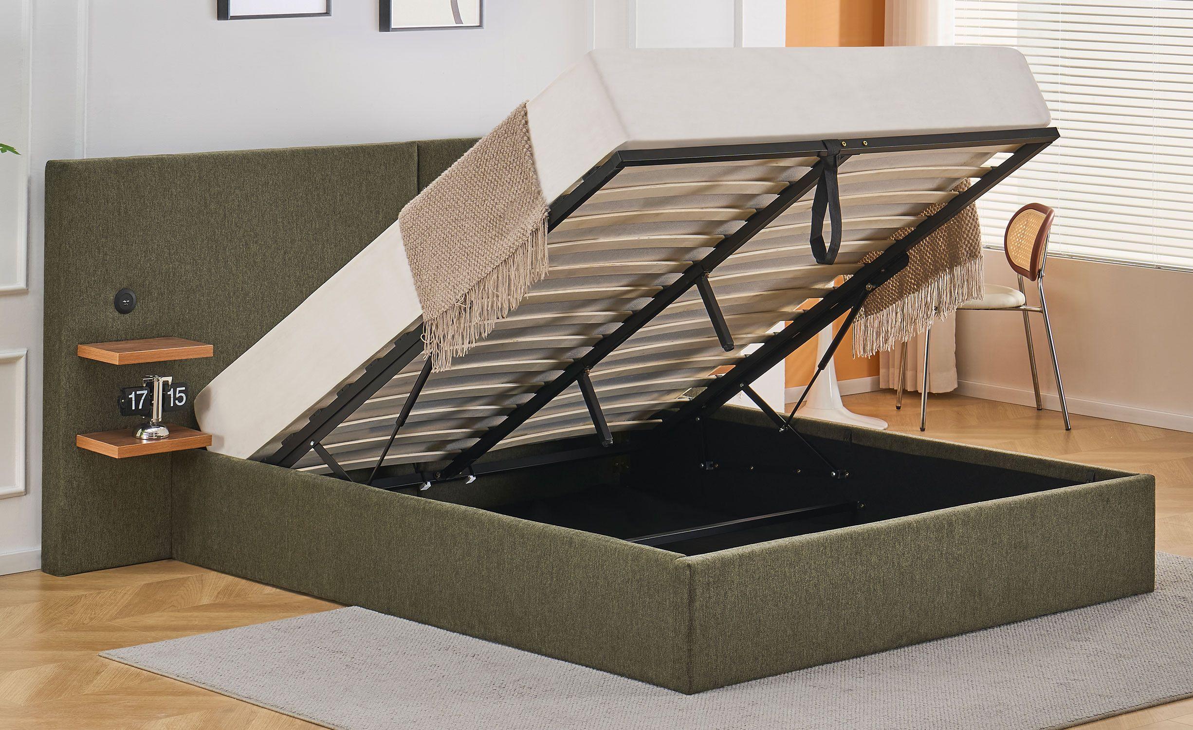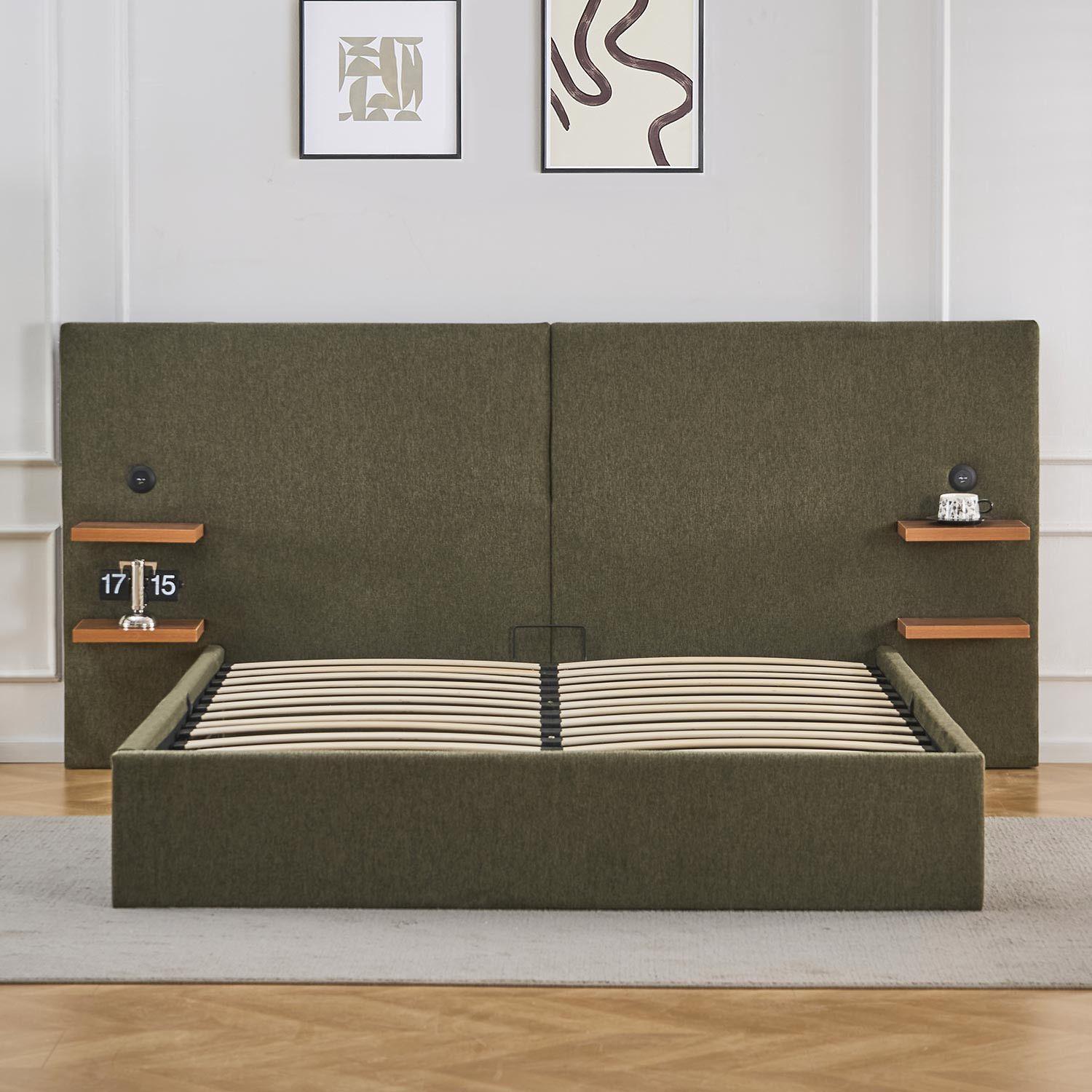 Lit-coffre complet avec tablettes et ports USB intégrés Lukas 140x190cm Tissu Vert
