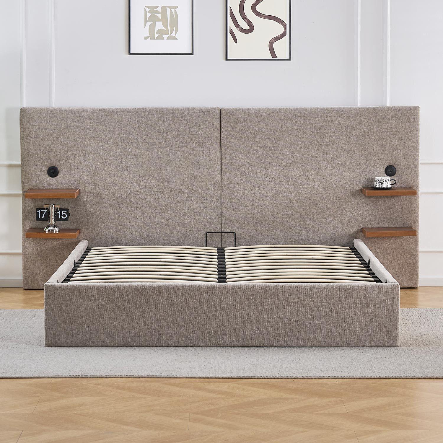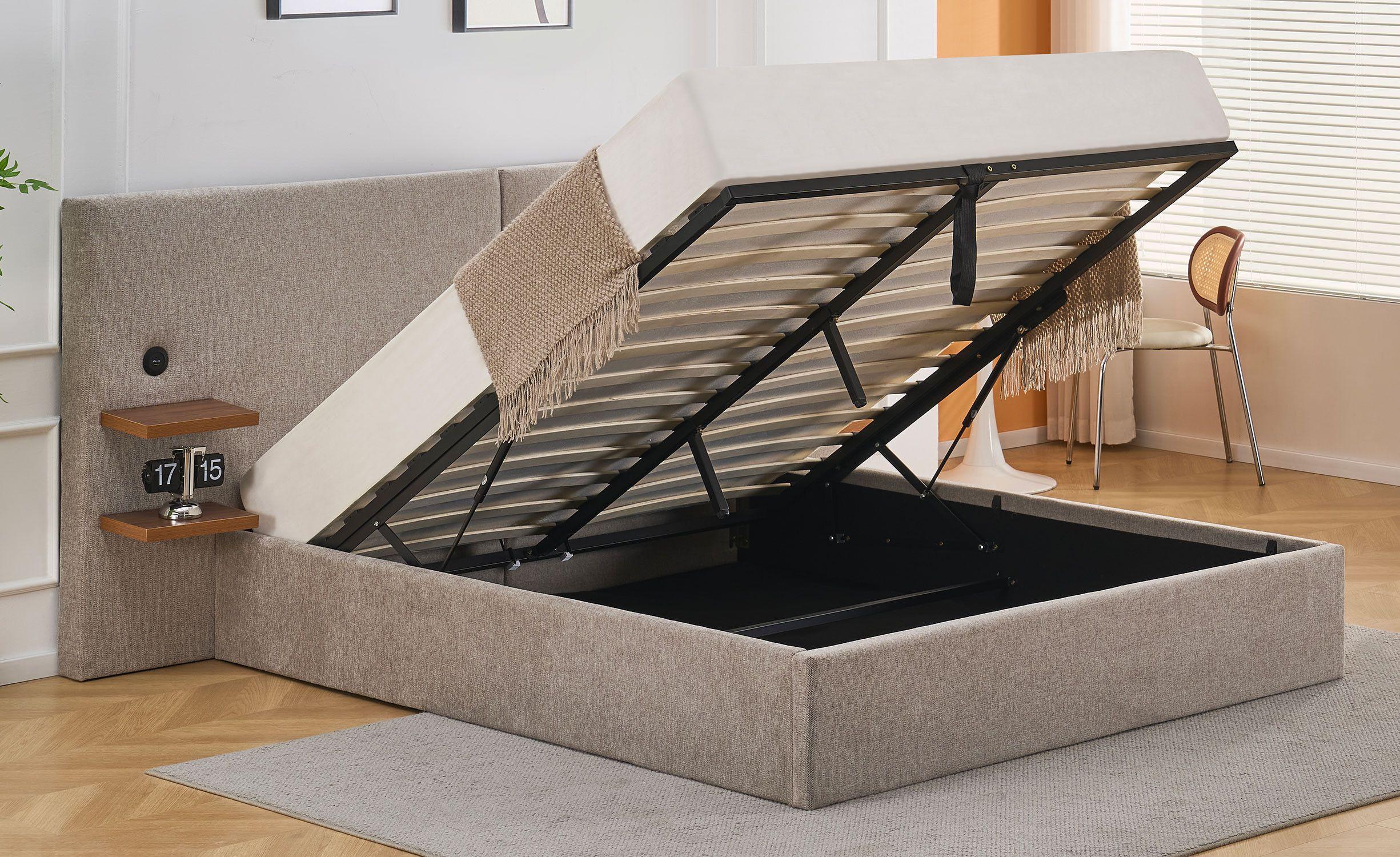 Lit-coffre complet avec tablettes et ports USB intégrés Lukas 160x200cm Tissu Taupe clair