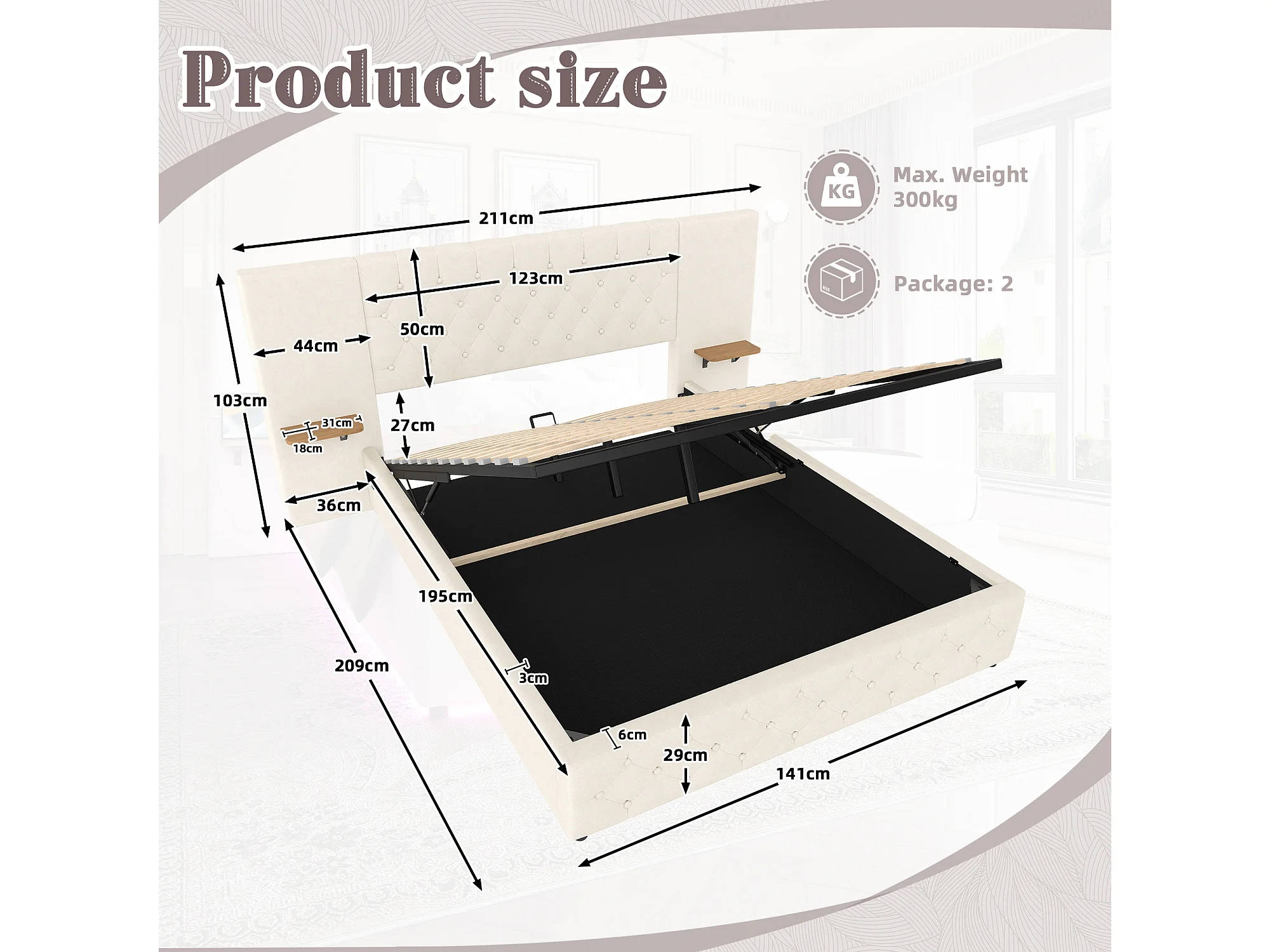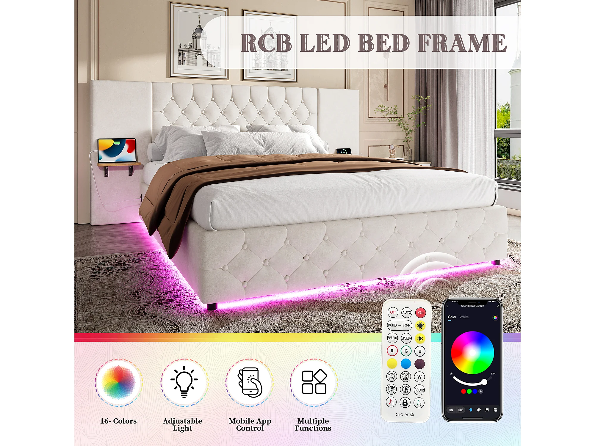 Lit Coffre 140×200 cm - Lit Rembourré en Velours Beige – Étagère Tête De Lit - LED/USB-C – Coffre Hydraulique – Style Contemporain