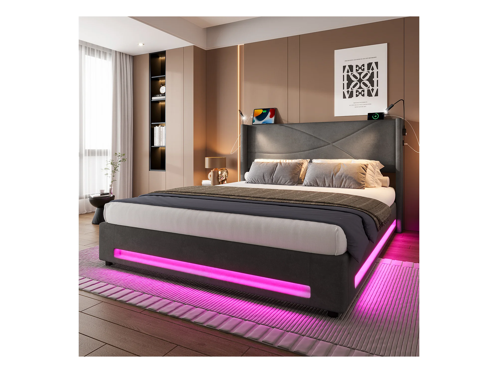 Lit Coffre 160×200 cm - Lit Rembourré en Velours Gris – Motif Matelassé en Lignes - Lampe de Lecture + LED/USB – Coffre Hydraulique – Style Contemporain