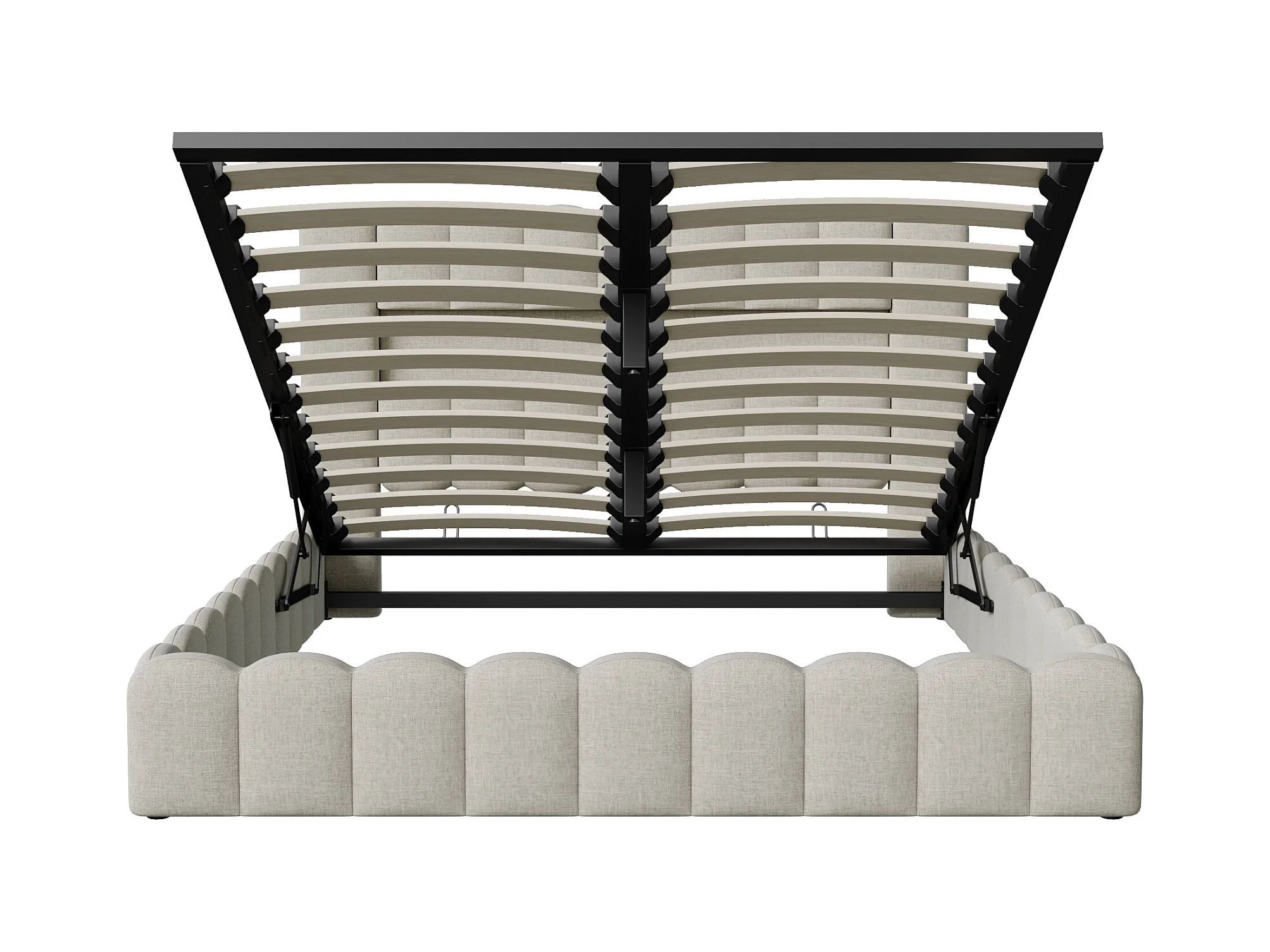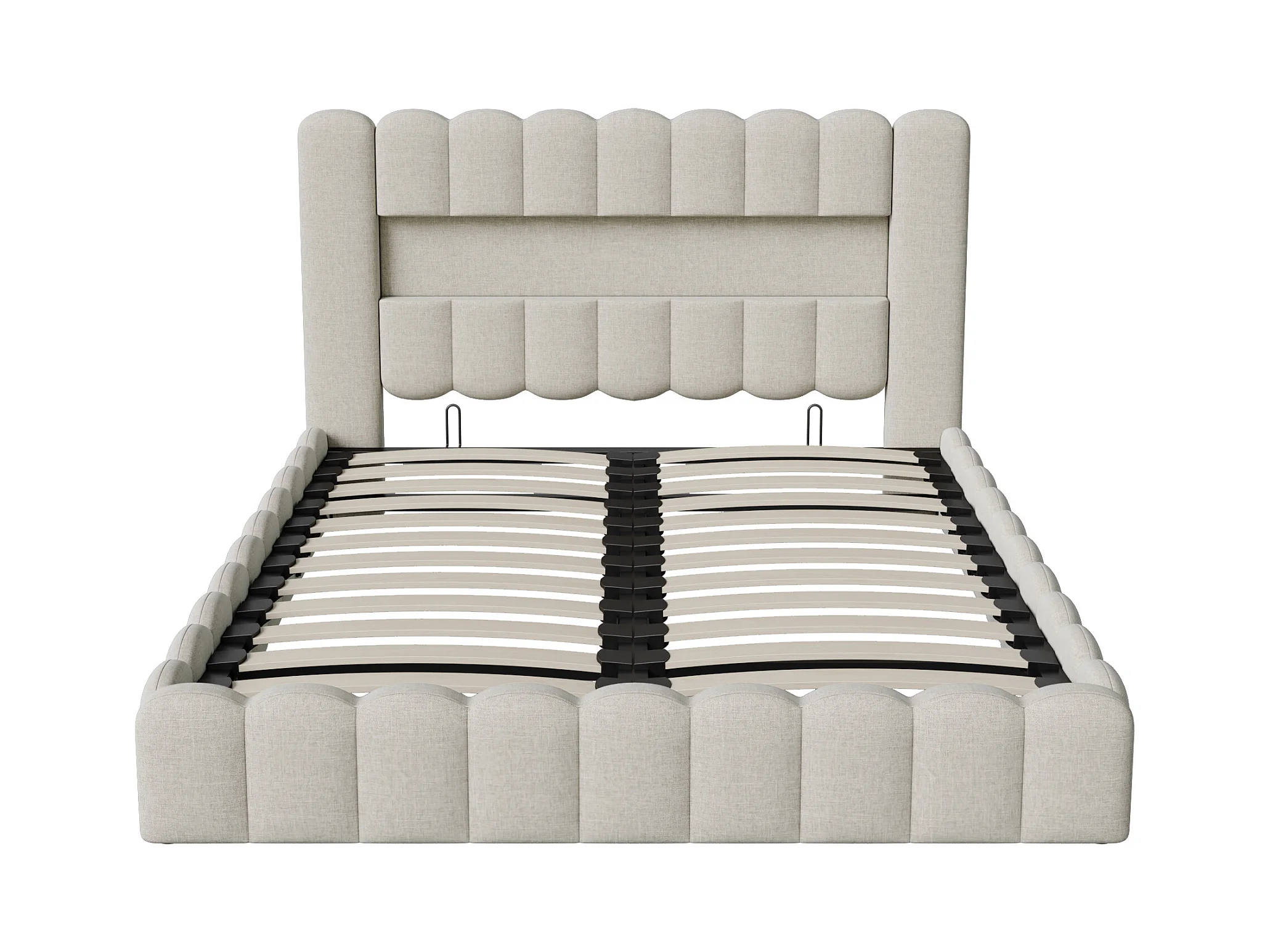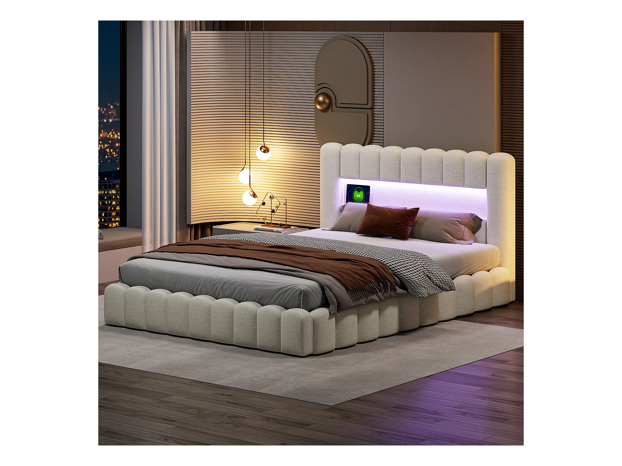 Lit coffre design en tissu beige style tronc d’arbre avec vérins hydrauliques, tête de lit LED RGB et ports USB/Type-C – 140x200 cm