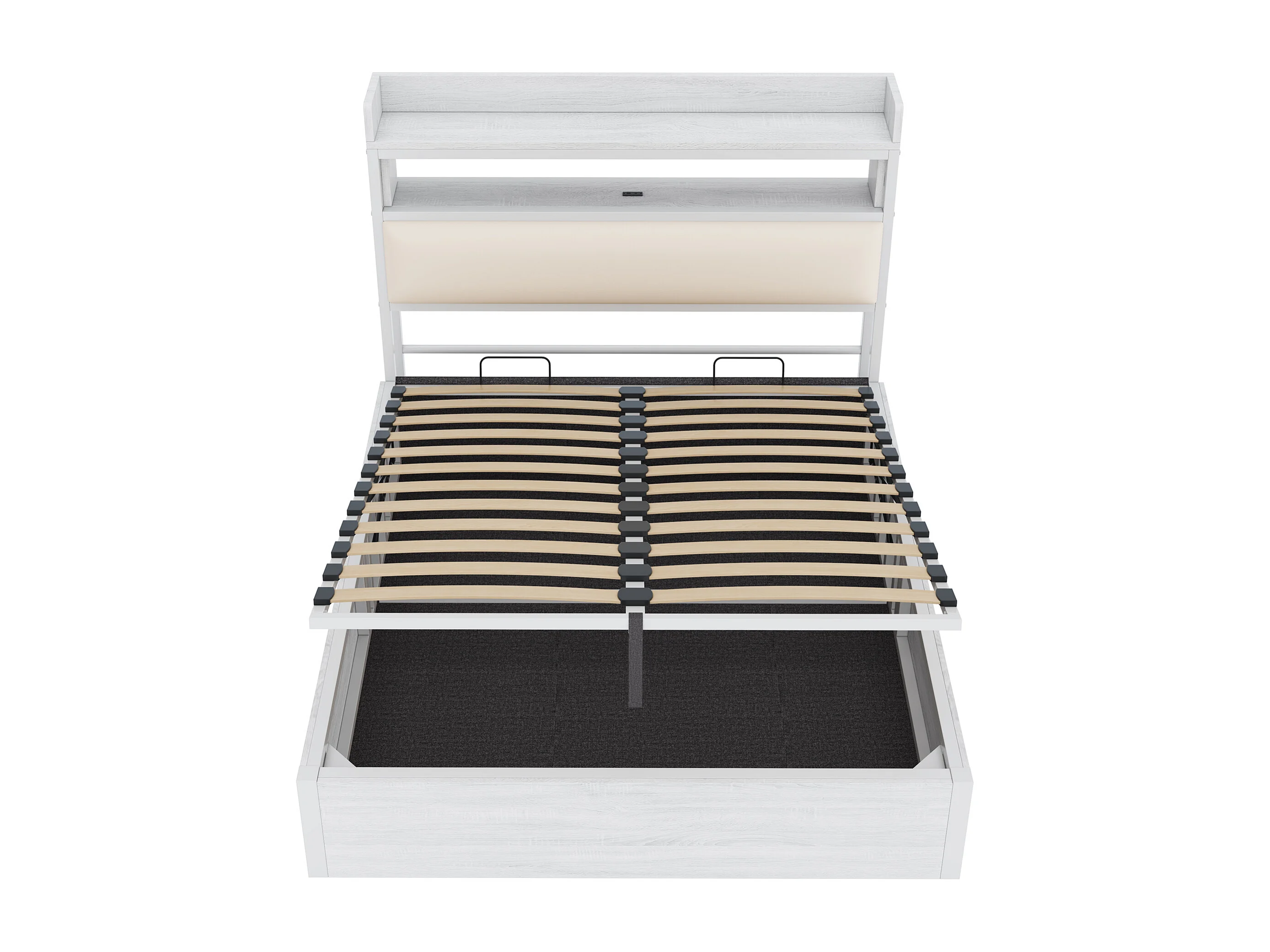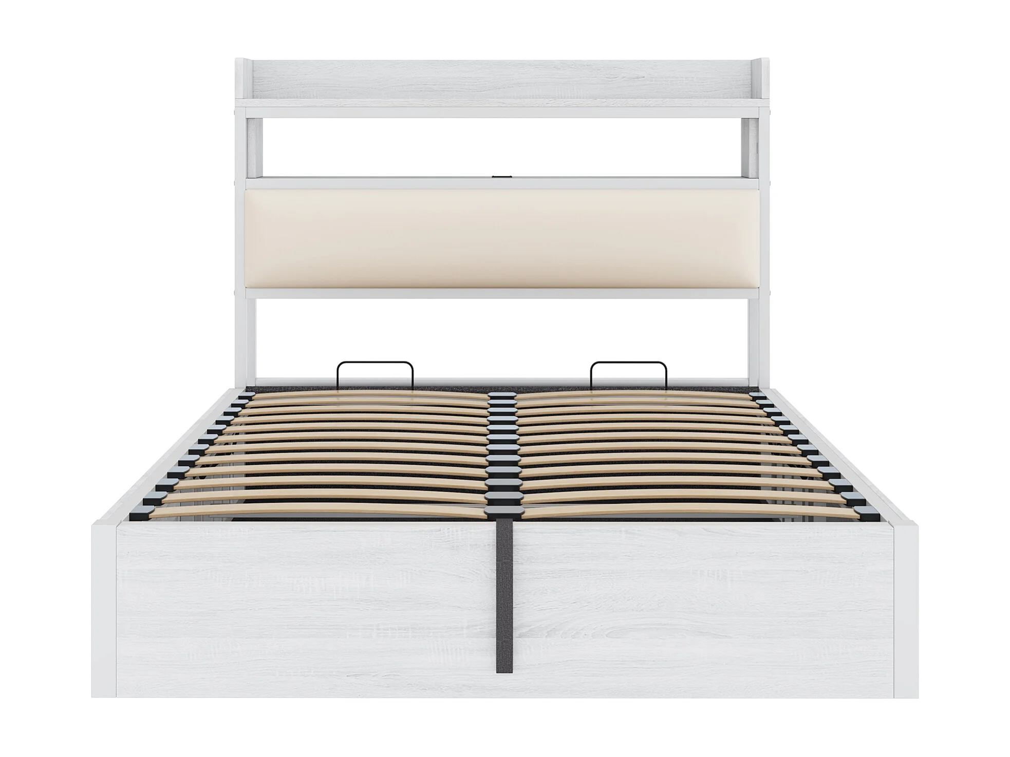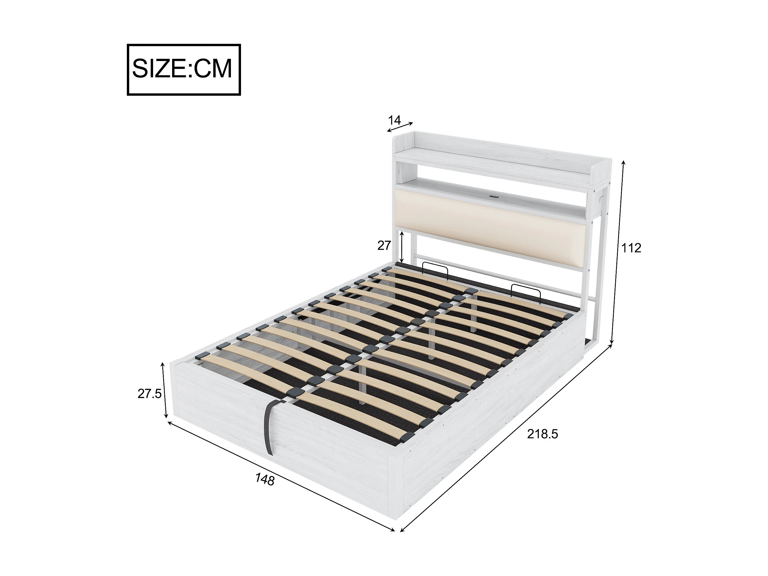 lit coffre double 140x200cm, tête de lit avec port USB, en MDF+ tissu+ métal blanc, sans matelas