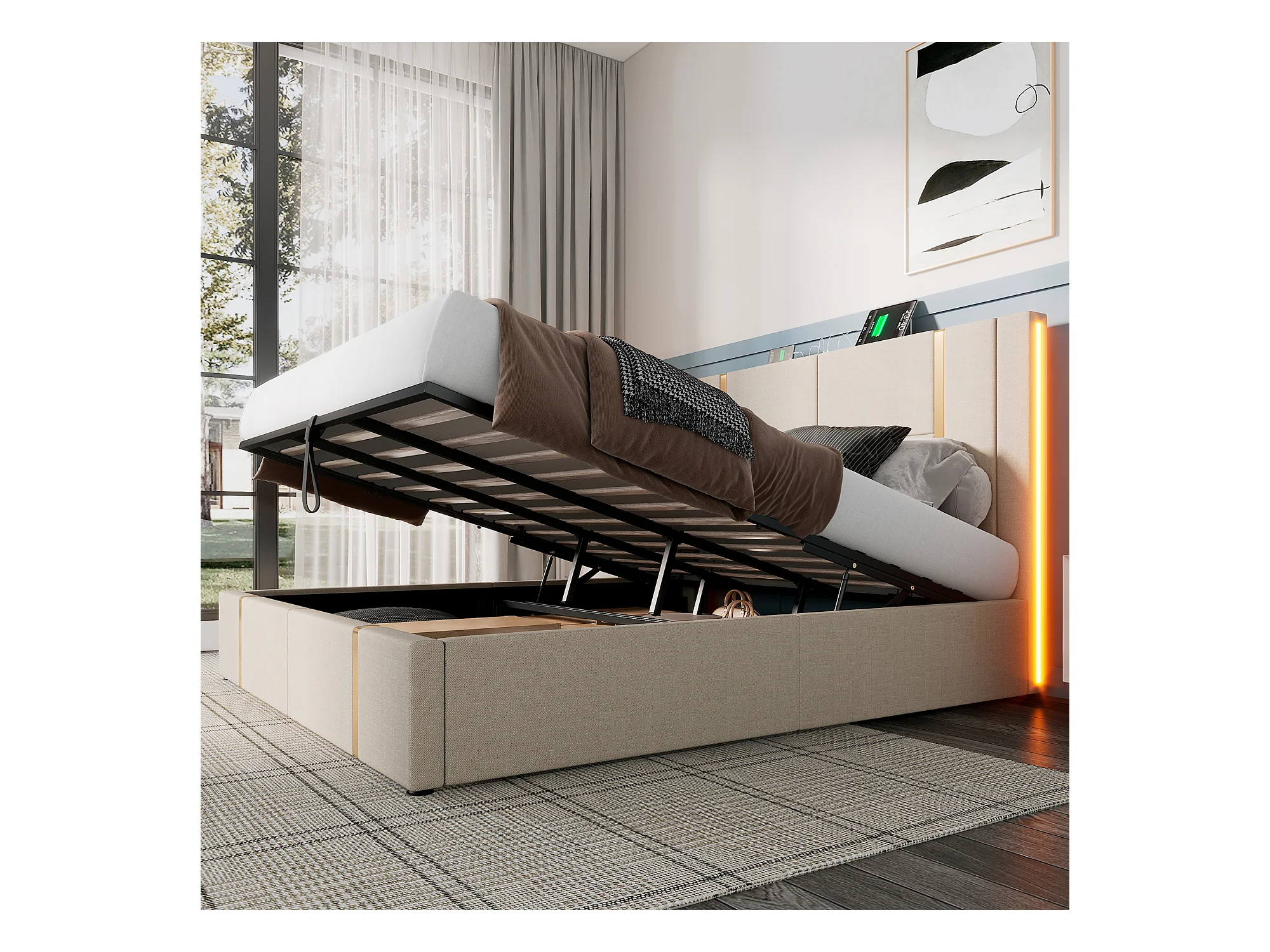 Lit coffre adulte 180x200 cm, Tête de lit avec LED et charge USB-C, Lin beige, sans matelas