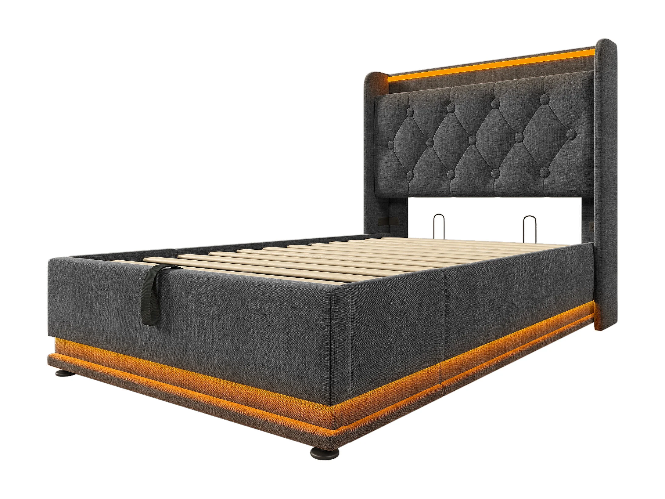 Lit enfant 90x200 cm avec rangement et lattes en bois - tête de lit avec USB et LED - lin gris - (sans matelas)