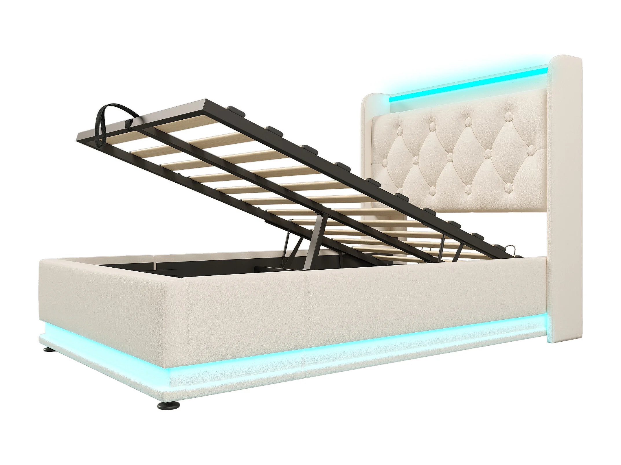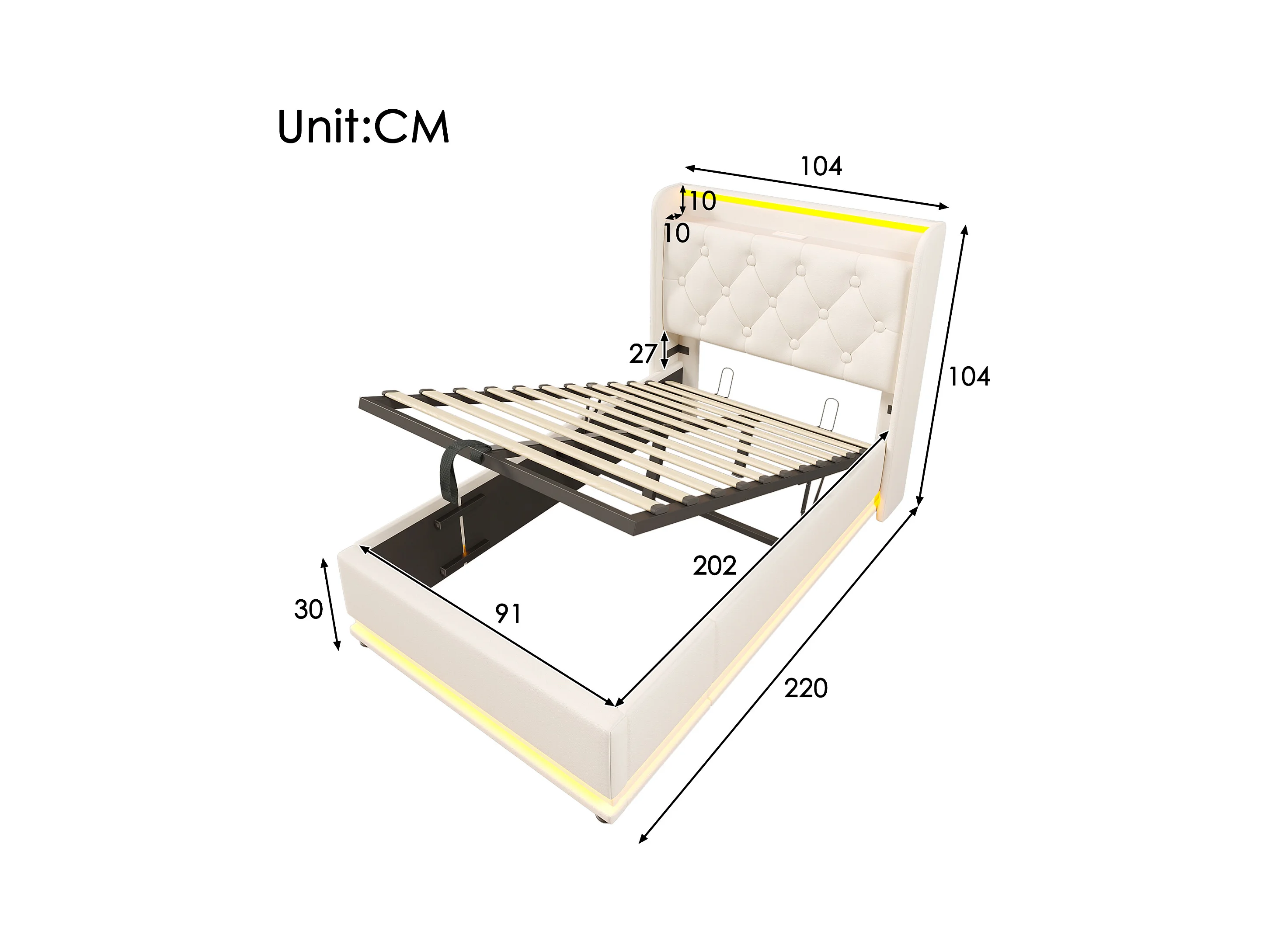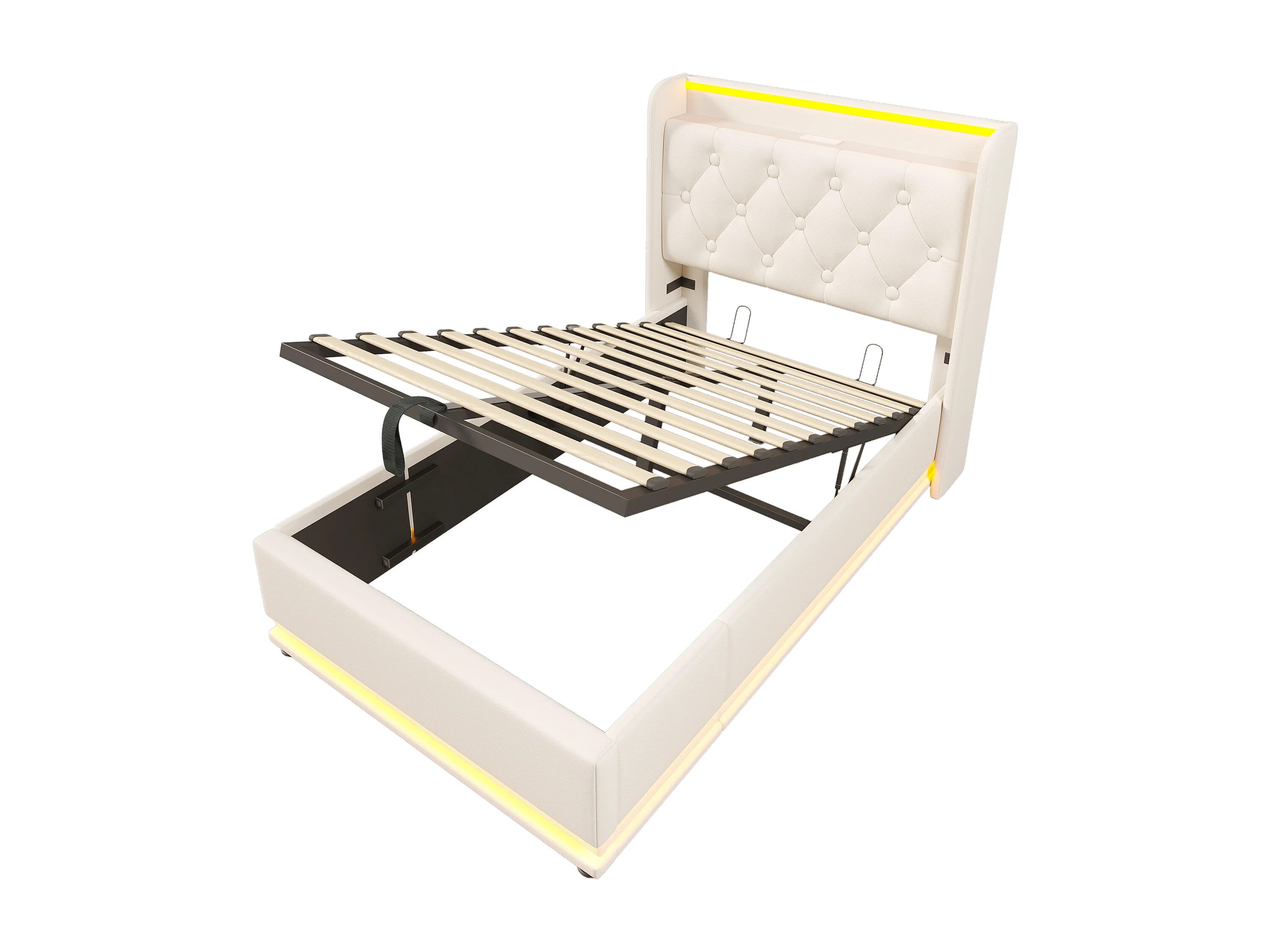 Lit coffre 90x200 cm avec sommier - tête de lit avec USB et LED - similicuir blanc - (sans matelas)