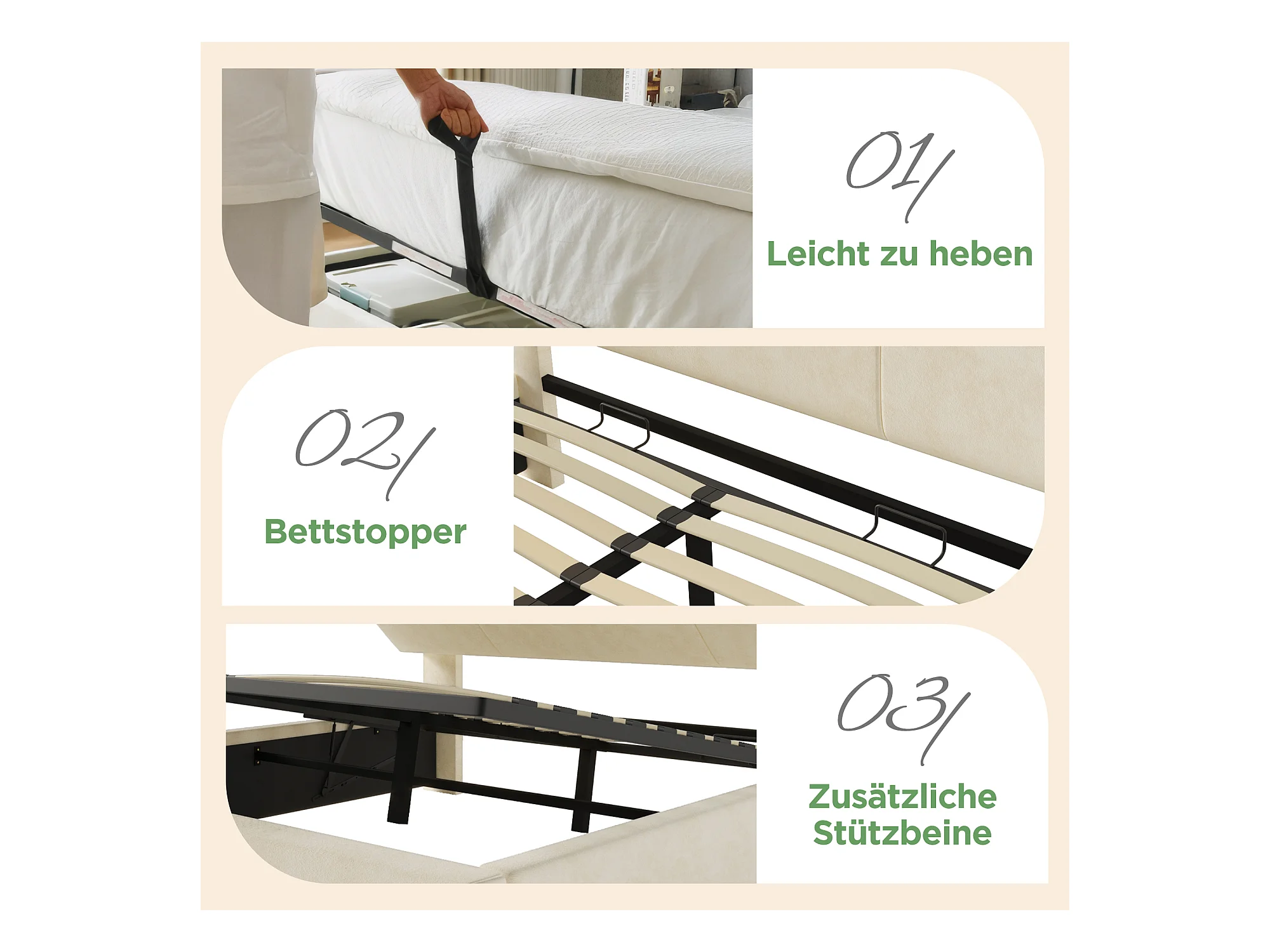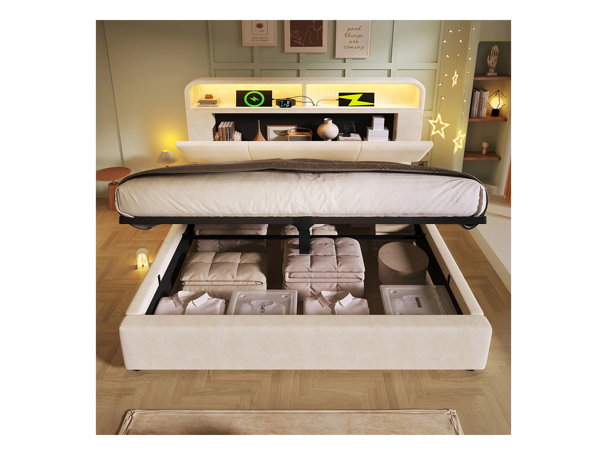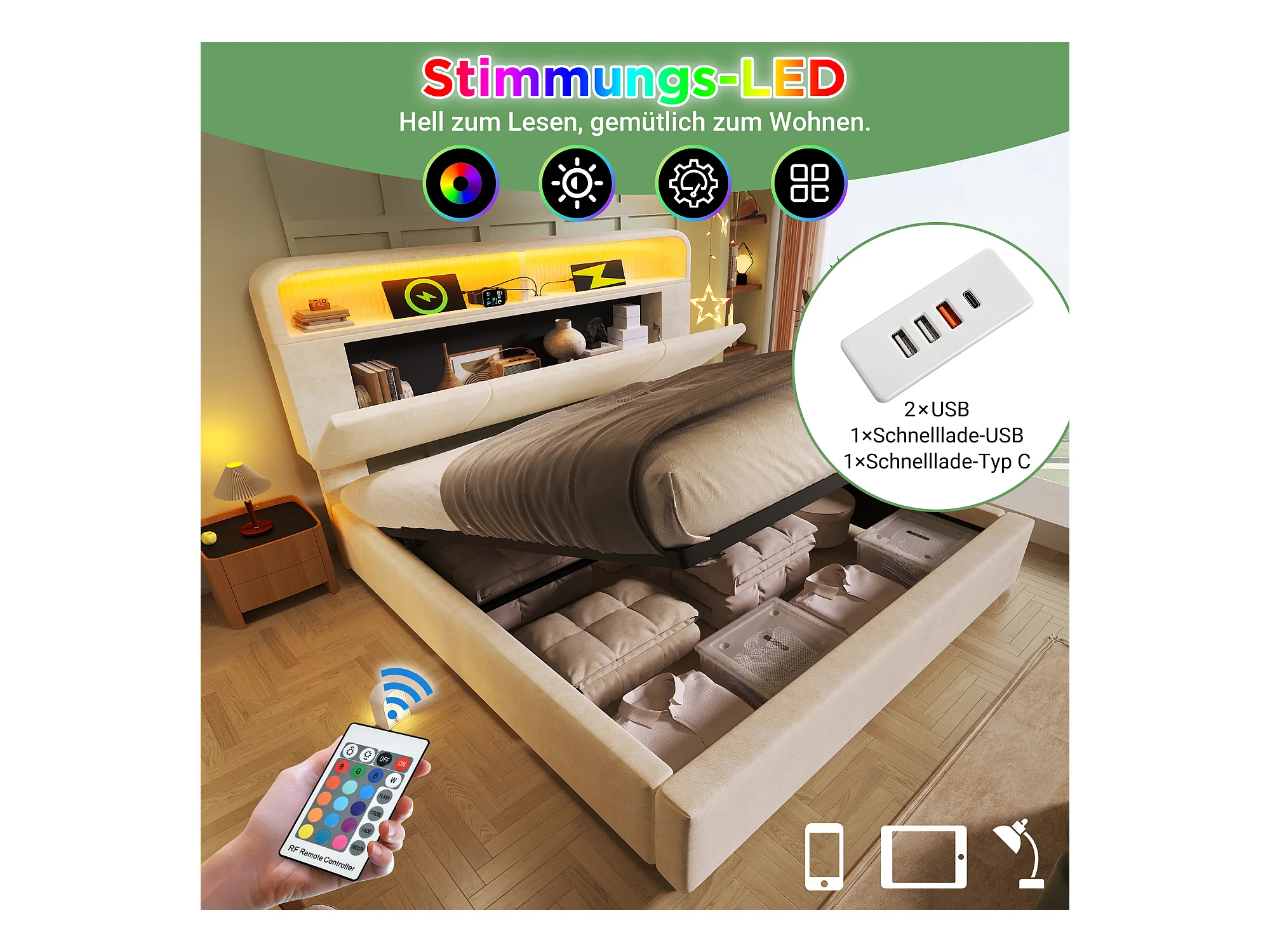 Lit coffre hydraulique - 160 x 200 cm - tête de lit réglable avec rangement - avec Leds + USB/Type-C - velours - beige