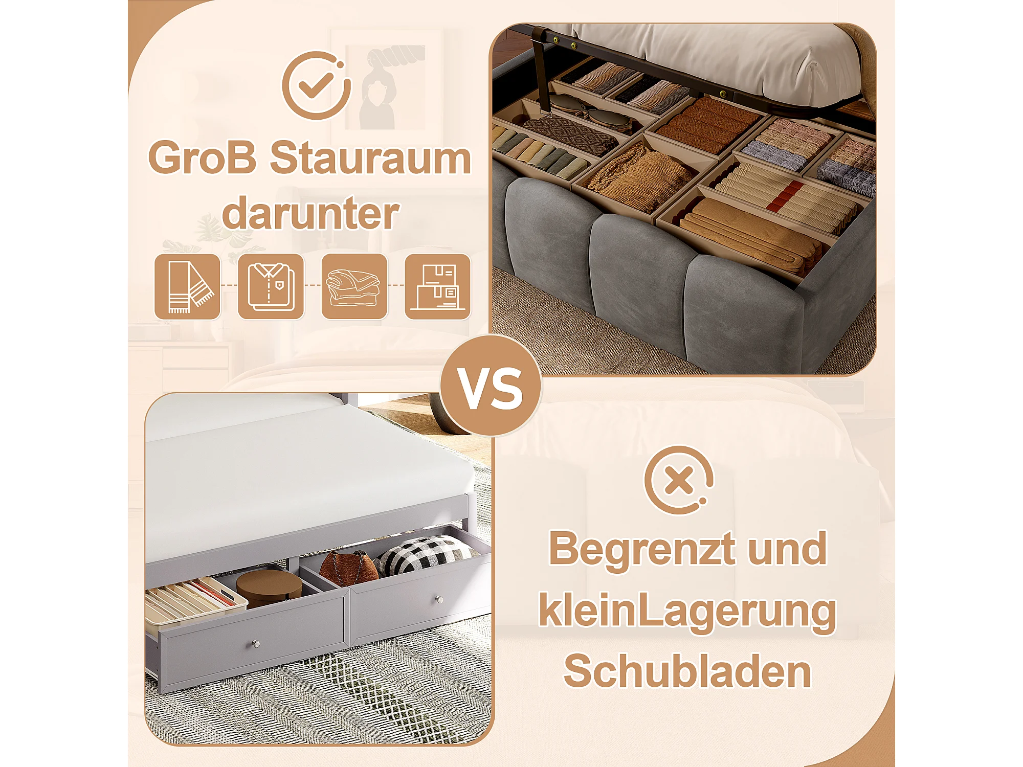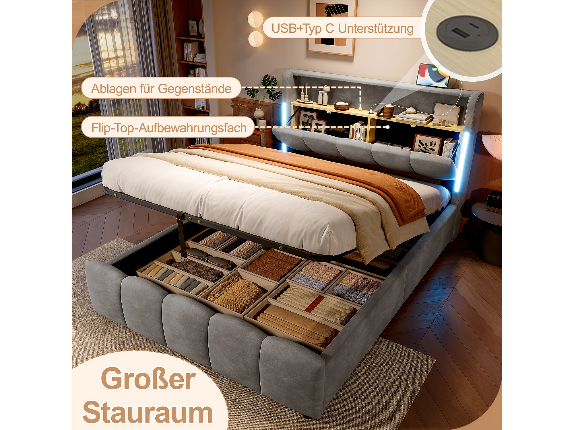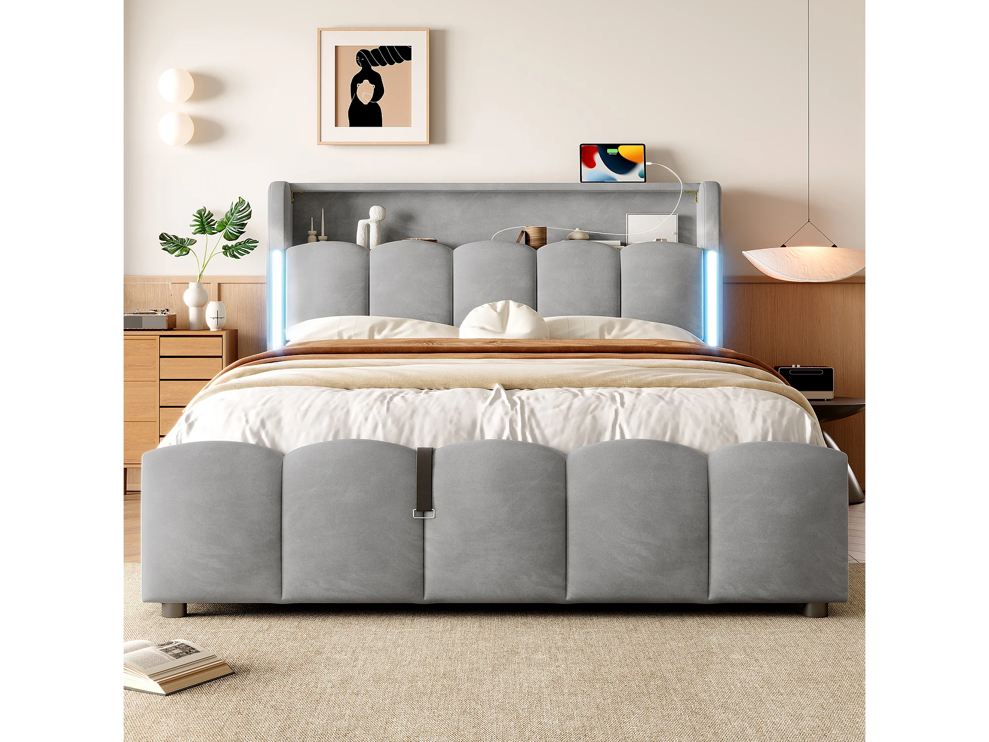 Lit coffre hydraulique rembourré - 140 x 200 cm - avec Leds + tête de lit avec rangements + avec USB /Type-C - velours - gris