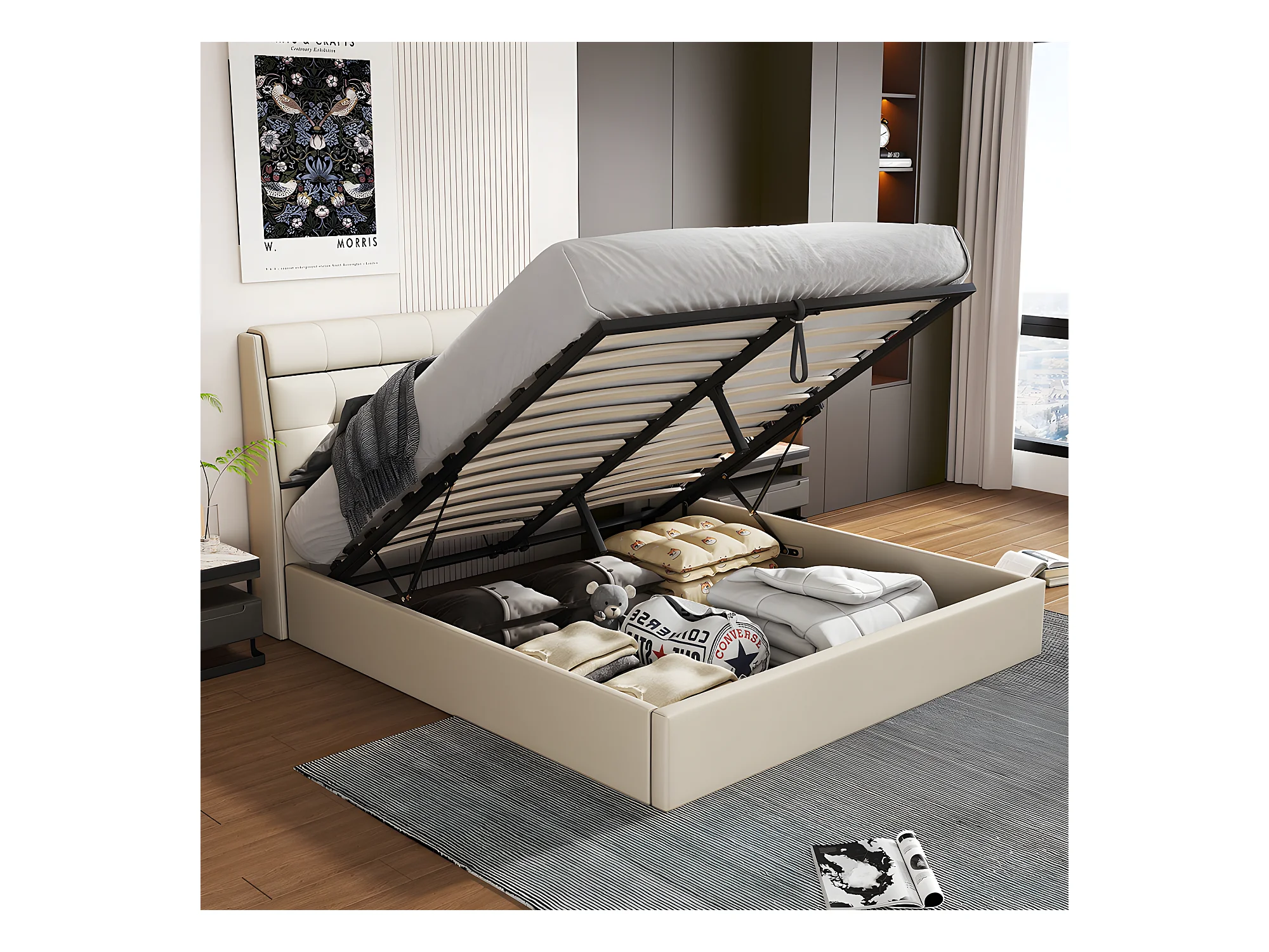 Lit coffre Lit 160x200 cm lit hydraulique rangement tête de lit caché avec sommier à lattes PU Beige