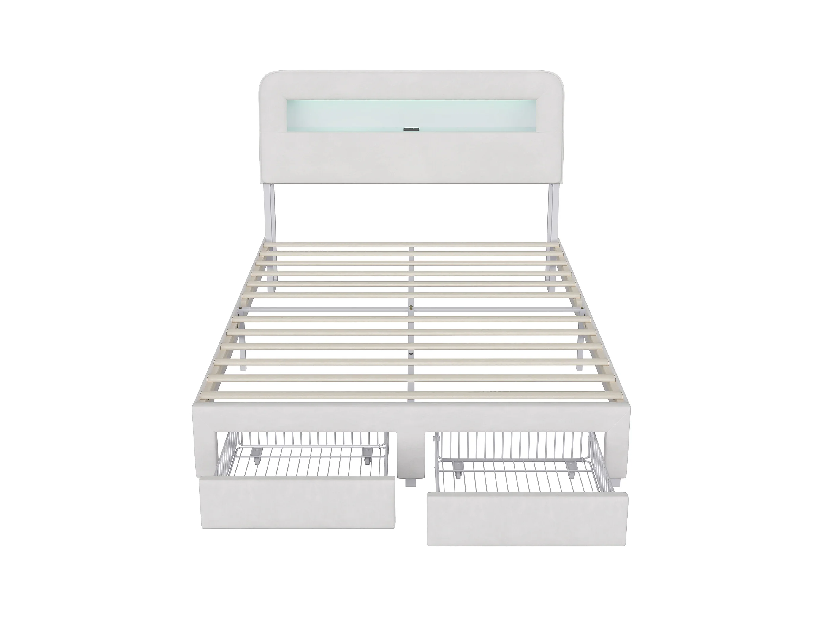 Lit coffre multifonction en velours avec LED, ports USB/Type-C, tête de lit avec rangements et 2 tiroirs, 140x200cm, Beige