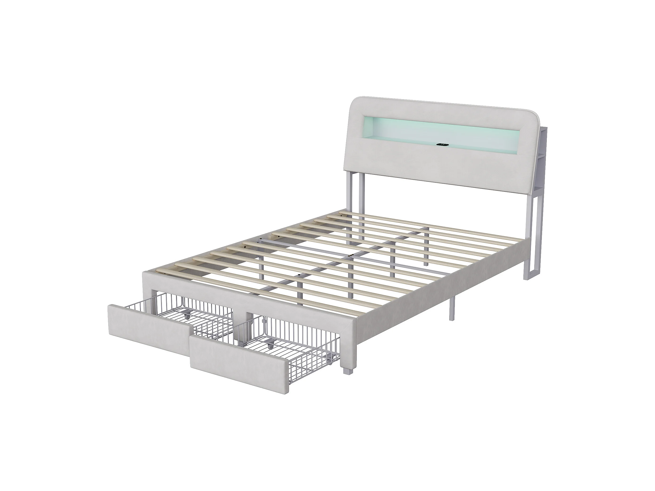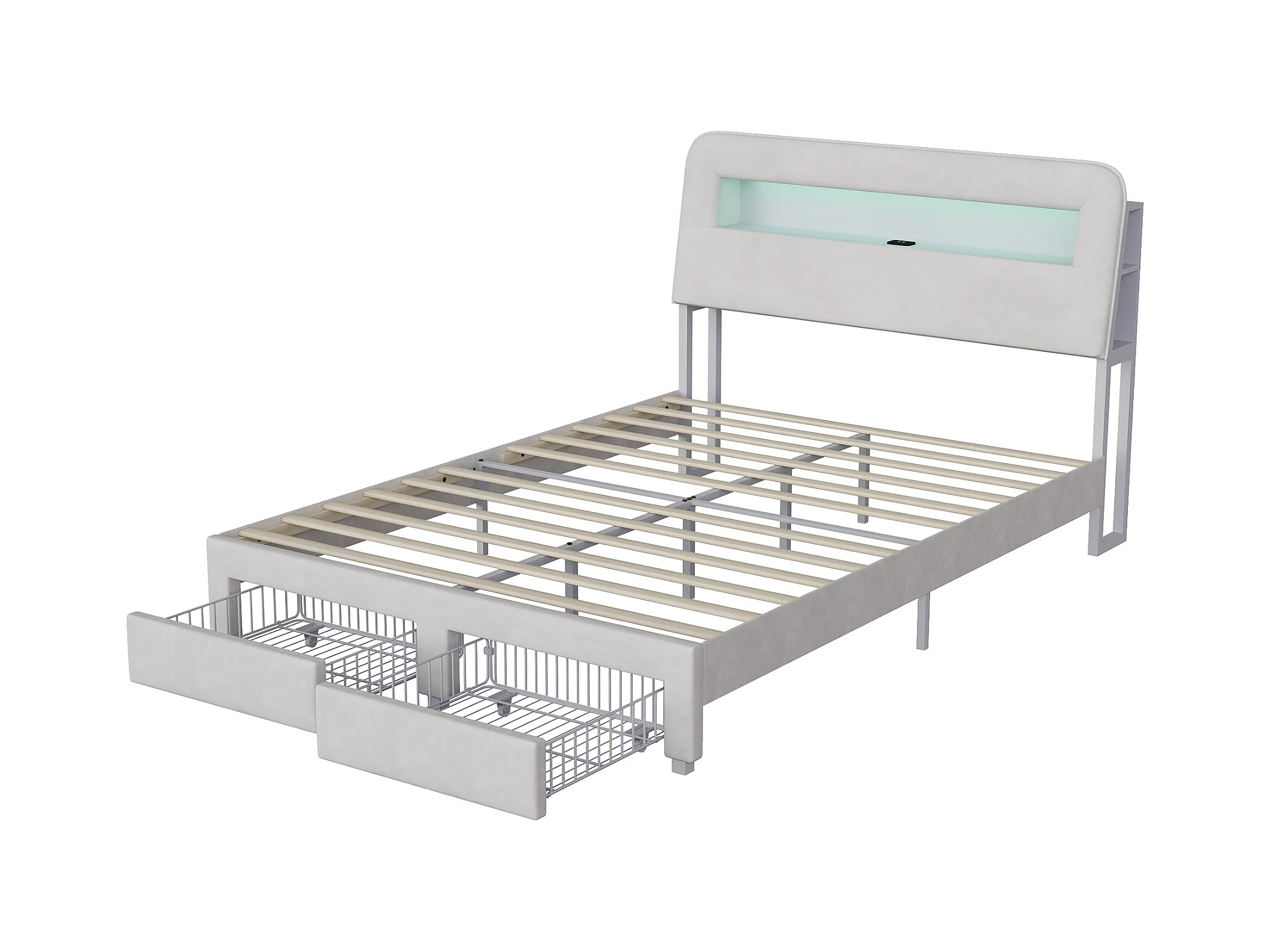 Lit coffre multifonction en velours avec LED, ports USB/Type-C, tête de lit avec rangements et 2 tiroirs, 160x200cm, Beige