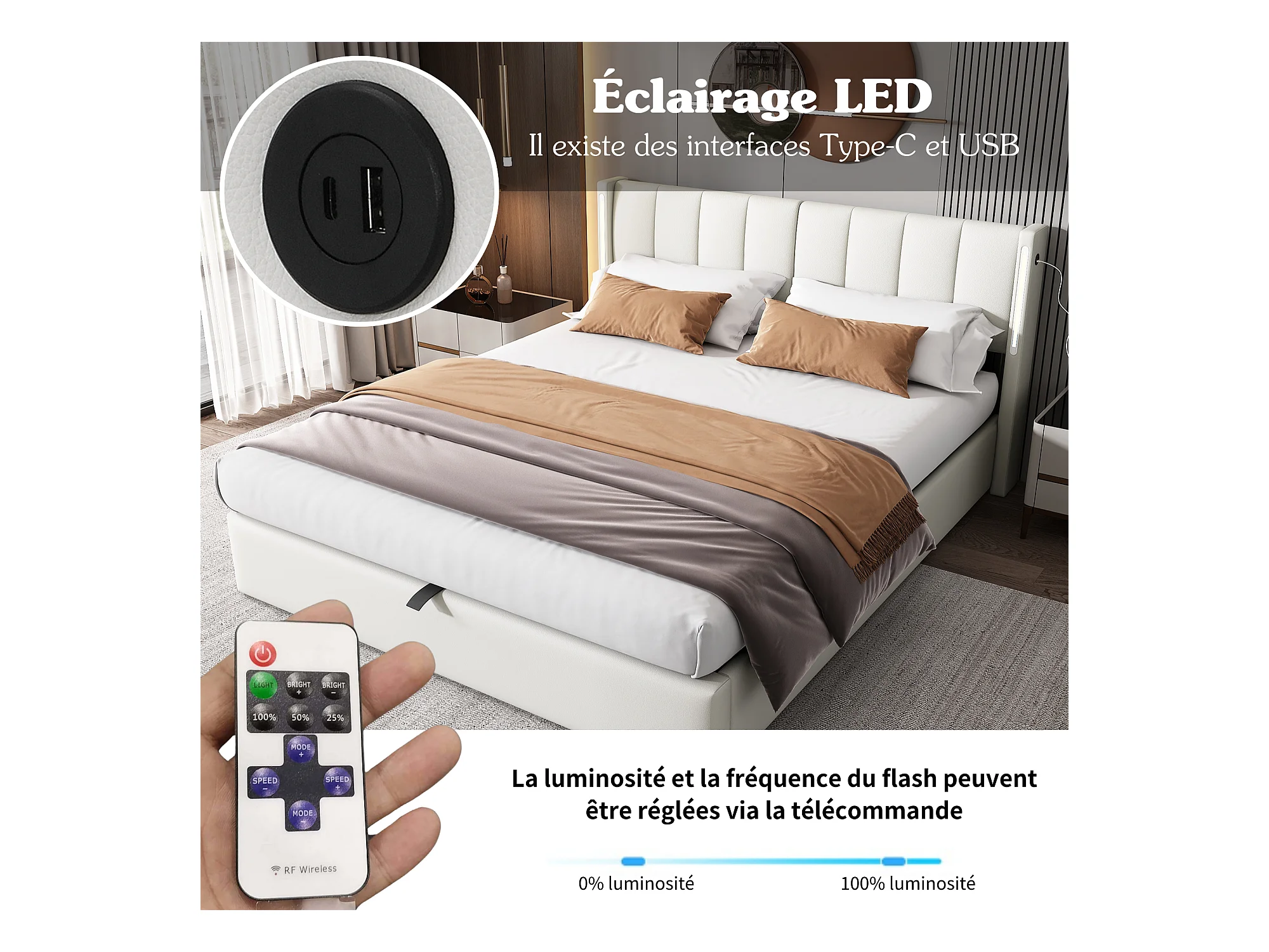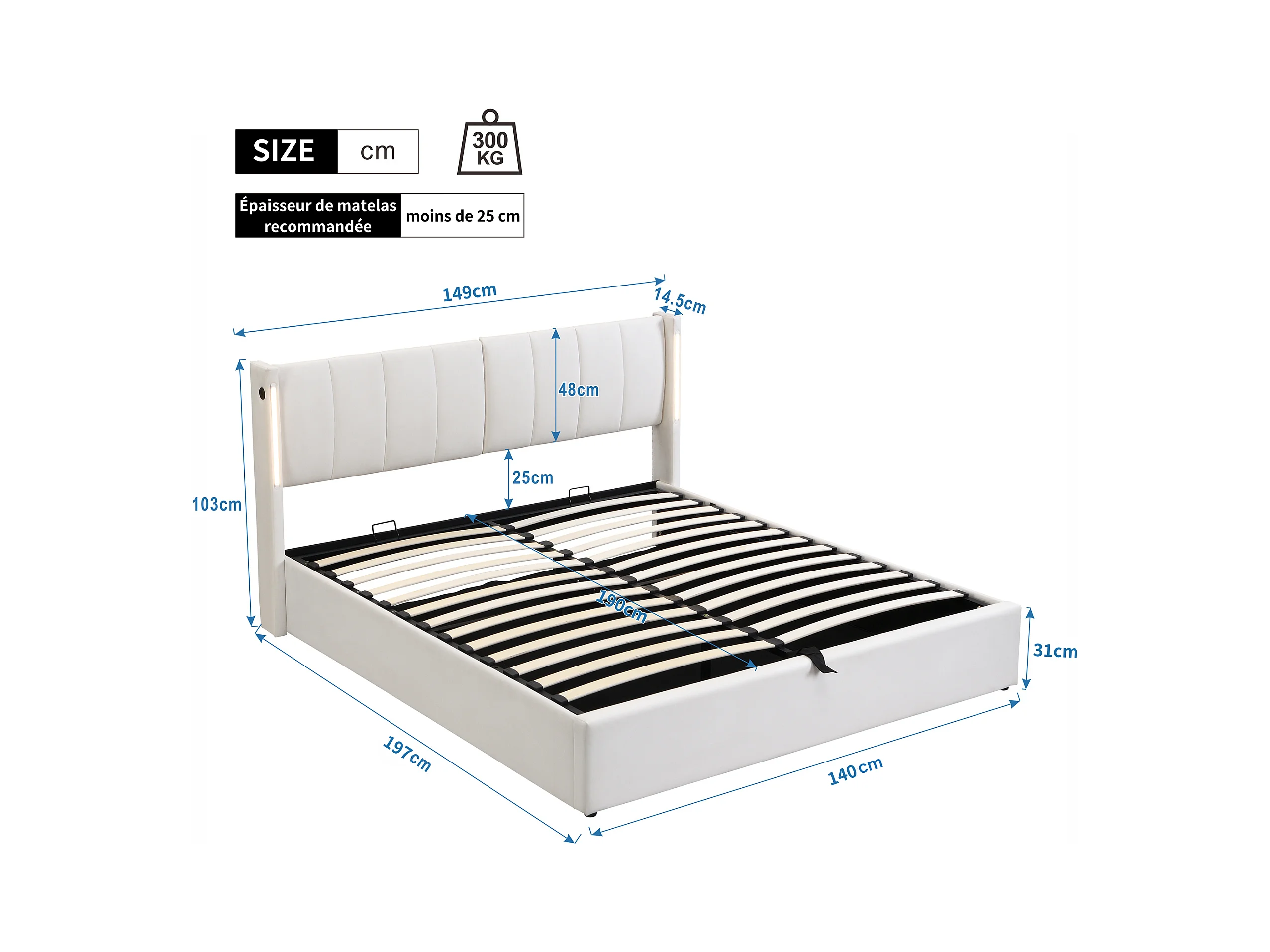 Lit coffre rembourré - 140 x 190 cm - avec port USB + Leds + tête de lit réglable - tissu PU - blanc