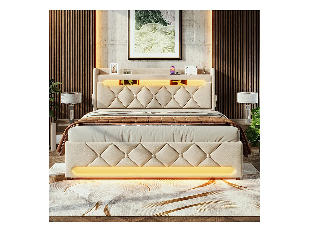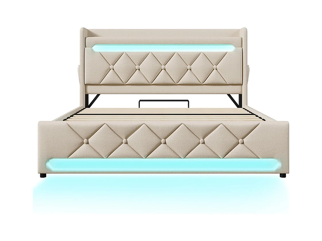 Lit coffre rembourré 140x200 avec LED 360° et ports USB & Type-C tête de lit avec rangement lin beige
