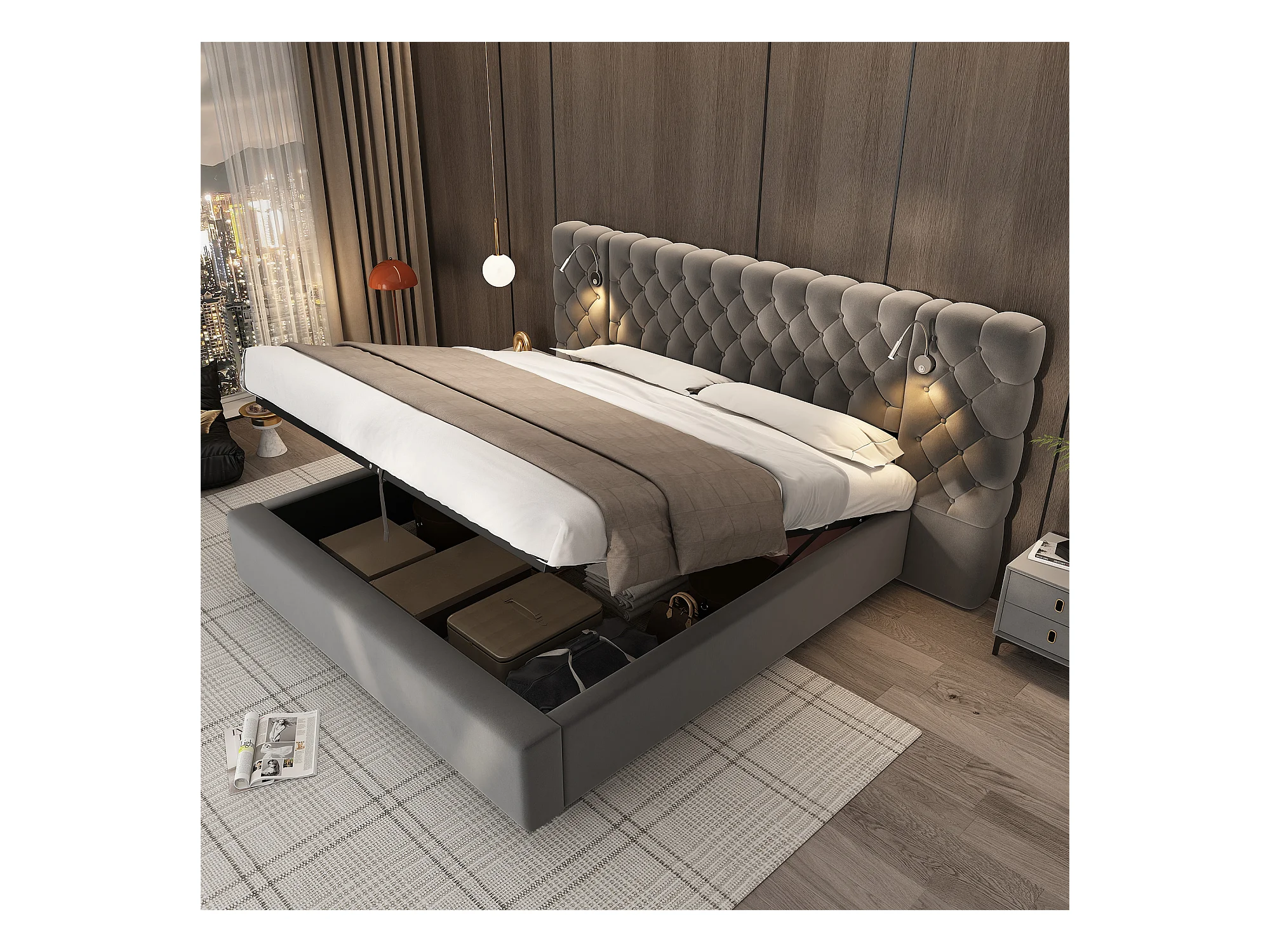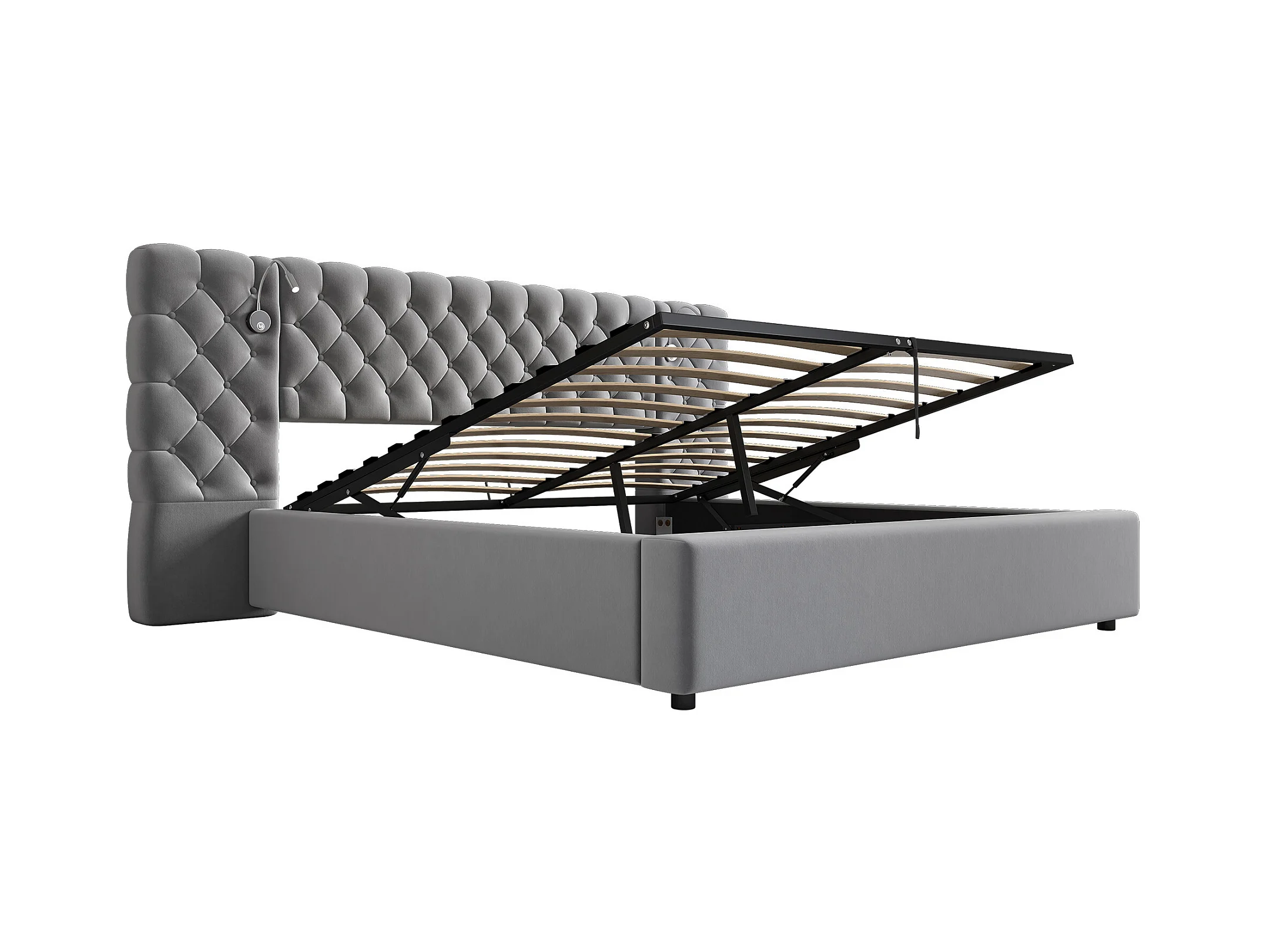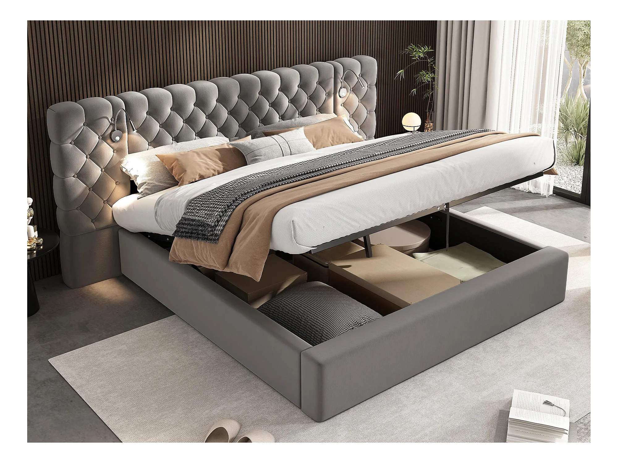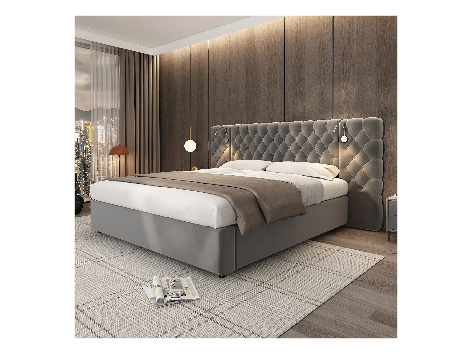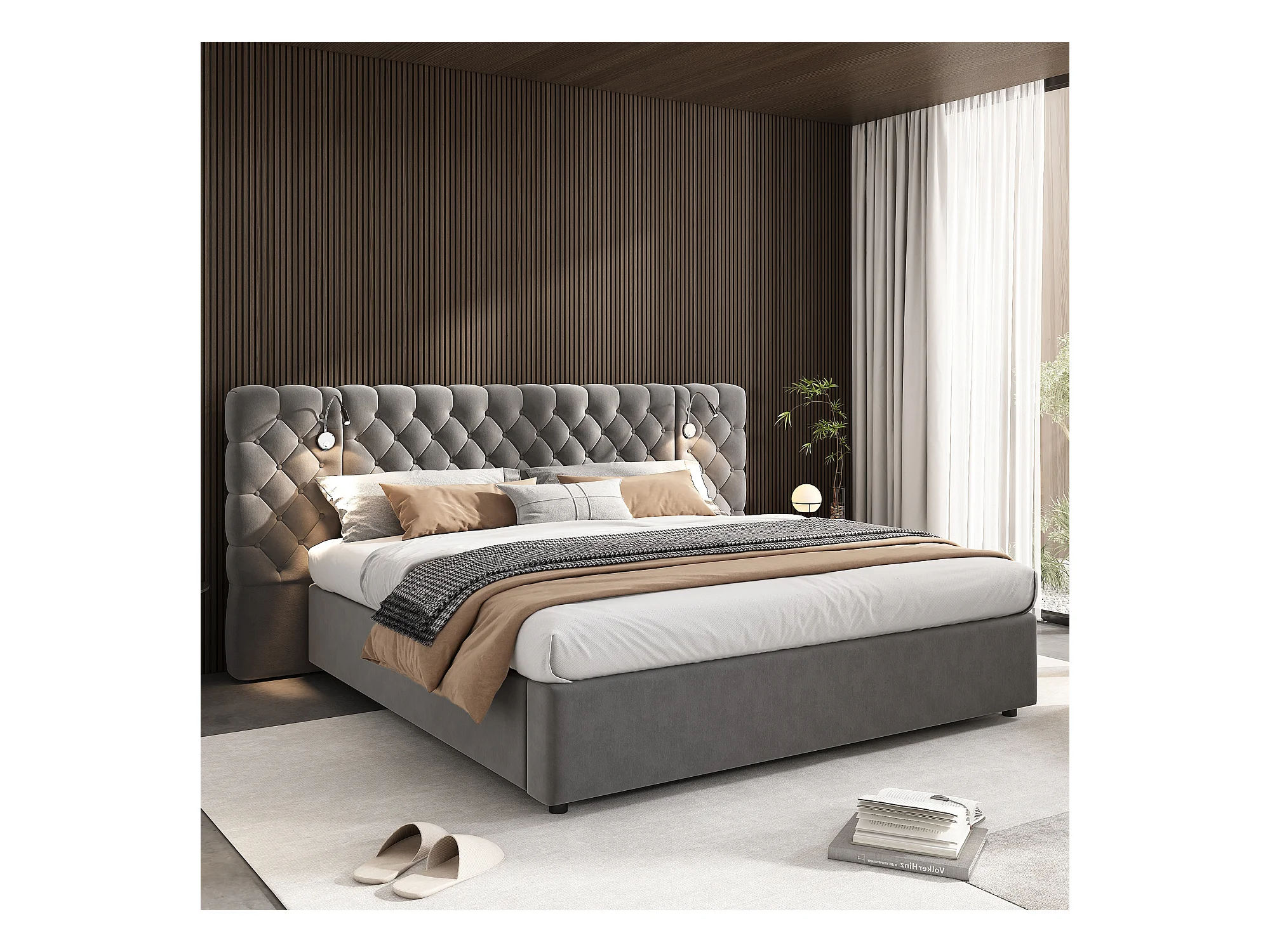 Lit coffre rembourré 160x200 cm en velours - avec lampe de lecture et sommier à lattes - Gris