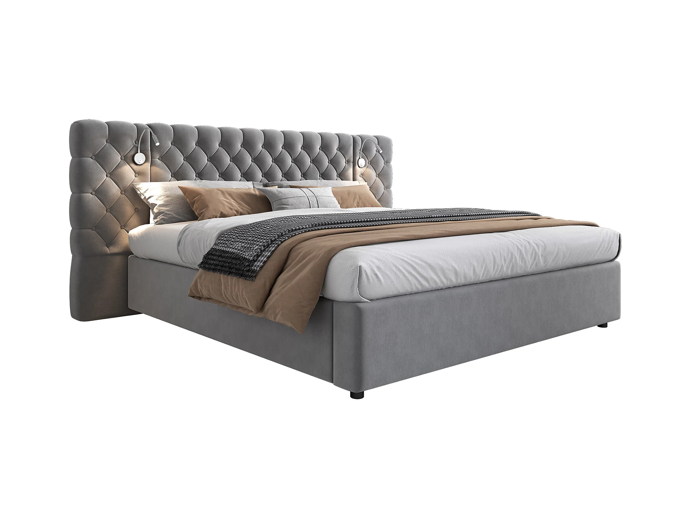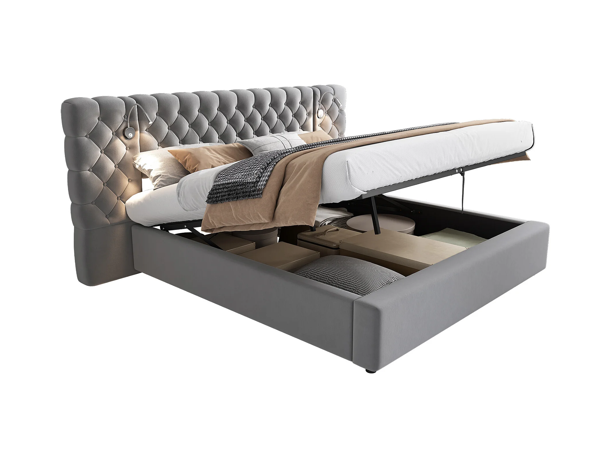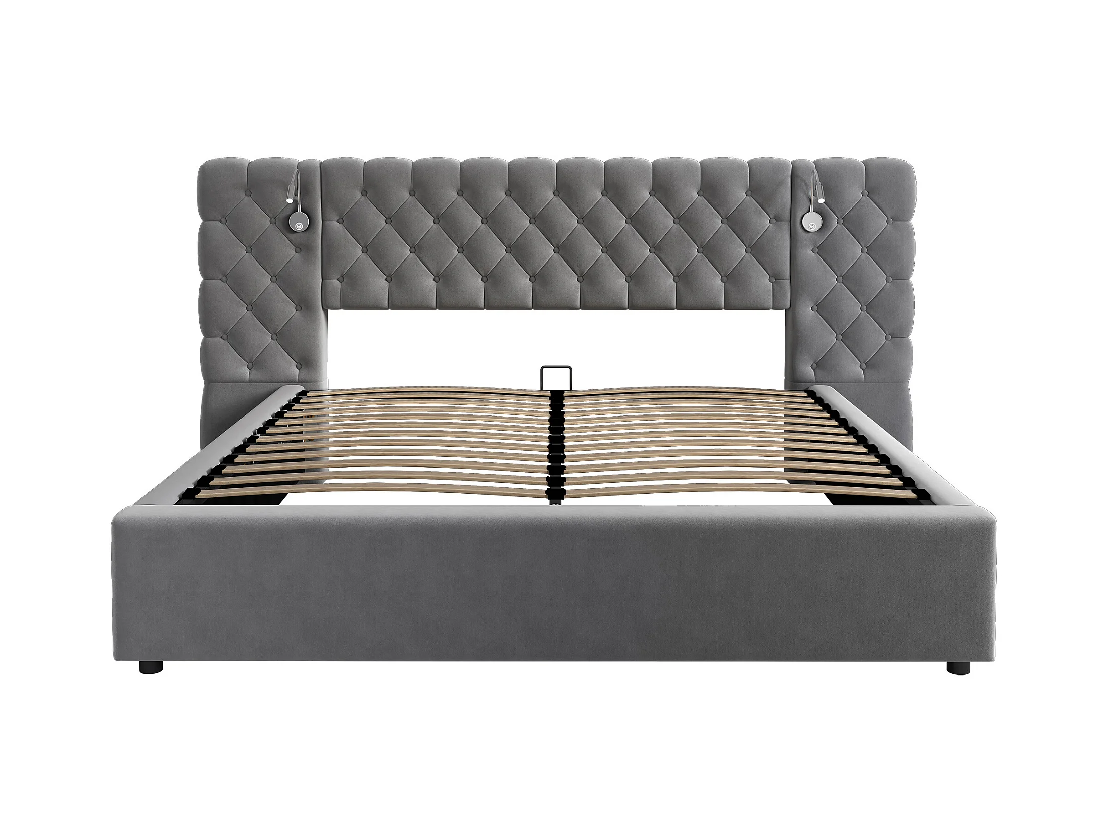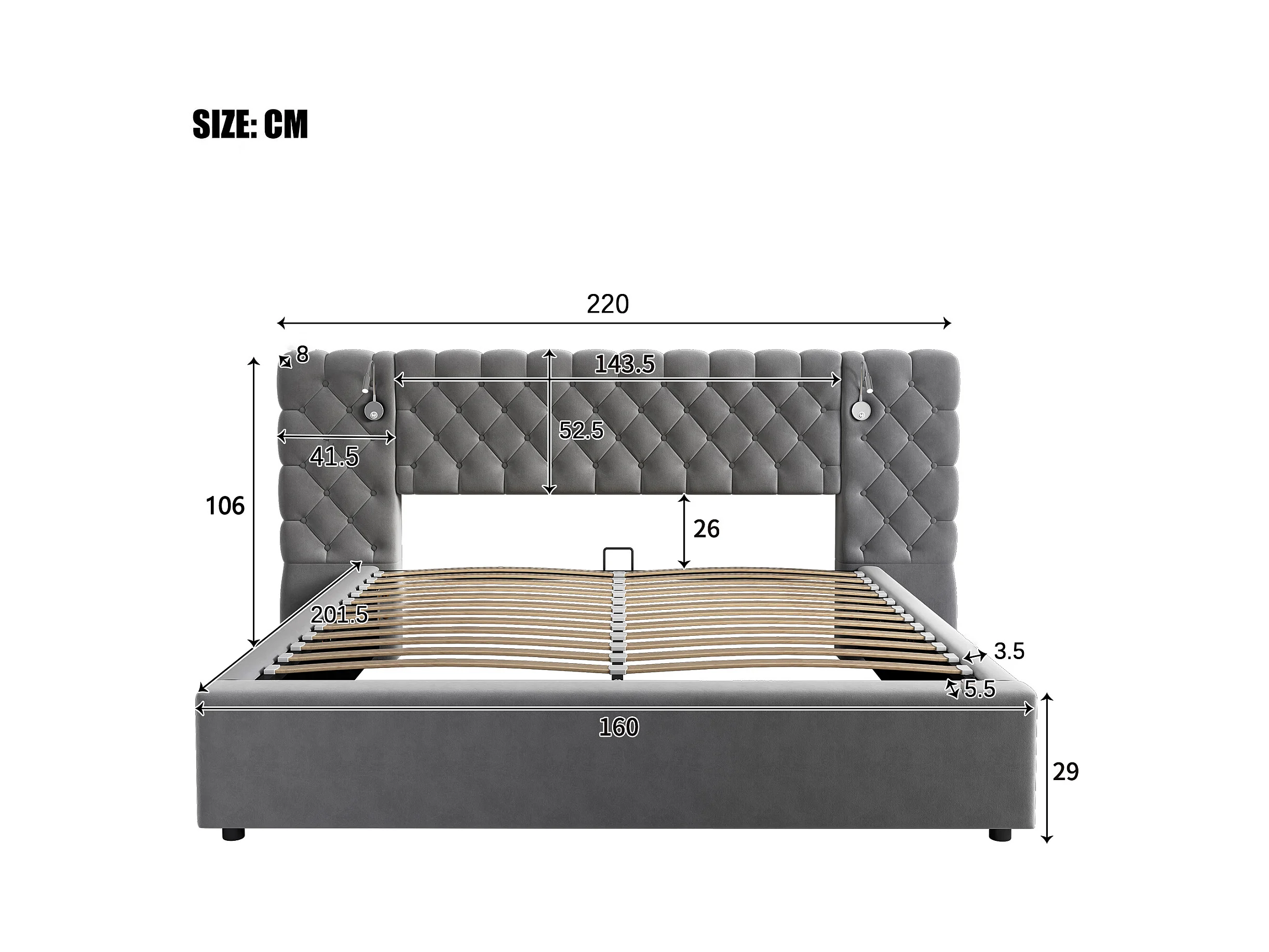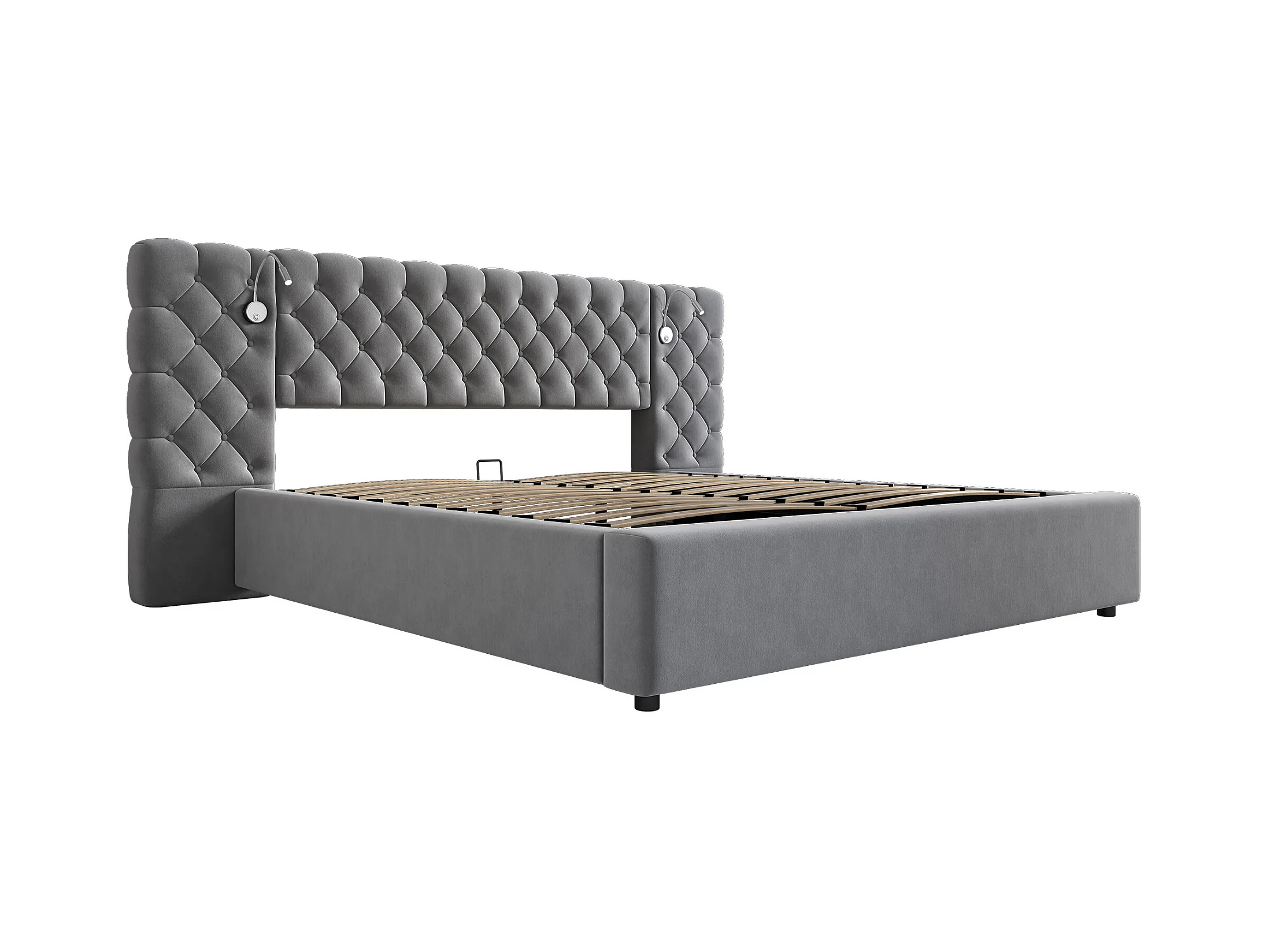 Lit coffre rembourré 160x200 cm en velours - avec lampe de lecture et sommier à lattes - Gris
