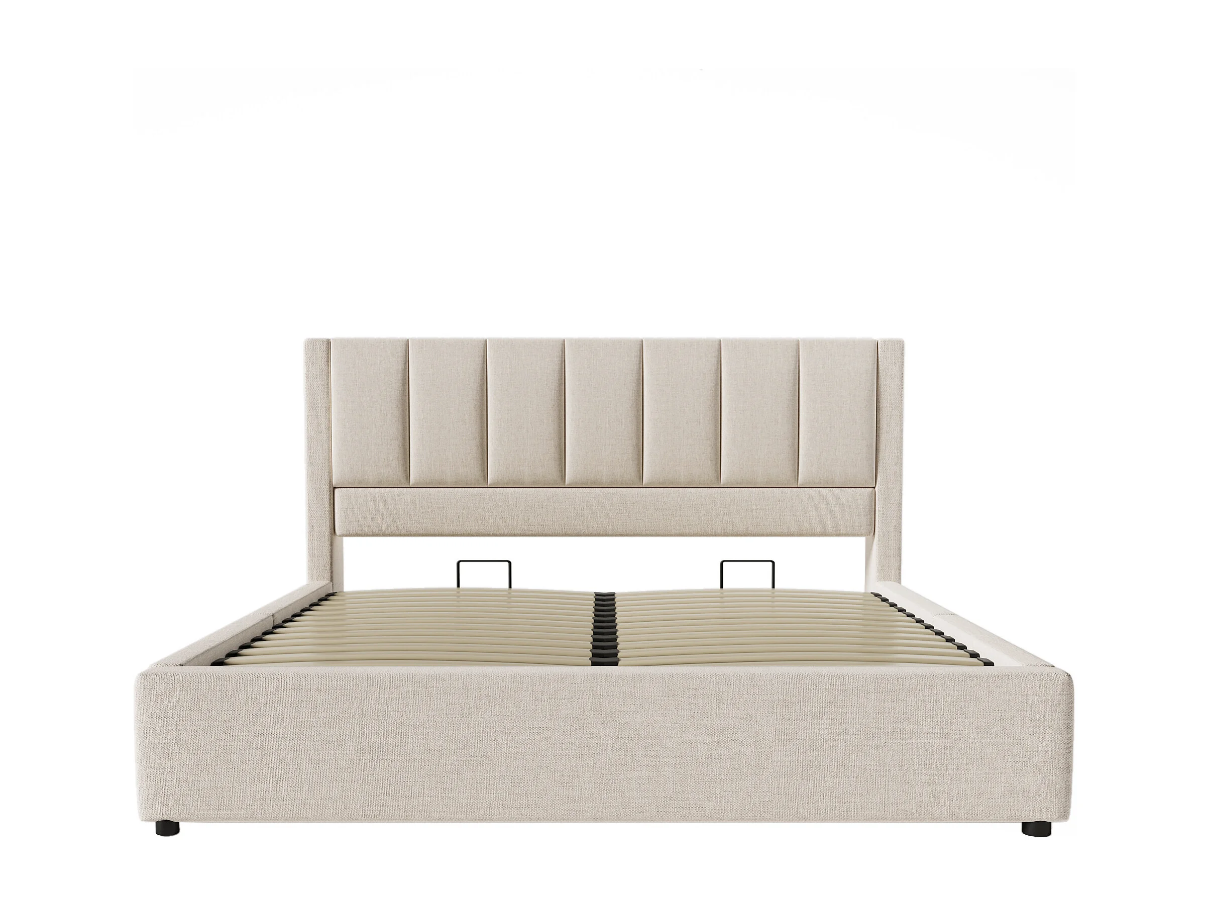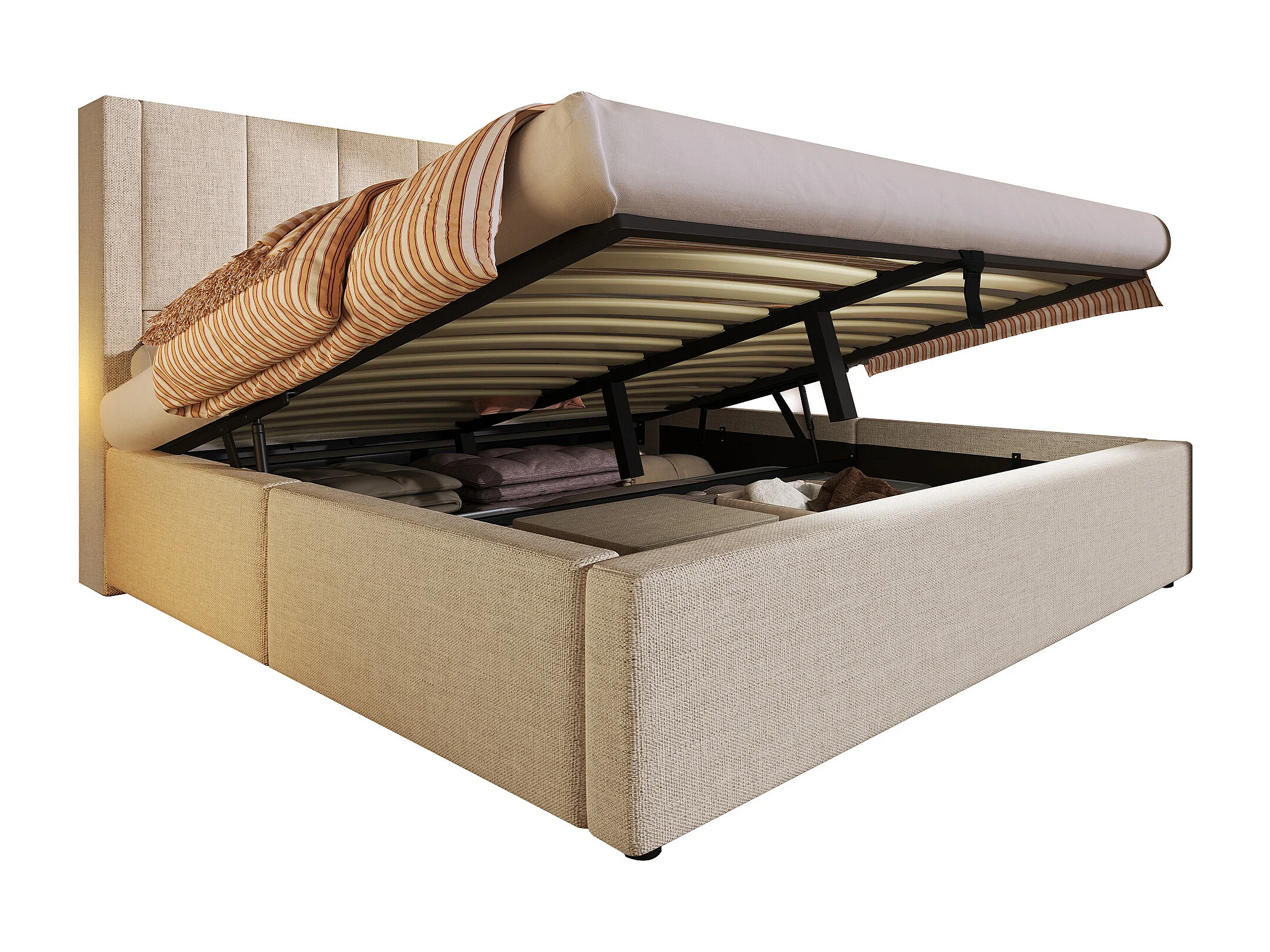 Lit coffre rembourré 160x200cm - avec porte-gobelet caché - avec ports USB et Type-C - avec sommier à lattes - Lin - Beige (sans matelas)
